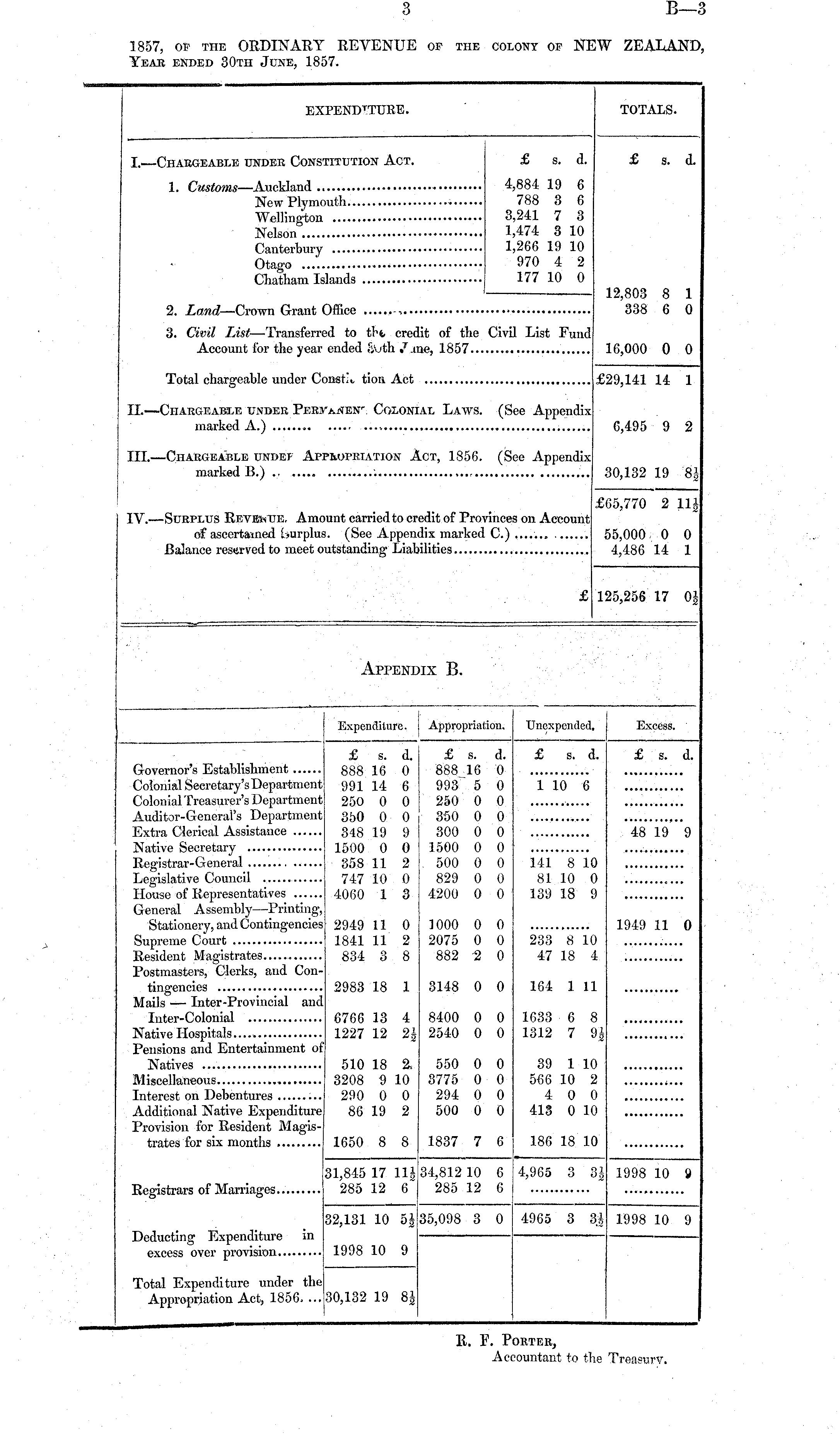 EXPEND T TURE. TOTALS. I.— Chargeable under Constitution Act. £ s. d. £ s, d. £ s. d. 1. Customs— Auckland 4,884 19 6 New Plymouth 788 3 6 Wellington 3,241 7 3 Nelson 1,474 3 10 Canterbury • 1,266 19 10 Otago 970 4 2 Chatham Islands 177 10 0 4,684 19 6 788 3 6 3,241 7 3 1,474 3 10 1,266 19 10 970 4 2 177 10 0 2. Land —Crown Grant Office ......-, 12,803 338 8 6 1 0 3. Civil List —Transferred to tbfc credit of the Civil List Fund Account for the year ended fioth /.me, 1857 16,000 0 0 Total chargeable under Const!., tion Act £29,141 14 1 II.— Chargeable under Perjtanen', Colonial Laws. (See Appendix marked A.) ...» 6,495 9 2 III.—Chargeable undef Appropriation Act, 1856. (See Appendix marked B.) ....:. , 30,132 19 82 IV.—Surplus Revenue. Amount carried to credit of Provinces on Account of ascertained Surplus. (See Appendix marked C.) Balance reserved to meet outstanding Liabilities £65,770 2 11J 55,000 0 0 4,486 14 1 £ 125,256 17 0i Apfendix B. Expenditure. Appropriation. Unexpended, Excess. £ s. d. 888 16 0 991 14 6 250 0 0 350 0 0 348 19 9 1500 0 0 358 11 2 747 10 0 4060 1 3 £ s. 888 16 993 5 250 0 350 0 300 0 1500 0 . 500 0 829 0 4200 0 d. 0 0 0 0 0 0 0 0 0 £ s. d. £ s. d. Governor's Establishment Colonial Secretary's Department Colonial Treasurer's Department Auditor-General's Department Extra Clerical Assistance Native Secretary Registrar-General Legislative Council House of Representatives General Assembly —Printing, Stationery, and Contingencies Supreme Court Resident M agistrates Postmasters, Clerks, and Contingencies Mails — Inter-Provincial and Inter-Colonial Native Hospitals..... Pensions and Entertainment of Natives Miscellaneous Interest on Debentures Additional Native Expenditure Provision for Resident Magistrates for six months 2949 11 0 1841 11 2 834 3 8 1000 0 2075 0 882 '2 0 0 0 1 10 6 141 8 10 81 10 0 139 18 9 233 8 10 47 18 4 48 19 9 1949 11 0 2983 18 1 3148 0 0 164 1 11 6766 13 4 1227 12 2| 8400 0 2540 0 0 0 1633 6 8 1312 7 9i 510 18 2 3208 9 10 290 0 0 86 19 2 550 0 3775 0 294 0 500 0 0 0 0 0 39 1 10 566 10 2 4 0 0 413 0 10 1650 8 8 1837 7 6 186 18 10 Registrars of Marriages 31,845 17 11J 285 12 6 34,812 10 285 12 6 6 4,965 3 3| 1998 10 a Deducting Expenditure in excess over provision 32,131 10 5J 1998 10 9 35,098 3 0 4965 3 3.4 1998 10 9 Total Expenditure under the Appropriation Act, 1856. ... 30,132 19 8| R. P. P 3RTER, •ountant to the Treasury. Ac