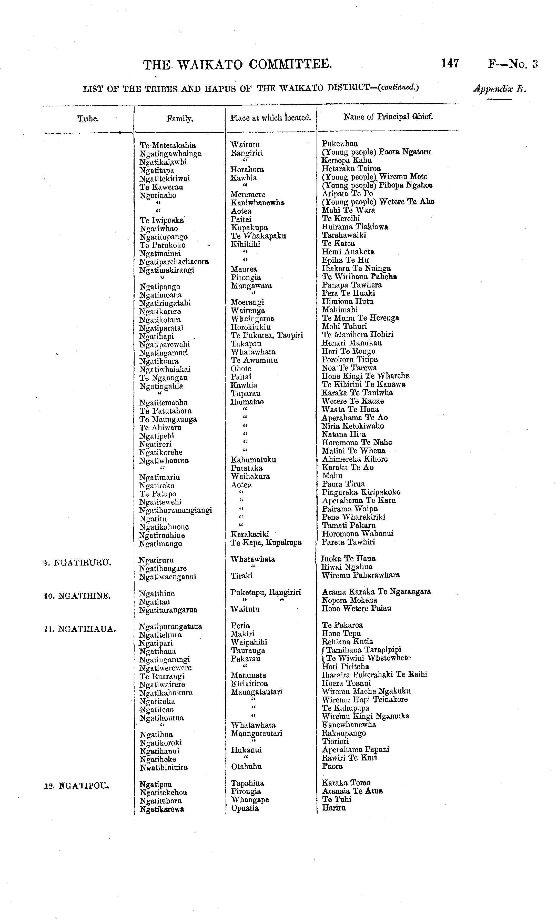 Tribe. Family. Place at which located. Name of Principal Ghief. Te Matetakahia Ngatingawhainga Ngatikaicawhi Ngatitapa Ngatitekiriwai Te Kawerau Ngatinaho ii Waitutu Rangiriri it Horahora Kawhia a Pukewhau (Young people) Paora Ngataru Kereopa Kahu Hetaraka Tairoa (Young people). Wiremu Mete (Young people) Pihopa Ngahoe Aripata Te Po (Young people) Wetere Te Aho Mohi Te Wara Te Kereihi Huirama Tiakiawa Tarahawaiki Te Katea Hemi Anaketa Epiha Te Hu Ihakara Te Nuinga Te Wirihana Pahoh* Panapa Tawhera Pera Te Huaki Himiona Hutu Mahimahi Te Munu Te Herenga Mohi Tahuri Te Manihera Hohiri Henari Manukau Hori Te Rongo Forokoru Titipa Noa Te Tarewa Hone Kingi Te Wharehu Te Kihirini To Kanawa Karaka Te Taniwha Wetere Te Kauae Waata Te Hana Aperahama Te Ao Niria Ketokiwaho Natana Hira Horomona Te Naho Matini Te Wheua Ahimereka Kihoro Karaka Te Ao Mahu Paora Tirua Pingareka Kiripakoko Aperahama Te Kara Pairama Waipa Pene Wharekiriki Tamati Pakaru Horomona Wahanui Pareta Tawhiri a Te Iwipoaka Ngatiwhao Ngatitupango Te Patukoko Ngatinainai Ngatiparehaehaeora Ngatimakirangi a Meremere Kaniwhanewha Aotea Faitai Kupakupa Te Whakapaku Kihikihi tt a Maurea Pirongia Mangawara .1 Ngatipango Ngatimoana Ngatiringatahi Ngatikarere Ngatikotara Ngatiparatai Ngatihapi Ngatiparewehi Ngatingamuri Ngatikoura Ngatiwhaiakai Te Ngaungau Ngatingahia u Moerangi Wairenga Whaingaroa Horokiukiu Te Pukatea, Taupiii Takapau Whatawhata Te Awamutu Ohote Paitai Kawhia Tuparau Ihumatao tt Ngatifemaoho Te Patutahora Te Maungaunga Te Ahiwaru Ngatipehi Ngatirori Ngatikorehe Ngatiwhauroa it a a a a a Ngatimariu Ngatireko Te Patupo Ngatitewehi Ngatihurumangiangi Ngatitu Ngatikahuone Ngatiruahine Ngatimango Kahumatuku Putataka Waihekura Aotea it it a a a Karakariki To Kapa, Kupakupa 9. NGATIRURTJ. Ngatiruru Ngatihangare Ngatiwaenganni Whatawhata it Inoka Te Haua Riwai Ngahua Wiremu Paharawhara Tiraki 10. NGATIHINE. Ngatihine Ngatitau Ngatiturangarua Puketapu, Kangiriri ii ii Arama Karaka Te Ngarangara Nopera Mokena Hone Wetere Paiau Waitutu 11. NGATIHAUA. Ngatipurangataua Ngatitehura Ngatipari Ngatihaua Ngatingarangi Ngatiwerewere Te Ruarangi Ngatiwairere Ngatikahukura Ngatitaka Ngatiteao Ngatihourua it Peria Makiri Waipahihi Tauranga Pakarau ii Te Pakaroa Hone Tepu Rehiana Kutia /Tamihana Tarapipipi (Te Wiwini Whetowheto Hori Piritaha Iharaira Pukerahaki Te Kaihi Hoera Toanui Wiremu Maehe Ngakuku Wiremu Hapi Teinakore Te Kahupapa Wiremu Kingi Ngamuka Kanewhanewha Rakaupango Tioriori Aperahama Fapuni Rawiri Te Kuri Paora Matamata Kirikiriroa Maungatautari ii ii ii Ngatihua Ngatikoroki Ngatihanui Ngatiheke Nwatihiniuira Whatawhata Maungatautari ,i Hukanui it Otahuhu .12. NGATIPOU. Ngatipou Ngatitekehou Ngatitehoru Ngatikarewa Tapahina Pirongia Whangape Opuatia Karaka Tomo Atanaia Te Atue, TeTuhi Hariru