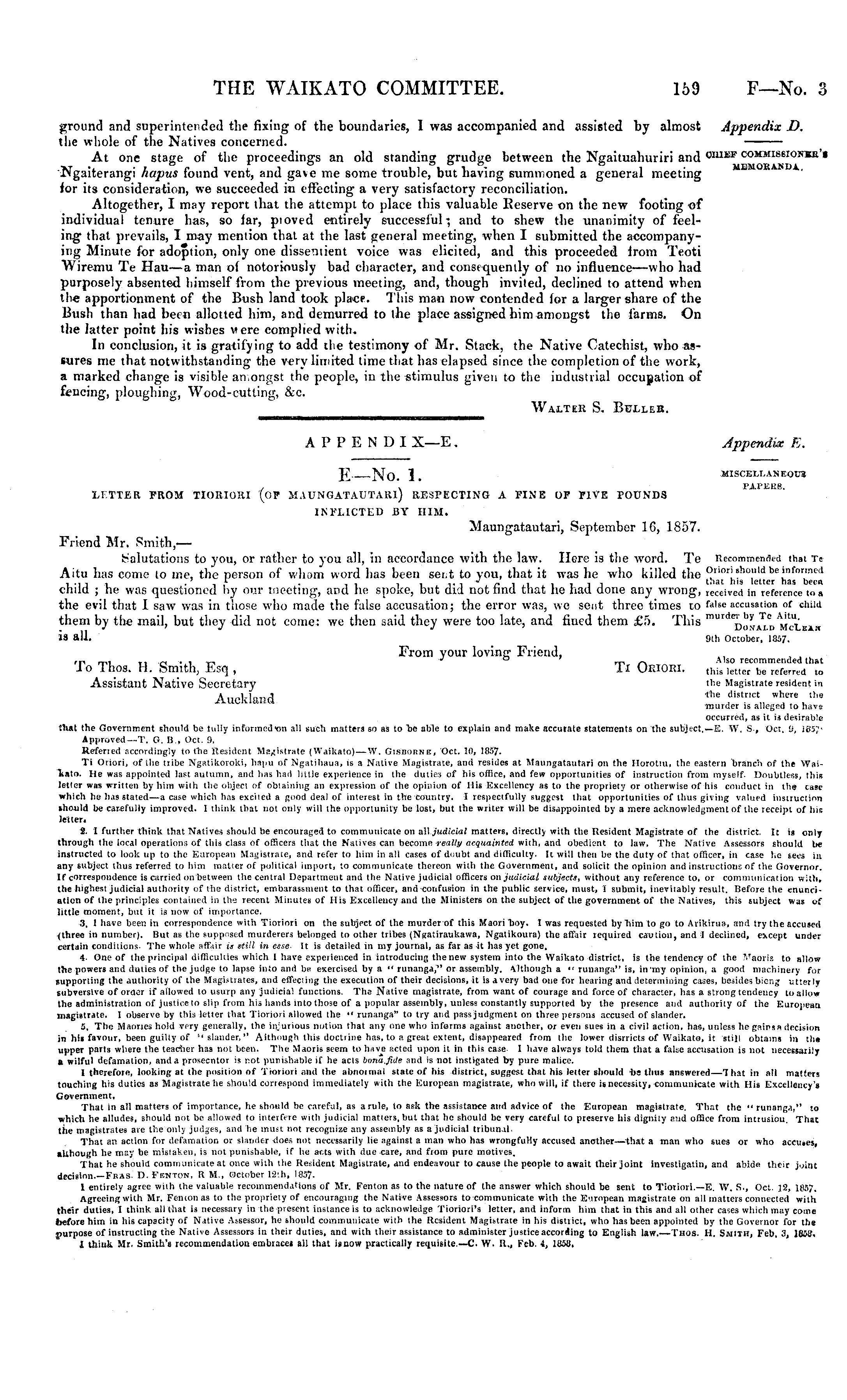 A P P E N DIX—E. E—No. 1. LETTER FROM TIORIORI (OF MAUNGATAUTARI) RESPECTING A FINE OF FIVE POUNDS INFLICTED BY HIM. Maungatautari, September 16, 1857. Friend Mr. Smith, — Salutations to you, or rather to you all, in accordance with the law. Here is the word. Te Recommended that Te Aitu has come to me, the person of whom word has been set:t to you, that it was he who killed the o rlor '» hould i> e '"f or " ied , ... ~ --1, - ii ii ti/»iiiiji t ' lat nis letter has been child ; he was questioned by our meeting, and he spoke, but did not tmd that he had done any wrong, received in reference u>« the evil that I saw was in those who made the false accusation; the error was, we sent three times to false accusation of child them by the mail, but they did not come: we then said they were too late, and fined them £5. This mur *DoHAx!>licLKAii is all. 9th October, 18S7. From your loving Friend, ~ , , , m rr,, T . .« ~, -~ v o A] so recommended that JO TIIOS. H. Smith, Esq , Tl OEIORI. this letter be referred to Assistant Native Secretary the Magistrate resident in Auckland 'the distnct where the murder is alleged to nave occurred, as it is desirable tlwt the Government should be tally informed«on all such matters so as to toe able to explain and make accurate statements on the subject,—E. W, S- f Oct, i), 185?' Approved—-T. G. 8., Oct. 9, Referred accordingly to the Resident Magistrate (Waikato) —W. Gis'bornk, Oct. 10, 1857. Ti Oriori, of the tribe Ngatikoroki, hapu of Ngatihaua, is a Native Magistrate, and resides at Maungatautari on the Horotm, the eastern branch of the WaiTtato. He was appointed last autumn, and has had little experience in the duties of his office, and few opportunities of instruction from myself. Doubtless, thin letter was written by him with the object of obtaining an expression of the opinion of His Excellency as to the propriety or otherwise of his conduct in the case which he has stated—a case which has excited a good deal of interest in the country. I respectfully suggest that opportunities of thus giving valued instruction should be carefully improved. I think that not only will the opportunity be lost, but the writer will be disappointed by a mere acknowledgment of the receipt of his letter< 2. 1 further think that Natives should be encouraged to communicate on a\\ judicial matters, directly with the Resident Magistrate of the district. It is only through the local operations of this class of officers that the Natives can become realty acquainted with, and obedient to law. The Native Assessors should be instructed to look up to the European Magistrate, and refer to him in all cases of doubt and difficulty. It will then be the duty of that officer, in case he sees in any subject thus referred to him matter of political import, to communicate thereon with the Government, and solicit the opinion and instructions of the Governor. If correspondence is carried on between the central Department and the Native judicial officers on judicial subjects, without any reference to, or communication with, the highest judicial authority of the district, embarassment to that officer, and confusion in the public service, must, I submit, inevitably result. Before the enunciation of the principles contained in the recent Minutes of His Excellency and the Ministers on the subject of the government of the Natives, this subject was of little moment, but it is now of importance. 3, 1 have been in correspondence with Tioriori on the subject of the murder of this Maori boy. I was requested by Turn to go to Arikirua, and try the accused (three in number). But as the supposed murderers belonged to other tribes (Ngatiraukawa, Ngatikoura) the affair required caution, and J declined, except under certain conditions- The whole affair is stilt in esse It is detailed in my journal, as far as U has yet gone, 4- One of the principal difficulties which I have experienced in introducing the new system into the Waikato district, is the tendency of the Maoris to allow the powers and duties of the judge to lapse into and be exercised by a " runanga," or assembly. Although a «'runanga" is, in'my opinion, a good machinery for supporting the authority of the Magistrates, and effecting the execution of their decisions, it is a very bad one for hearing and determining cases, besides hieng utterly subversive of oraer if allowed to usurp any judicial functions. The Native magistrate, from want of courage and force of character, has a strong tendency to allow the administration of justice to slip from his hands into those of a popular assembly, unless constantly supported by the presence and authority of the European magistrate. I observe by this letter that Tioriori allowed the *' runanga" to try and pass judgment on three persons accused of slander. 5, The Maories hold very generally, the injurious notion that any one who informs against another, or even sues in a civil action, has, unless he gain a a decision in his favour, been guilty of "slander," Although this doctrine has, to a great extent, disappeared from the lower disrricts of Waikato, it still obtains in th« upper parts where the teacher has not been. The Maoris seem to have acted upon it in this case- I have always told them that a false accusation is not necessarily a wilful defamation, and a prosecntor is not punishable if he acts bona,fide and is not instigated by pure malice. I therefore, looking at the position of Tioriori and the abnormal state of his district, suggest that his letter should foe thus answered—'lhat in all matters touching his duties as Magistrate he should correspond immediately with the European magistrate, who will, if there is necessity, communicate with His Excellency's Government, That in all matters of importance, he should be careful, as a rule, to ask the assistance and advice of the European magistrate. That the "runanga," to which he alludes, should not be allowed to interfere with judicial matter