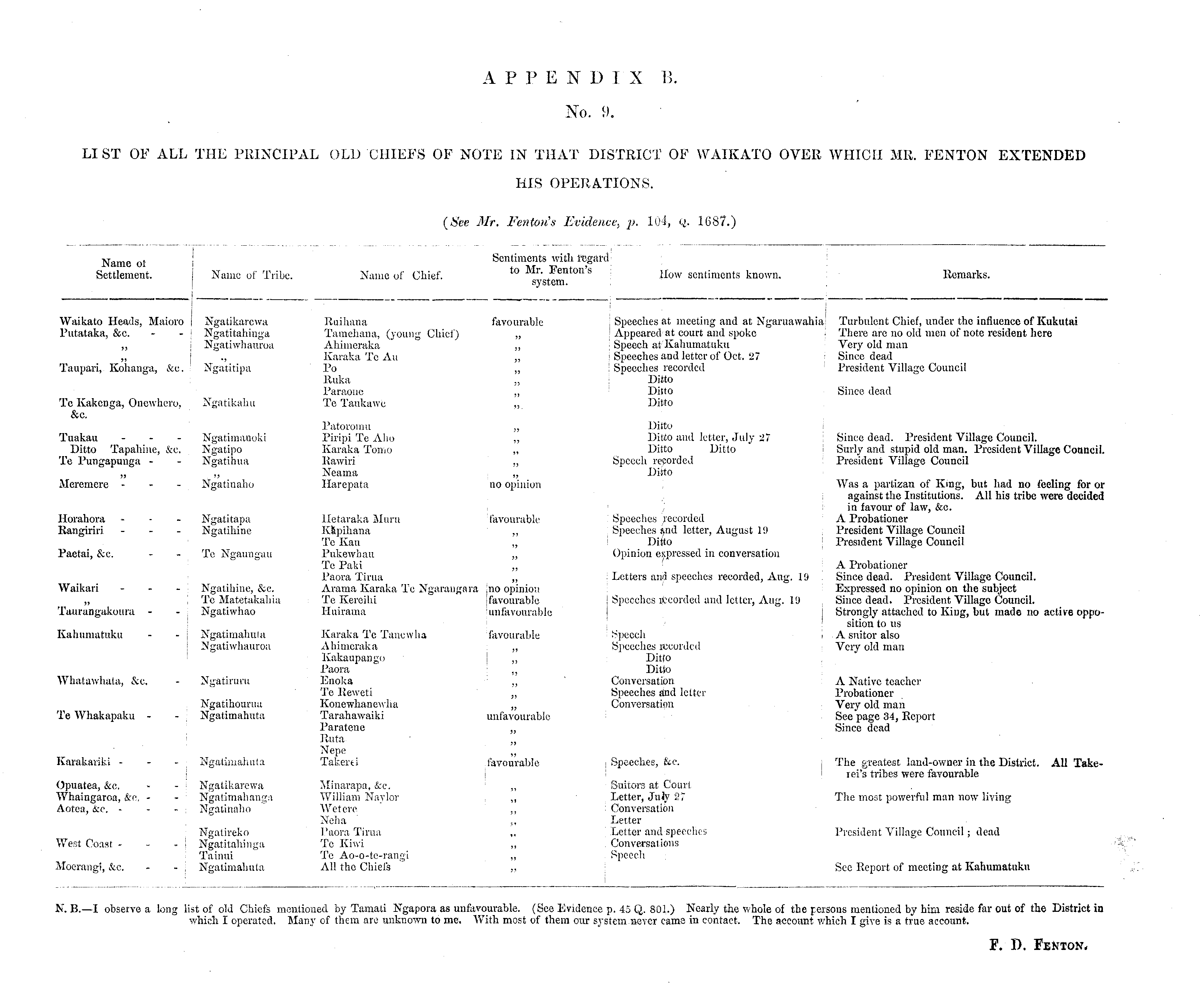 N. B.—l observe a long list of old Chiefs mentioned by Tamati Ngapora as unfavourable. (See Evidence p. 45 Q. 801.) Nearly the whole of the persons mentioned by him reside far out of the District in which I operated. Many of them are unknown to me. With most of them our system never came in contact. The account which I give is a true account. F. D. Fenton,
