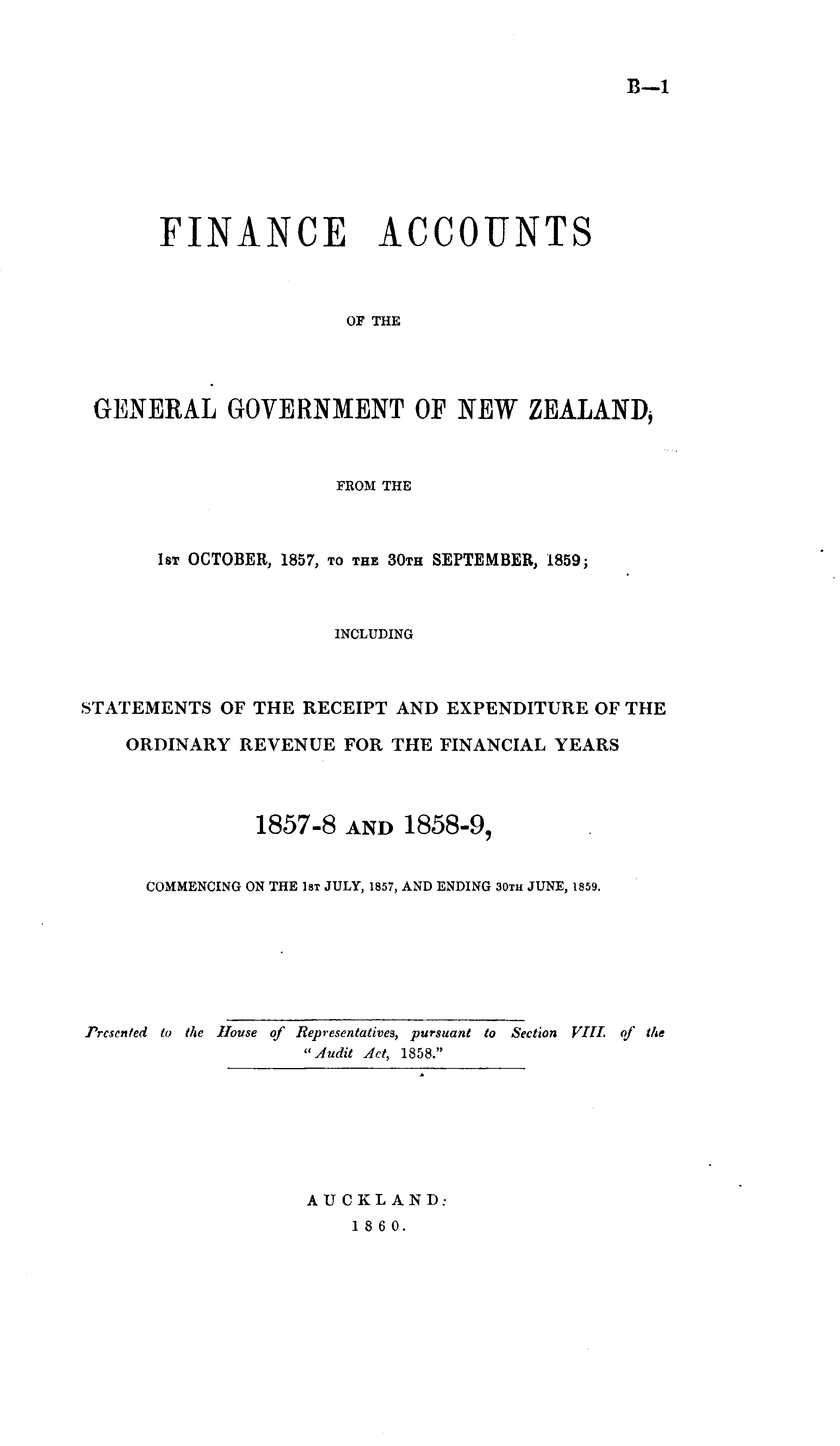 FINANCE ACCOUNTS OF THE GENERAL GOVERNMENT OF NEW ZEALAND, FROM THE 1st OCTOBER, 1857, to the 30th SEPTEMBER, 1859; INCLUDING STATEMENTS OF THE RECEIPT AND EXPENDITURE OF THE ORDINARY REVENUE FOR THE FINANCIAL YEARS 1857-8 and 1858-9, COMMENCING ON THE 1st JULY, 1857, AND ENDING 30th JUNE, 1859.