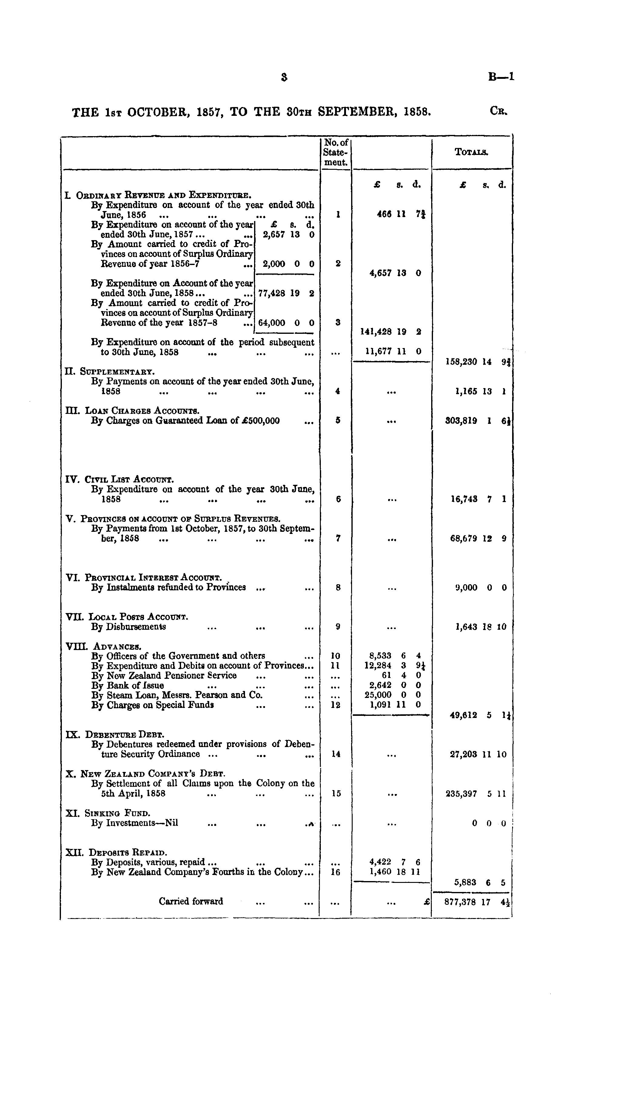 Cβ. No. of Statement. Totals. £ s. d. £ s. a. L Ordinary Revenue and Expenditure. By Expenditure on account of the year ended 30th June, 1856 By Expenditure on account of the year £ s. d. ended 30th June, 1857... ... 2,657 13 0 By Amount carried to credit of Provinces on account of Surplus Ordinary Revenue of year 185G-7 ... 2,000 O 0 466 11 7| 4,657 13 0 By Expenditure on Account of the year ended 30th June, 1858... ... 77,428 19 2 By Amount carried to credit of Provinces on account of Surplus Ordinary Revenue of the year 1857-8 ... 64,000 0 0 By Expenditure on account of the period subsequent to 30th June, 1858 3 141,428 19 2 11,677 11 0 II. Supplementary. By Payments on account of the year ended 30th June, 1858 158,230 14 9} 4 1,165 13 1 HI. Loan Charges Accounts. By Charges on Guaranteed Loan of £500,000 5 303,819 1 6} IV. Civil List Account. By Expenditure on account of the year 30th Jane, 1858 16,743 7 1 V. Provinces on account op Surplus Revenues. By Payments from 1st October, 1857, to 30th September, 1858 68,679 12 9 VI. Provincial Interest Account. By Instalments refunded to Provinces ... U,000 0 0 Vn. Local Posts Account. By Disbursements ... ... 1,643 18 10 'J VUL Advances. By Officers of the Government and others By Expenditure and Debits on account of Provinces... By New Zealand Pensioner Service By Bank of Issue By Steam Loan, Messrs. Pearson and Co. By Charges on Special Funds 10 11 8,533 6 4 12,284 3 9J 61 4 0 2,642 0 0 25,000 0 0 1,091 11 0 12 IX. Debenture Debt. By Debentures redeemed under provisions of Debenture Security Ordinance ... ... ... 49,612 5 \\ 14 27,203 11 10 X. New Zealand Company's Debt. By Settlement of all Claims upon the Colony on the 5th April, 1858 235,397 5 11 Iβ XI. Sinking Fcnd. By Investments—Nil ... ... .a 0 0 0 XII. Deposits Repaid. By Deposits, various, repaid ... By New Zealand Company's Fourths in the Colony... 4,422 7 6 1,460 18 11 5,883 6 5 Iβ Carried forward £ 877,378 17 4J
