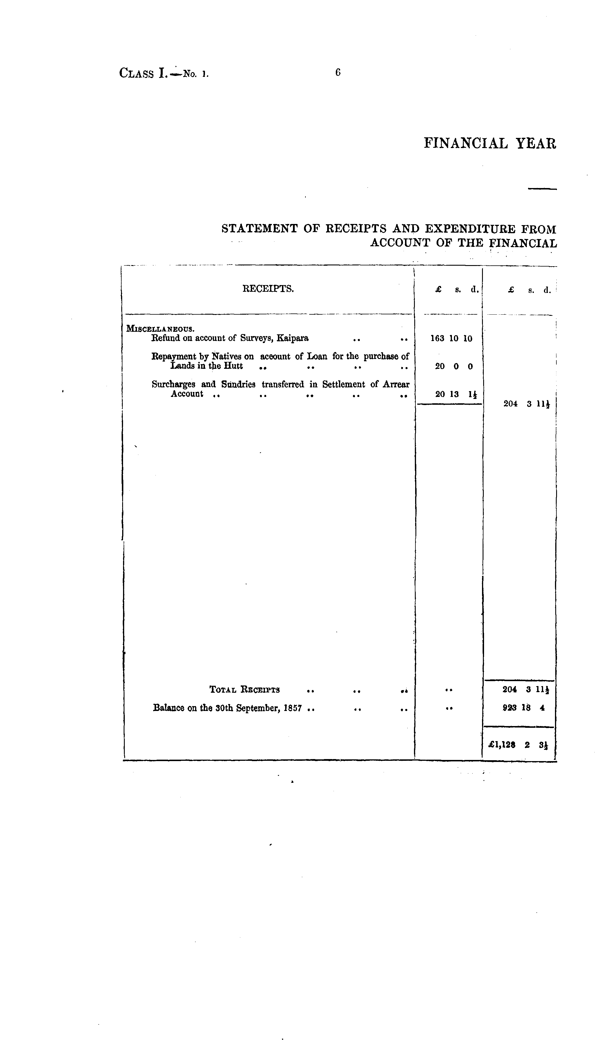 RECEIPTS. £ s. a. £ s. a. ISCEIXANEOUS. Refund on account of Surveys, Kaipara 163 10 10 Repayment by Natives on account of Loan for the purchase of Lands in the Hutt 20 0 0 Surcharges and Sundries transferred in Settlement of Arrear Account .. .. .. .. .. 20 13 li 204 3 11J Total Receipts .. .. .. 204 3 11} Balance on the 30th September, 1857 .. • • 923 18 4 £1,128 2 3J