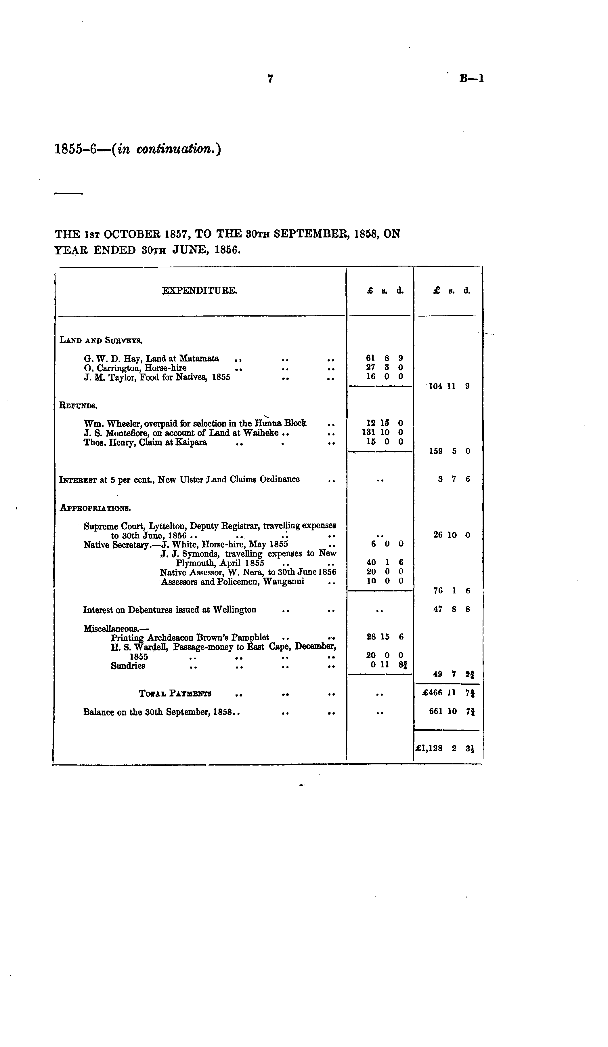 EXPENDITURE. £ s. d. £ s. d. Land and Subvets. G. W. D. Hay, Land at Matamata ., O, Carrington, Horse-hire .. J. M. Taylor, Food for Natives, 1855 61 8 9 27 3 0 16 0 0 Refunds. 104 11 9 Wm. Wheeler, overpaid for selection in the Hunna Block .. J. S. Montefiore, on account of Land at Waiheke Thos. Henry, Claim at Kaipara 12 15 0 131 10 0 15 0 0 159 5 0 Interest at 5 per cent., New Ulster Land Claims Ordinance 3 7 6 Apfbopriations. 26 10 0 Supreme Court, Lyttelton, Deputy Registrar, travelling expenses to 30th June, 1856 .. .. .'. Native Secretary.— J. White, Horse-hire, May 1855 J. J. Symonds, travelling expenses to New Plymouth, April 1855 Native Assessor, W. Nera, to 30th June 1856 Assessors and Policemen, Wanganui 6 0 0 40 1 6 20 0 0 10 0 0 76 1 6 Interest on Debentures issued at Wellington 47 8 8 Miscellaneous.— Printing Archdeacon Brown's Pamphlet H. S. Wardell, Passage-money to East Cape, December, 1855 Sundries .. . • •. • • 28 15 6 20 0 0 0 11 8f 49 7 2} To»Ai. Payments £466 11 7| Balance on the 30th September, 1858.. .. .. 661 10 7£ £1,128 2 3J