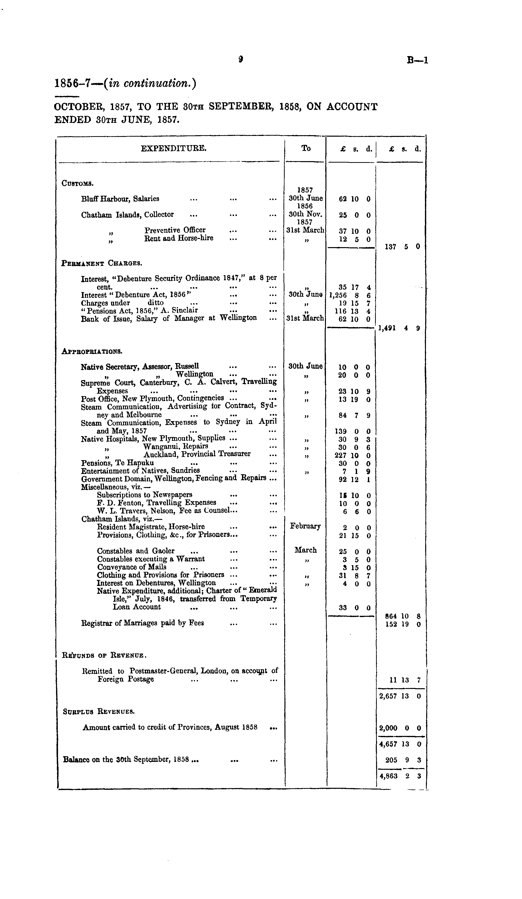 EXPENDITURE. To £ s. (1. £ s. d. Customs. Bluff Harbour, Salaries Chatham Islands, Collector 1857 30th June 1856 30th Nov. 1857 31st March 62 10 0 25 0 0 „ Preventive Officer „ Kent and Horse-hire 37 10 0 12 5 0 r> 137 5 0 Permanent Charqes. Interest, "Debenture Security Ordinance 1847," at 8 per cent. Interest " Debenture Act, 1856 " Charges under ditto ... ••• "Pensions Act, 1856," A. Sinclair Bank of Issue, Salary of Manager at Wellington 30th June 35 17 4 1,256 8 6 19 15 7 116 13 4 62 10 0 it 31st March 1,491 4 9 Appropriations. 10 0 0 20 0 0 Native Secretary, Assessor, Russell „ „ Wellington Supreme Court, Canterbury, C. A. Calvert, Travelling Expenses Post Office, New Plymouth, Contingencies ... Steam Communication, Advertising for Contract, Sydney and Melbourne Steam Communication, Expenses to Sydney in April and May, 1857 Native Hospitals, New Plymouth, Supplies ... „ Wanganui, Repairs „ Auckland, Provincial Treasurer Pensions, Te Hapuku Entertainment of Natives, Sundries Government Domain, Wellington, Fencing and Kepairs ... Miscellaneous, viz.— Subscriptions to Newspapers F. D. Fenton, Travelling Expenses W. L. Travers, Nelson, Fee as Counsel... Chatham Islands, viz.— Resident Magistrate, Horse-hire ... ••■ Provisions, Clothing, &c, for Prisoners... 30th June ii ,, n >i J) y> 23 10 9 13 19 0 84 7 9 139 0 0 30 9 3 30 0 6 227 10 0 30 0 0 7 1 9 92 12 1 ?> IS 10 0 10 0 0 6 6 0 February 2 0 0 21 15 0 Constables and Gaoler Constables executing a Warrant Conveyance of Mails Clothing and Provisions for Prisoners ... Interest on Debentures, Wellington Native Expenditure, additional; Charter of" Emerald Isle," July, 1846, transferred from Temporary Loan Account March 25 0 0 3 5 0 3 15 0 31 8 7 4 0 0 u M 33 0 0 Registrar of Marriages paid by Fees 864 10 8 152 19 0 Rb'fcnds of Revenue. Remitted to Postmaster-General, London, on account of Foreign Postage 11 13 7 Surplus Revenues. 2,657 13 0 Amount carried to credit of Provinces, August 1858 ... 2,000 0 0 4,657 13 0 Balance on the 30th September, 1858 ... 205 9 3 4,863 2 3