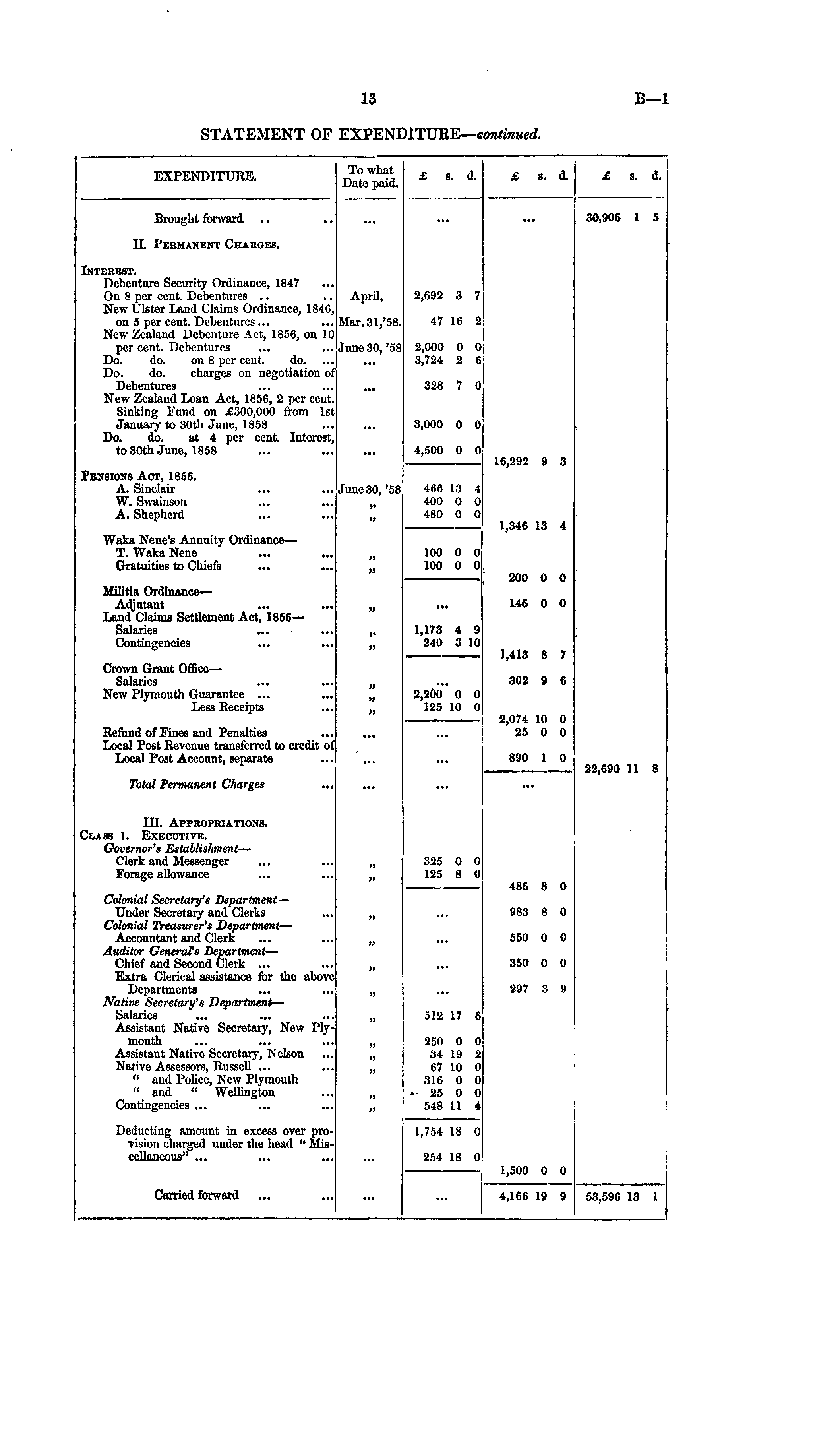 EXPENDITURE. To what Date paid. £ s. d. £ s. d. £ s. d. Brought forward 30,906 1 II. Permanent Charges. nterest. Debenture Security Ordinance, 1847 On 8 per cent. Debentures New Ulster Land Claims Ordinance, 1846, on 5 per cent. Debentures... New Zealand Debenture Act, 1856, on 10 per cent. Debentures Do. do. on 8 per cent. do. Do. do. charges on negotiation of Debentures New Zealand Loan Act, 1856, 2 per cent. Sinking Fund on £300,000 from 1st January to 30th June, 1858 Do. do. at 4 per cent. Interest, to 30th June, 1858 2,692 3 7 April. Mar. 31/58. 47 16 2 I June 30, '58 2,000 0 0 3,724 2 6 328 7 0 3,000 0 0 4,500 0 0 'ensions Act, 1856. A. Sinclair W. Swainson ... A. Shepherd June 30, '58 466 13 4 400 0 0 480 0 0 16,292 9 3 j> II 1,346 13 4 Waka Ncne's Annuity Ordinance— T. Waka Nene Gratuities to Chiefs tt 100 0 0 100 0 0 200 0 0 It Militia Ordinance— Adjutant ... ... Land Claims Settlement Act, 1856— Salaries Contingencies 31 1,173 4 9 240 3 10 146 0 0 »• 1,413 8 7 f> Crown Grant OfficeSalaries New Plymouth Guarantee ... Less Receipts tt 2,200 0 0 125 10 0 302 9 6 u Refund of Fines and Penalties Local Post Revenue transferred to credit of Local Post Account, separate It 2,074 10 0 25 0 0 890 1 0 Toted Permanent Charges ... 22,690 11 8 ID. Appropriations. !lass 1. Executive. Governor's Establishment — Clerk and Messenger ... Forage allowance 325 0 0 125 8 0 J» f> 486 8 0 Colonial Secretary's Department — Under Secretary and Clerks Colonial Treasurer's Department — Accountant and Clerk Auditor GeneraTs Department— Chief and Second Clerk ... Extra Clerical assistance for the above Departments Native Secretary's Department — Salaries Assistant Native Secretary, New Plymouth Assistant Native Secretary, Nelson Native Assessors, Russell ... " and Police, New Plymouth " and " Wellington Contingencies ... it y> it n 512 17 6 983 8 0 550 0 0 350 0 0 297 3 9 >» >j j» 250 0 0 34 19 2 67 10 0 316 0 0 - 25 0 0 548 U 4 n Deducting amount in excess over provision charged under the head " Miscellaneous" ... » 1,754 18 0 254 18 0 1,500 0 0 Carried forward 4,166 19 9 53,596 13 1