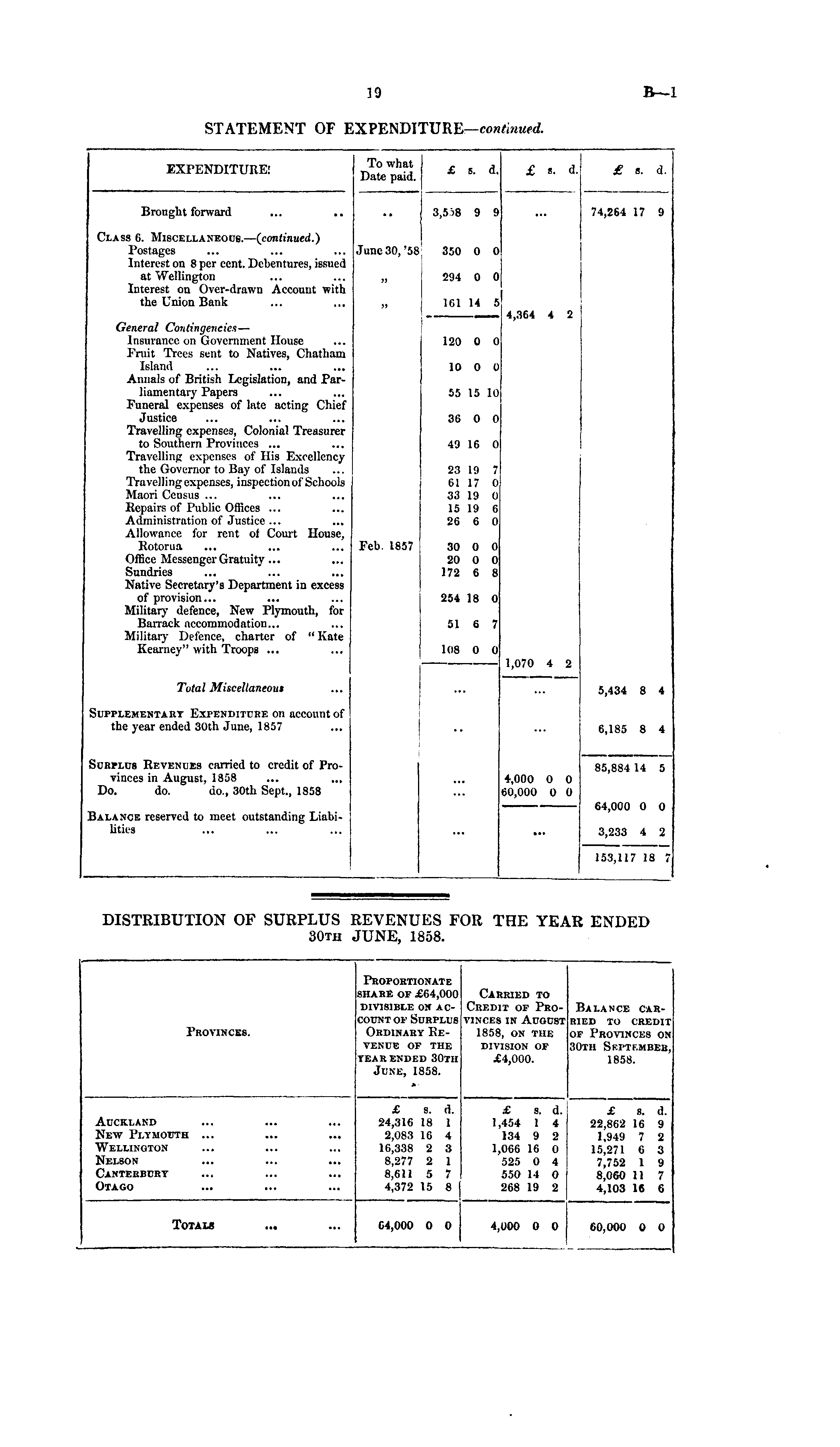 DISTRIBUTION OF SURPLUS REVENUES FOR THE YEAR ENDED 30th JUNE, 1858.
