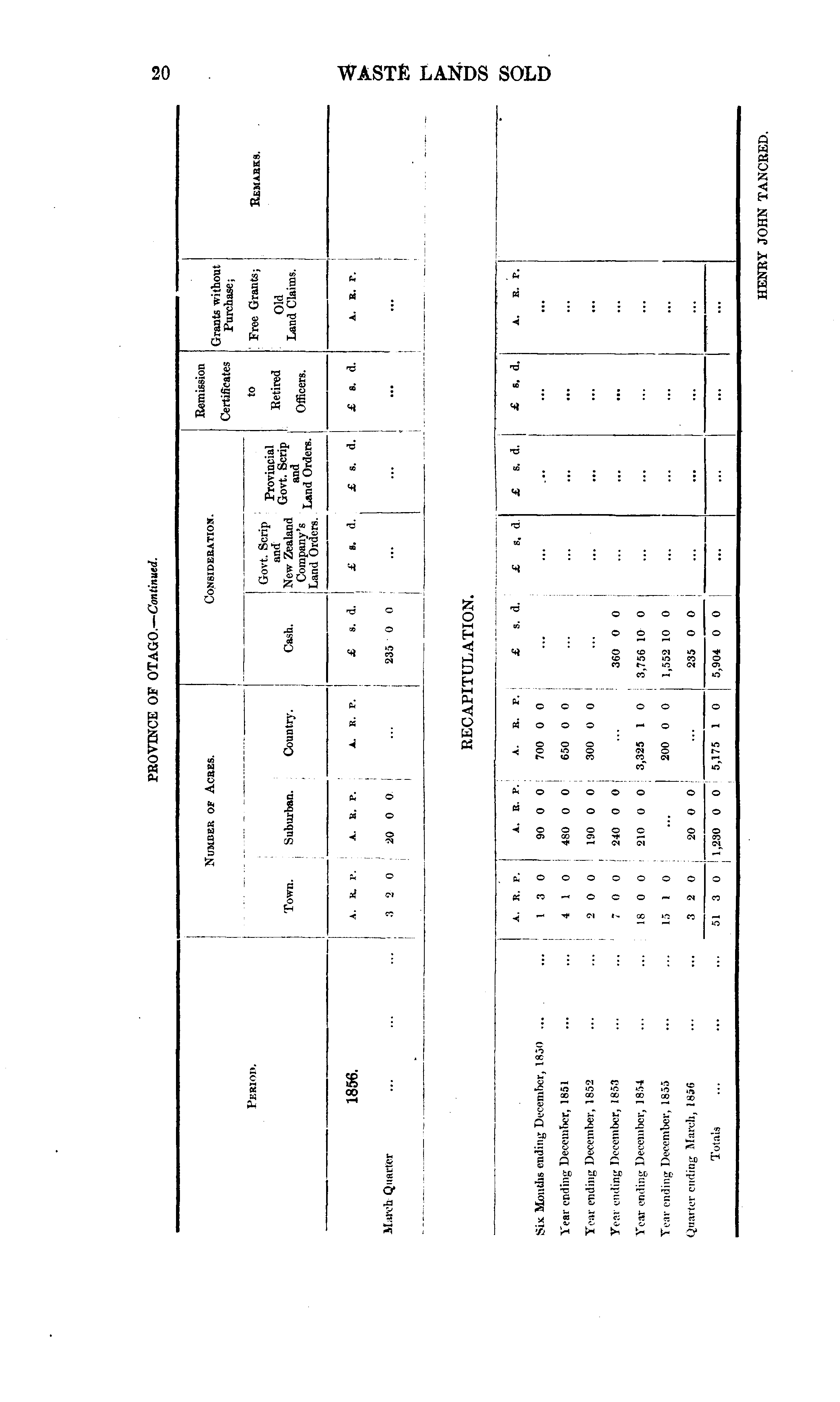 Remission Number of Aches. Consideration. Certificates Grants without Purchase; Period. to Free Grants; Remark*. Town. Suburban. Country. Cash. Govt. Scrip Prorincial Newztland G°vt. Scrip LandTrYere. Ketired Old Land Claims. Officers. Quarter 1856. A. ):. r. 3 2 0 A. K. P. 20 0 0 a. k. r. ... £ s. d. 235 0 0 £ 8. d. £ s. d. £ s. d. A. R. r. RECAPITULATION. A. R. P. A. R. P. A. R. l>. 90 0 0 700 0 0 ■ 480 0 0 650 0 0 190 0 0 300 0 0 240 0 0 210 0 0 3,325 1 0 200 0 0 20 0 0 £ s. d. 360 0 0 3,756 10 0 1,552 10 0 235 0 0 £ i s. a. £ s. d. A. R. F. £ s. d. Six Months ending December, 1850 ... 1 3 0 Year ending DecemT>er, 1851 4 1 0 Yen ending December, 1852 2 0 0 ' Year ending December, 1853 7 0 0 Year ending December, 1854 18 0 0 i Tear ending December, 1855 15 1 0 I Quarter ending March, 1856 3 2 0 , Totals 51 3 0 i 51 3 0 1,230 0 0 5,175 1 0 5,904 0 0 I