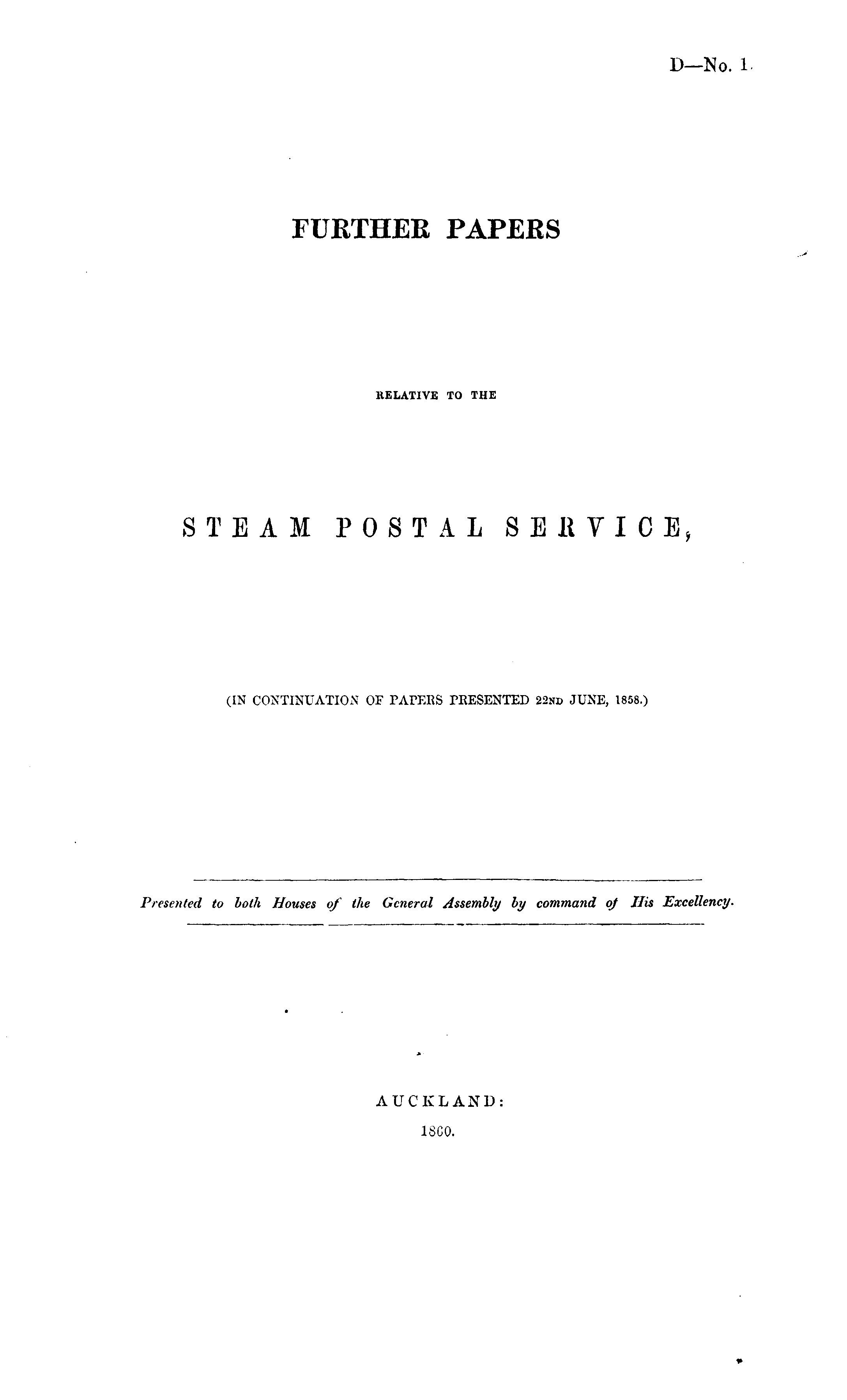 FURTHER PAPERS RELATIVE TO THE STEAM POSTAL SERVICE, (IN CONTINUATION OF PAPERS PRESENTED 22nd JUNE, 1858.)