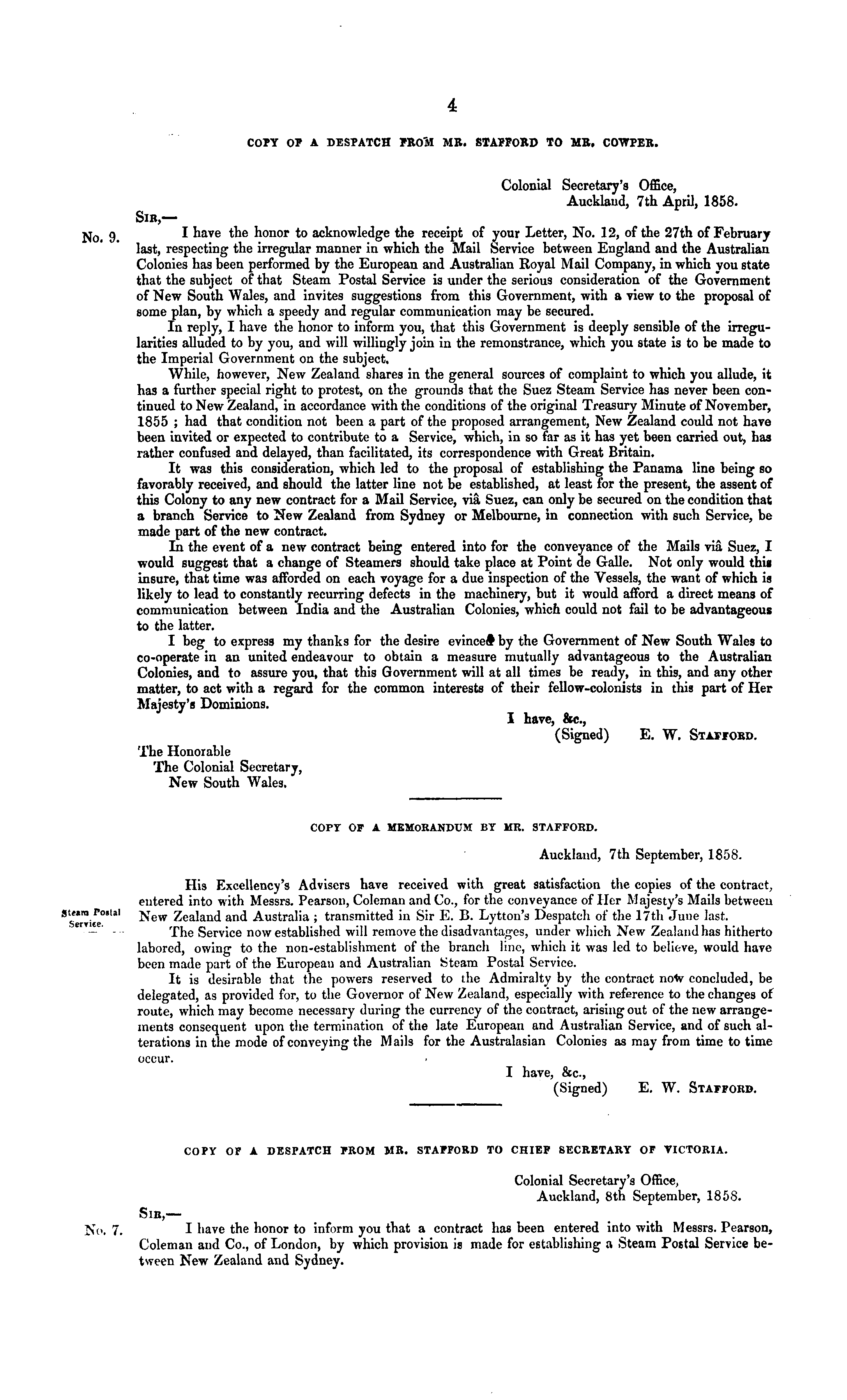 COPY OP A DESPATCH FROM MR. STAFFORD TO MR. COWPER. Colonial Secretary's Office, Auckland, 7th April, 1858. Sir,— I have the honor to acknowledge the receipt of your Letter, No. 12, of the 27th of February last, respecting the irregular manner in which the Mail Service between England and the Australian Colonies has been performed by the European and Australian Royal Mail Company, in which you state that the subject of that Steam Postal Service is under the serious consideration of the Government of New South Wales, and invites suggestions from this Government, with a view to the proposal of some plan, by which a speedy and regular communication may be secured. In reply, I have the honor to inform you, that this Government is deeply sensible of the irregularities alluded to by you, and will willingly join in the remonstrance, which you state is to be made to the Imperial Government on the subject. While, however, New Zealand shares in the general sources of complaint to which you allude, it has a further special right to protest, on the grounds that the Suez Steam Service has never been continued to New Zealand, in accordance with the conditions of the original Treasury Minute of November, 1855 ; had that condition not been a part of the proposed arrangement, New Zealand could not have been invited or expected to contribute to a Service, which, in so far as it has yet been carried out, has rather confused and delayed, than facilitated, its correspondence with Great Britain. It was this consideration, which led to the proposal of establishing the Panama line being so favorably received, and should the latter line not be established, at least for the present, the assent of this Colony to any new contract for a Mail Service, via Suez, can only be secured on the condition that a branch Service to New Zealand from Sydney or Melbourne, in connection with such Service, be made part of the new contract. In the event of a new contract being entered into for the conveyance of the Mails via Suez, I would suggest that a change of Steamers should take place at Point de Galle. Not only would this insure, that time was afforded on each voyage for a due inspection of the Vessels, the want of which is likely to lead to constantly recurring defects in the machinery, but it would afford a direct means of communication between India and the Australian Colonies, which could not fail to be advantageous to the latter. I beg to express my thanks for the desire evinced by the Government of New South Wales to co-operate in an united endeavour to obtain a measure mutually advantageous to the Australian Colonies, and to assure you, that this Government will at all times be ready, in this, and any other matter, to act with a regard for the common interests of their fellow-colonists in this part of Her Majesty's Dominions. I hare, &c, (Signed) E. W. Stafford. The Honorable The Colonial Secretary, New South Wales. COPY OF A MEMORANDUM BY MR. STAFFORD. Auckland, 7th September, 1858. His Excellency's Advisers have received with great satisfaction the copies of the contract, entered into with Messrs. Pearson, Coleman and Co., for the conveyance of Her Majesty's Mails between ew Zealan d an( l Australia ; transmitted in Sir E. B. Lytton's Despatch of the 17th June last. The Service now established will remove the disadvantages, under which New Zealand has hitherto labored, owing to the non-establishment of the branch line, which it was led to believe, would have been made part of the European and Australian Steam Postal Service. It is desirable that the powers reserved to the Admiralty by the contract now concluded, be delegated, as provided for, to the Governor of New Zealand, especially with reference to the changes of route, which may become necessary during the currency of the contract, arising out of the new arrangements consequent upon the termination of the late European and Australian Service, and of such alterations in the mode of conveying the Mails for the Australasian Colonies as may from time to time occur. I have, &c., (Signed) E. W. Stafford. COPY OF A DESPATCH FROM MR. STAFFORD TO CHIEF SECRETARY OF VICTORIA. Colonial Secretary's Office, Auckland, Bth September, 1858. Sib, — I have the honor to inform you that a contract has been entered into with Messrs. Pearson, Coleman and Co., of London, by which provision is made for establishing a Steam Postal Service between New Zealand and Sydney.
