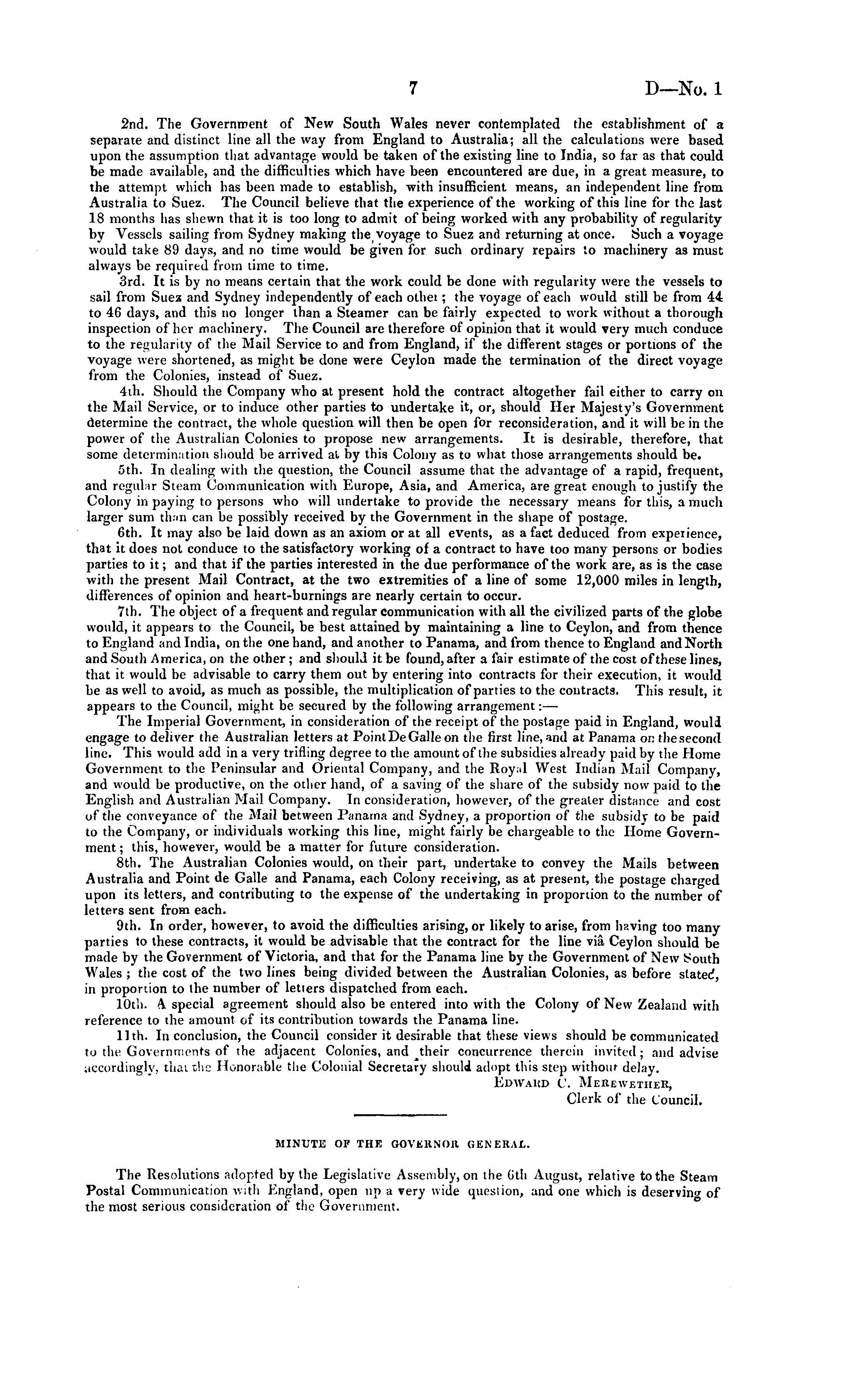 2nd. The Government of New South Wales never contemplated the establishment of a separate and distinct line all the way from England to Australia; all the calculations were based upon the assumption that advantage would be taken of the existing line to India, so far as that could be made available, and the difficulties which have been encountered are due, in a great measure, to the attempt which has been made to establish, with insufficient means, an independent line from Australia to Suez. The Council believe that the experience of the working of this line for the last 18 months has shewn that it is too long to admit of being worked with any probability of regularity by Vessels sailing from Sydney making the voyage to Suez and returning at once. Such a voyage would take 89 days, and no time would be given for such ordinary repairs to machinery as must always be required from time to time. 3rd. It is by no means certain that the work could be done with regularity were the vessels to sail from Suez and Sydney independently of each othet; the voyage of each would still be from 44 to 46 days, and this no longer than a Steamer can be fairly expected to work without a thorough inspection of her machinery. The Council are therefore of opinion that it would very much conduce to the regularity of the Mail Service to and from England, if the different stages or portions of the voyage were shortened, as might be done were Ceylon made the termination of the direct voyage from the Colonies, instead of Suez. 4th. Should the Company who at present hold the contract altogether fail either to carry on the Mail Service, or to induce other parties to undertake it, or, should Her Majesty's Government determine the contract, the whole question will then be open for reconsideration, and it will be in the power of the Australian Colonies to propose new arrangements. It is desirable, therefore, that some determination should be arrived al by this Colony as to what those arrangements should be. sth. In dealing with the question, the Council assume that the advantage of a rapid, frequent, and regular Steam Communication with Europe, Asia, and America, are great enough to justify the Colony in paying to persons who will undertake to provide the necessary means for this, a much larger sum th:m can be possibly received by the Government in the shape of postage. 6th. It may also be laid down as an axiom or at all events, as a fact deduced from experience, that it does not conduce to the satisfactory working of a contract to have too many persons or bodies parties to it; and that if the parties interested in the due performance of the work are, as is the case with the present Mail Contract, at the two extremities of a line of some 12,000 miles in length, differences of opinion and heart-burnings are nearly certain to occur. 7th. The object of a frequent and regular communication with all the civilized parts of the globe would, it appears to the Council, be best attained by maintaining a line to Ceylon, and from thence to England and India, on the one hand, and another to Panama, and from thence to England and North and South America, on the other; and should it be found, after a fair estimate of the cost of these lines, that it would be advisable to carry them out by entering into contracts for their execution, it would be as well to avoid, as much as possible, the multiplication of parties to the contracts. This result, it appears to the Council, might be secured by the following arrangement: — The Imperial Government, in consideration of the receipt of the postage paid in England, would engage to deliver the Australian letters at PointDeGalle on the first line, and at Panama on the second line. This would add in a very trifling degree to the amount of the subsidies already paid by the Home Government to the Peninsular and Oriental Company, and the Roy;d West Indian Mail Company, and would be productive, on the other hand, of a saving of the share of the subsidy now paid to the English and Australian Mail Company. In consideration, however, of the greater distance and cost of the conveyance of the Mail between Panama and Sydney, a proportion of the subsidy to be paid to the Company, or individuals working this line, might fairly be chargeable to the Home Government ; this, however, would be a matter for future consideration. Bth. The Australian Colonies would, on their part, undertake to convey the Mails between Australia and Point de Galle and Panama, each Colony receiving, as at present, the postage charged upon its letters, and contributing to the expense of the undertaking in proportion to the number of letters sent from each. 9th. In order, however, to avoid the difficulties arising, or likely to arise, from having too many parties to these contracts, it would be advisable that the contract for the line via, Ceylon should be made by the Government of Victoria, and that for the Panama line by the Government of New South Wales ; the cost of the two lines being divided between the Australian Colonies, as before stated, in proportion to the number of letters dispatched from each. 10th. A special agreement should also be entered into with the Colony of New Zealand with reference to the amount of its contribution towards the Panama line. 11th. In conclusion, the Council consider it desirable that these views should be communicated to the Governments of the adjacent Colonies, and their concurrence therein invited ; and advise accordingly, thai the Honorable the Colonial Secretary should adopt this step without delay. Edwakd C. Merewetheß, Clerk of the Council. MINUTE OF THE GOVERNOR GENERAL. The Resolutions adopted by the Legislative Assembly, on the 6th August, relative to the Steam Postal Communication with England, open up a very wide question, and one which is deserving of the most serious consideration of the Government.