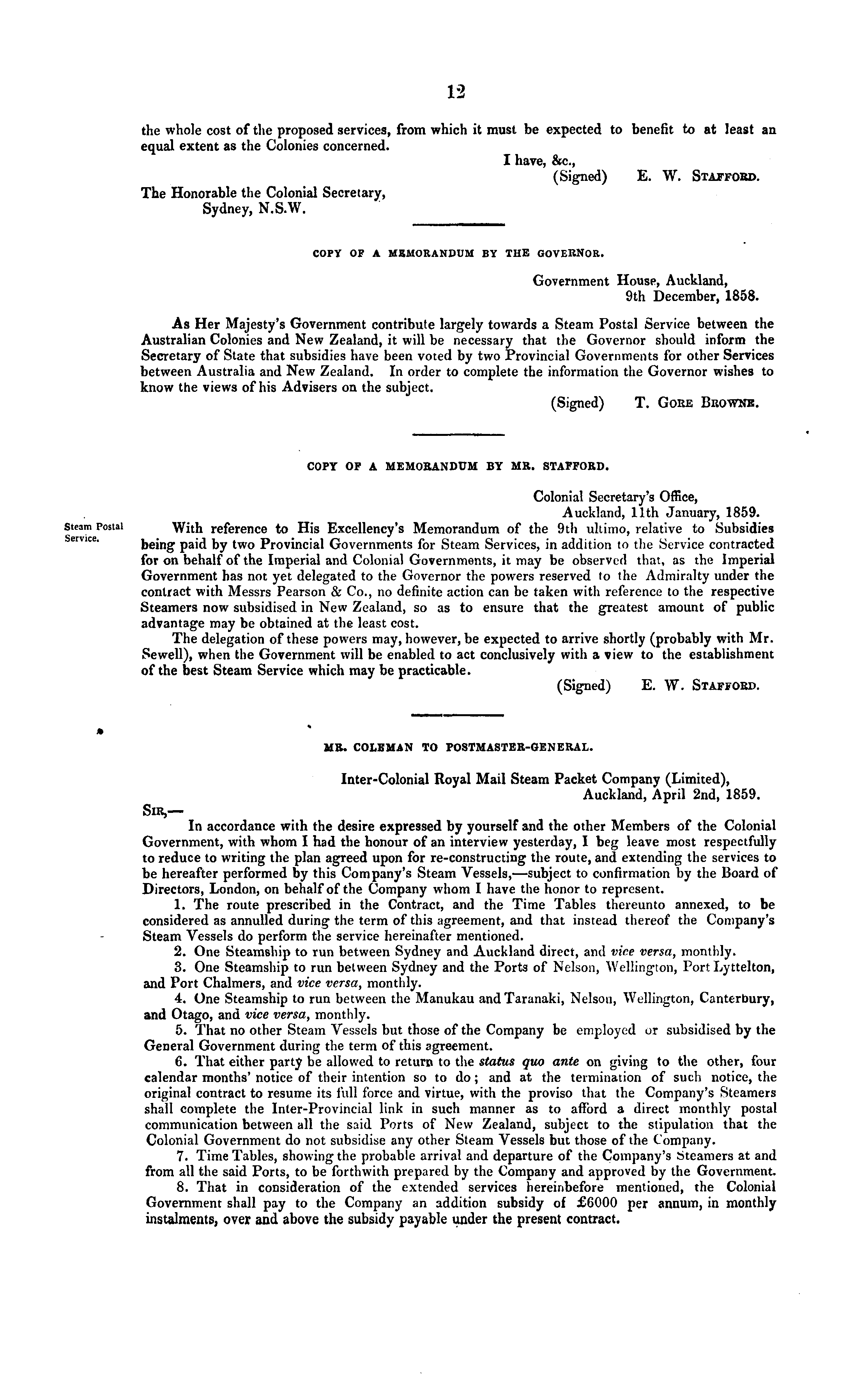 the whole cost of the proposed services, from which it must be expected to benefit to at least an equal extent as the Colonies concerned. I have, &c, (Signed) E. W. Stafford. The Honorable the Colonial Secretary, Sydney, N.S.W. COPY OF A MEMORANDUM BY THE GOVERNOR. Government House, Auckland, 9th December, 1858. As Her Majesty's Government contribute largely towards a Steam Postal Service between the Australian Colonies and New Zealand, it will be necessary that the Governor should inform the Secretary of State that subsidies have been voted by two Provincial Governments for other Services between Australia and New Zealand. In order to complete the information the Governor wishes to know the views of his Advisers on the subject. (Signed) T. Gore Brownb. COPY OF A MEMORANDUM BY MR. STAFFORD. Colonial Secretary's Office, Auckland, 11th January, 1859. With reference to His Excellency's Memorandum of the 9th ultimo, relative to Subsidies being paid by two Provincial Governments for Steam Services, in addition to the Service contracted for on behalf of the Imperial and Colonial Governments, it may be observed that, as the Imperial Government has not yet delegated to the Governor the powers reserved to the Admiralty under the contract with Messrs Pearson & Co., no definite action can be taken with reference to the respective Steamers now subsidised in New Zealand, so as to ensure that the greatest amount of public advantage may be obtained at the least cost. The delegation of these powers may, however, be expected to arrive shortly (probably with Mr. Sewell), when the Government will be enabled to act conclusively with a view to the establishment of the best Steam Service which may be practicable. (Signed) E. W. Stafford. MR. COLEMAN TO POSTMASTER-GENERAL. Inter-Colonial Royal Mail Steam Packet Company (Limited), Auckland, April 2nd, 1859. Sir,— In accordance with the desire expressed by yourself and the other Members of the Colonial Government, with whom I had the honour of an interview yesterday, I beg leave most respectfully to reduce to writing the plan agreed upon for re-constructing the route, and extending the services to be hereafter performed by this Company's Steam Vessels,—subject to confirmation by the Board of Directors, London, on behalf of the Company whom I have the honor to represent. 1. The route prescribed in the Contract, and the Time Tables thereunto annexed, to be considered as annulled during the term of this agreement, and that instead thereof the Company's Steam Vessels do perform the service hereinafter mentioned. 2. One Steamship to run between Sydney and Auckland direct, and vice versa, monthly. 3. One Steamship to run between Sydney and the Ports of Nelson, Wellington, Port Lyttelton, and Port Chalmers, and vice versa, monthly. 4. One Steamship to run between the Manukau and Taranaki, Nelson, Wellington, Canterbury, and Otago, and vice versa, monthly. 5. 'That no other Steam Vessels but those of the Company be employed or subsidised by the General Government during the term of this agreement. 6. That either party be allowed to return to the status quo ante on giving to the other, four calendar months' notice of their intention so to do ; and at the termination of such notice, the original contract to resume its full force and virtue, with the proviso that the Company's Steamers shall complete the Inter-Provincial link in such manner as to afford a direct monthly postal communication between all the said Ports of New Zealand, subject to the stipulation that the Colonial Government do not subsidise any other Steam Vessels but those of the Company. 7. Time Tables, showing the probable arrival and departure of the Company's Steamers at and from all the said Ports, to be forthwith prepared by the Company and approved by the Government. 8. That in consideration of the extended services hereinbefore mentioned, the Colonial Government shall pay to the Company an addition subsidy of £6000 per annum, in monthly instalments, over and above the subsidy payable under the present contract.