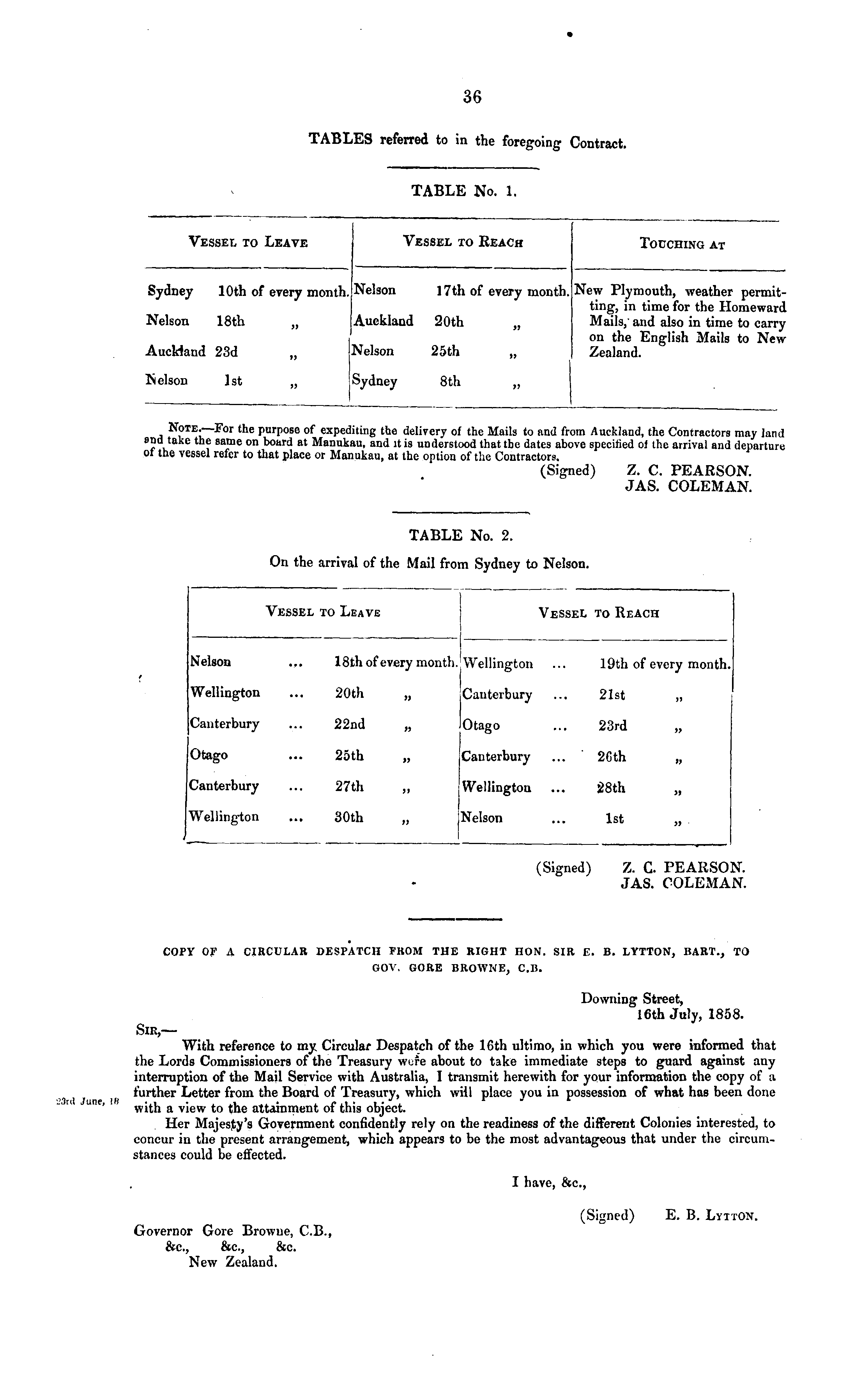 IsoTEj—For the purpose of expediting the delivery of the Mails to and from Auckland, the Contractors may land and take the same on board at Manukau, and it is understood that the dates above specified of the arrival and departure of the vessel refer to that place or Manukau, at the option of the Contractors. (Signed) Z. C. PEARSON. JAS. COLEMAN.