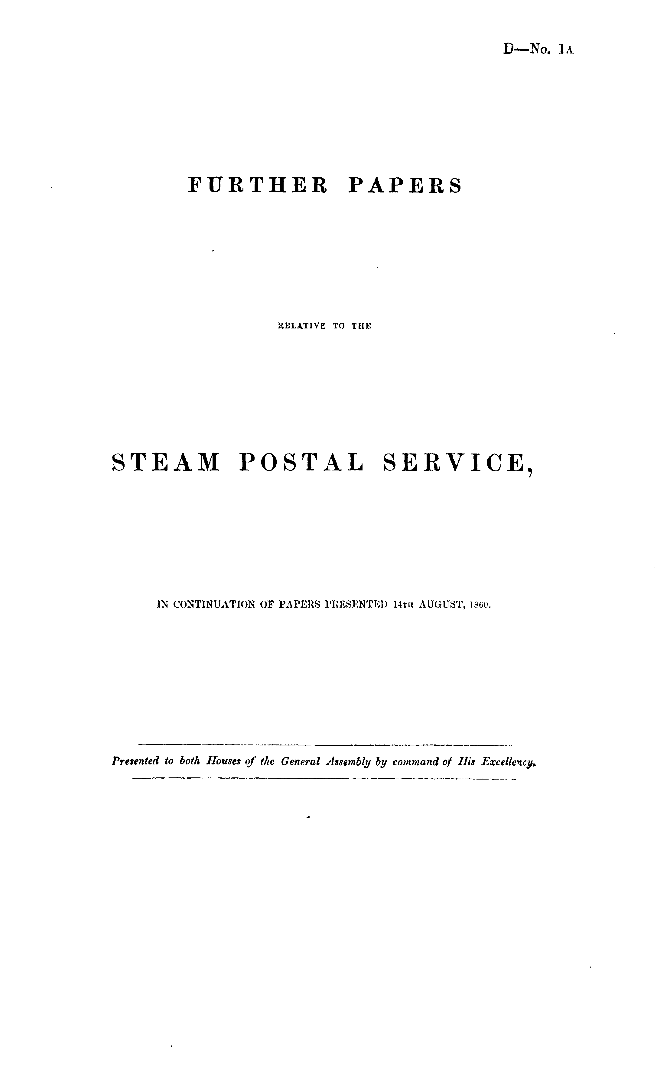 FURTHER PAPERS RELATIVE TO THE STEAM POSTAL SERVICE, IN CONTINUATION OF PAPERS PRESENTED 14th AUGUST, 1860.