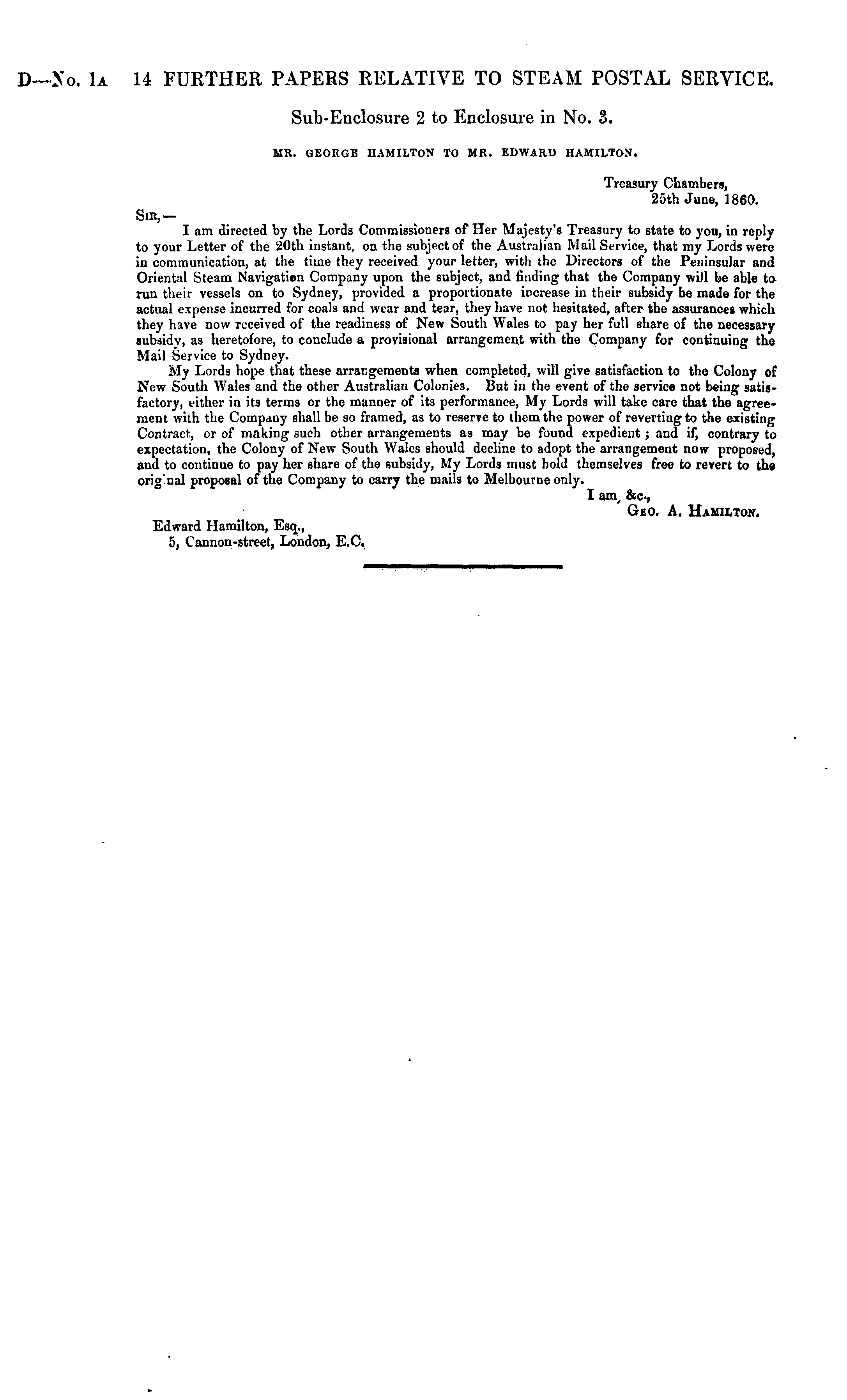 Sub-Enclosure 2 to Enclosure in No. 3. MR. UEORGB HAMILTON TO MR. EDWARD HAMILTON. Treasury Chambers, 25th June, 1860. Sir,— I am directed by the Lords Commissioners of Her Majesty's Treasury to state to you, in reply to your Letter of the 20th instant, on the subject of the Australian Mail Service, that my Lords were in communication, at the time they received your letter, with the Directors of the Peninsular and Oriental Steam Navigation Company upon the subject, and finding that the Company will be able to run their vessels on to Sydney, provided a proportionate increase in their subsidy be made for the actual expense incurred for coals and wear and tear, they have not hesitated, after the assurances which they have now received of the readiness of New South Wales to pay her full share of the necessary subsidy, as heretofore, to conclude a provisional arrangement with the Company for continuing the Mail Service to Sydney. My Lords hope that these arrangements when completed, will give satisfaction to the Colony of New South Wales and the other Australian Colonies. But in the event of the service not being satisfactory, either in its terms or the manner of its performance, My Lords will take care that the agreement with the Company shall be so framed, as to reserve to them the power of reverting to the existing Contract., or of making such other arrangements as may be found expedient ; and if, contrary to expectation, the Colony of New South Wales should decline to adopt the arrangement now proposed, and to continue to pay her share of the subsidy, My Lords must hold themselves free to revert to the origxal propoeal of the Company to carry the mails to Melbourne only. I am / &c., Geo. A. Hamilton. Edward Hamilton, Esq., 5, Cannon-street, London, E.G.
