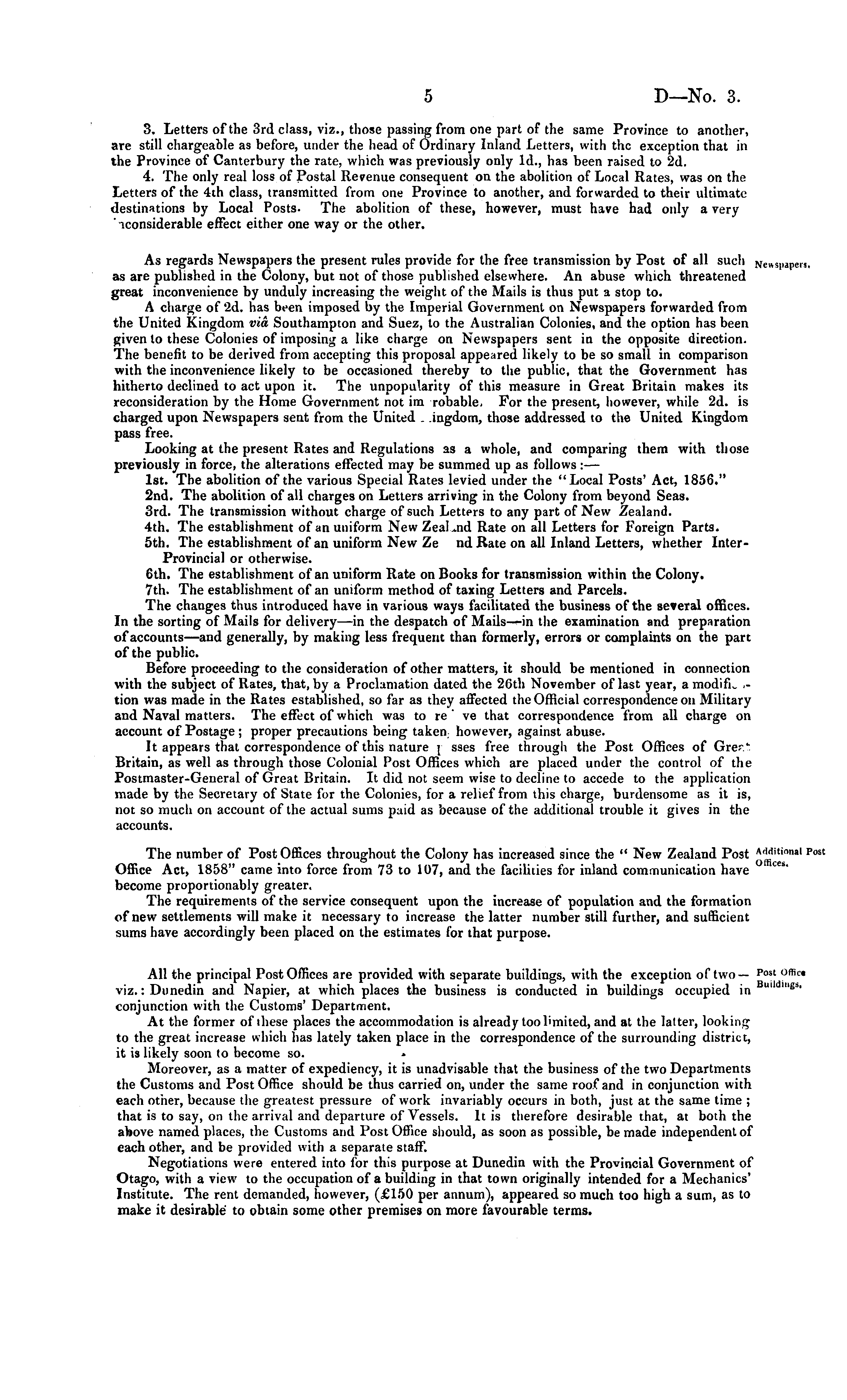 3. Letters of the 3rd class, viz., those passing from one part of the same Province to another, are still chargeable as before, under the head of Ordinary Inland Letters, with the exception that in the Province of Canterbury the rate, which was previously only Id., has been raised to 2d. 4. The only real loss of Postal Revenue consequent on the abolition of Local Rates, was on the Letters of the 4th class, transmitted from one Province to another, and forwarded to their ultimate destinations by Local Posts. The abolition of these, however, must have had only a very ' iconsiderable effect either one way or the other. As regards Newspapers the present rules provide for the free transmission by Post of all such as are published in the Colony, but not of those published elsewhere. An abuse which threatened great inconvenience by unduly increasing the weight of the Mails is thus put a stop to. A charge of 2d. has been imposed by the Imperial Government on Newspapers forwarded from the United Kingdom via, Southampton and Suez, to the Australian Colonies, and the option has been given to these Colonies of imposing a like charge on Newspapers sent in the opposite direction. The benefit to be derived from accepting this proposal appeared likely to be so small in comparison with the inconvenience likely to be occasioned thereby to the public, that the Government has hitherto declined to act upon it. The unpopularity of this measure in Great Britain makes its reconsideration by the Home Government not im robable, For the present, however, while 2d. is charged upon Newspapers sent from the United . ingdom, those addressed to the United Kingdom pass free. Looking at the present Rates and Regulations as a whole, and comparing them with those previously in force, the alterations effected may be summed up as follows: — Ist. The abolition of the various Special Rates levied under the "Local Posts' Act, 1856." 2nd. The abolition of all charges on Letters arriving in the Colony from beyond Seas. 3rd. The transmission without charge of such Letters to any part of New Zealand. 4th. The establishment of an uniform New Zeal .nd Rate on all Letters for Foreign Parts. sth. The establishment of an uniform New Ze nd Rate on all Inland Letters, whether InterProvincial or otherwise. 6th. The establishment of an uniform Rate on Books for transmission within the Colony. 7th. The establishment of an uniform method of taxing Letters and Parcels. The changes thus introduced have in various ways facilitated the business of the several offices. In the sorting of Mails for delivery —in the despatch of Mails—in the examination and preparation of accounts —and generally, by making less frequent than formerly, errors or complaints on the part of the public. Before proceeding to the consideration of other matters, it should be mentioned in connection with the subject of Rates, that, by a Proclamation dated the 26th November of last year, a modifi_ ,- tion was made in the Rates established, so far as they affected the Official correspondence on Military and Naval matters. The effect of which was to re' ye that correspondence from all charge on account of Postage ; proper precautions being taken however, against abuse. It appears that correspondence of this nature \ sses free through the Post Offices of Gre:it Britain, as well as through those Colonial Post Offices which are placed under the control of the Postmaster-General of Great Britain. It did not seem wise to decline to accede to the application made by the Secretary of State for the Colonies, for a relief from this charge, burdensome as it is, not so much on account of the actual sums paid as because of the additional trouble it gives in the accounts. The number of Post Offices throughout the Colony has increased since the " New Zealand Post Office Act, 1858" came into force from 73 to 107, and the facilities for inland communication have become proportionably greater. The requirements of the service consequent upon the increase of population and the formation of new settlements will make it necessary to increase the latter number still further, and sufficient sums have accordingly been placed on the estimates for that purpose. All the principal Post Offices are provided with separate buildings, with the exception of two — viz.: Dunedin and Napier, at which places the business is conducted in buildings occupied in conjunction with the Customs' Department. At the former of these places the accommodation is already too limited, and at the latter, looking to the great increase which has lately taken place in the correspondence of the surrounding district, it is likely soon to become so. Moreover, as a matter of expediency, it is unadvisable that the business of the two Departments the Customs and Post Office should be thus carried on, under the same roof and in conjunction with each other, because the greatest pressure of work invariably occurs in both, just at the same time ; that is to say, on the arrival and departure of Vessels. It is therefore desirable that, at both the above named places, the Customs and Post Office should, as soon as possible, be made independent of each other, and be provided with a separate staff. Negotiations were entered into for this purpose at Dunedin with the Provincial Government of Otago, with a view to the occupation of a building in that town originally intended for a Mechanics' Institute. The rent demanded, however, (£l5O per annum), appeared so much too high a sum, as to make it desirable to obtain some other premises on more favourable terms.