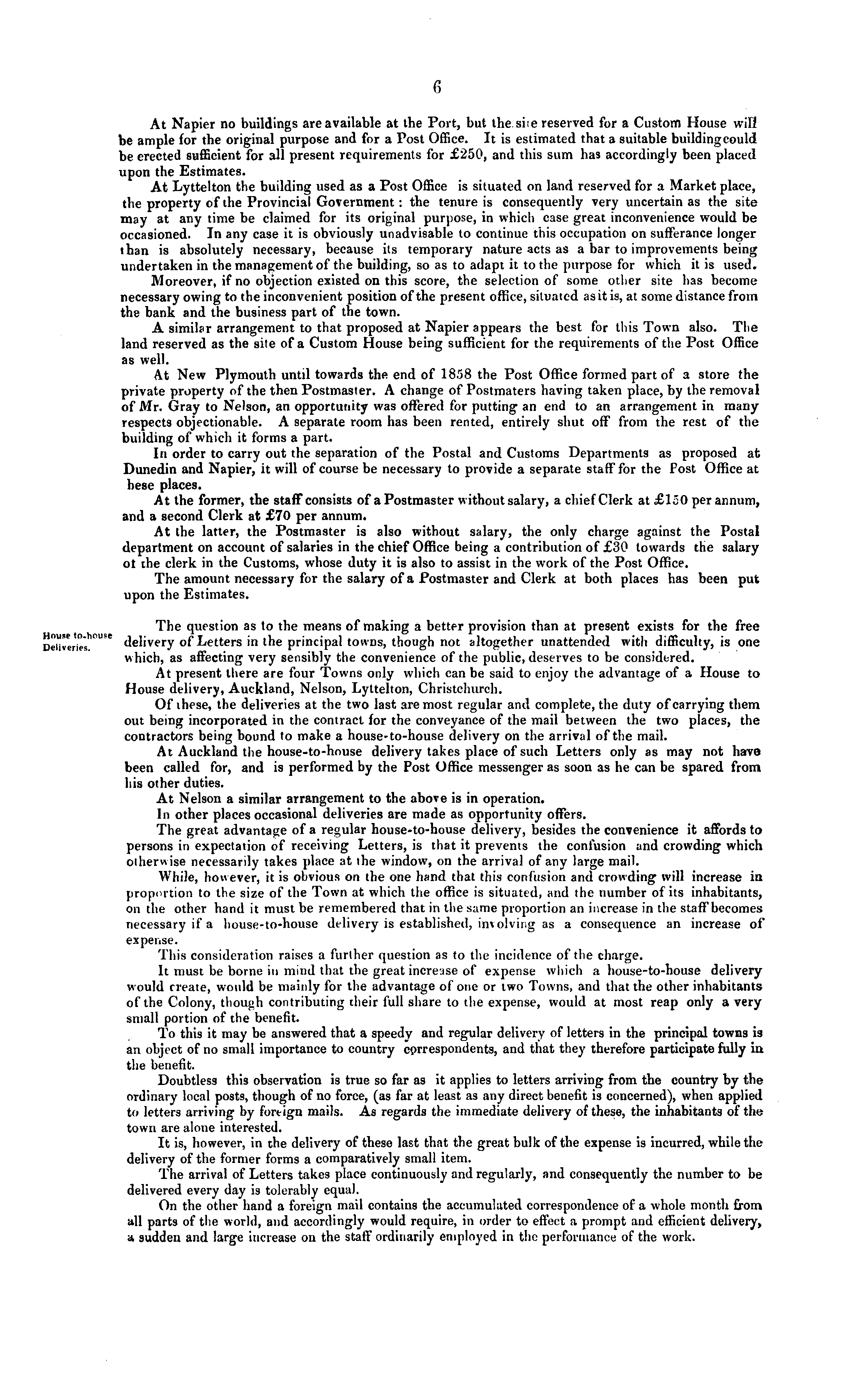 At Napier no buildings are available at the Port, but the she reserved for a Custom House will be ample for the original purpose and for a Post Office. It is estimated that a suitable building could be erected sufficient for all present requirements for £250, and this sum has accordingly been placed upon the Estimates. At Lyttelton the building used as a Post Office is situated on land reserved for a Market place, the property of the Provincial Government: the tenure is consequently very uncertain as the site may at any time be claimed for its original purpose, in which case great inconvenience would be occasioned. In any case it is obviously unadvisable to continue this occupation on sufferance longer than is absolutely necessary, because its temporary nature acts as a bar to improvements being undertaken in the management of the building, so as to adapt it to the purpose for which it is used. Moreover, if no objection existed on this score, the selection of some other site has become necessary owing to the inconvenient position of the present office, situated as it is, at some distance from the bank and the business part of the town. A similsr arrangement to that proposed at Napier appears the best for this Town also. The land reserved as the site of a Custom House being sufficient for the requirements of the Post Office as well. At New Plymouth until towards the end of 18.58 the Post Office formed part of a store the private property of the then Postmaster. A change of Postmaters having taken place, by the removal of Mr. Gray to Nelson, an opportunity was offered for putting an end to an arrangement in many respects objectionable. A separate room has been rented, entirely shut off from the rest of the building of which it forms a part. In order to carry out the separation of the Postal and Customs Departments as proposed at Dunedin and Napier, it will of course be necessary to provide a separate staff for the Post Office at hese places. At the former, the staff consists of aPostmaster without salary, a chief Clerk at £150 per annum, and a second Clerk at £70 per annum. At the latter, the Postmaster is also without salary, the only charge against the Postal department on account of salaries in the chief Office being a contribution of £30 towards the salary ot the clerk in the Customs, whose duty it is also to assist in the work of the Post Office. The amount necessary for the salary of a Postmaster and Clerk at both places has been put upon the Estimates. The question as to the means of making a better provision than at present exists for the free delivery of Letters in the principal towns, though not altogether unattended with difficulty, is one which, as affecting very sensibly the convenience of the public, deserves to be considered. At present there are four Towns only which can be said to enjoy the advantage of a House to House delivery, Auckland, Nelson, Lyttelton, Christchttrch. Of these, the deliveries at the two last are most regular and complete, the duty of carrying them out being incorporated in the contract for the conveyance of the mail between the two places, the contractors being bound to make a house-to-house delivery on the arrival of the mail. At Auckland the house-to-house delivery takes place of such Letters only as may not have been called for, and is performed by the Post Office messenger as soon as he can be spared from his other duties. At Nelson a similar arrangement to the above is in operation. In other places occasional deliveries are made as opportunity offers. The great advantage of a regular house-to-house delivery, besides the convenience it affords to persons in expectation of receiving Letters, is that it prevents the confusion and crowding which otherwise necessarily takes place at the window, on the arrival of any large mail. While, however, it is obvious on the one hand that this confusion and crowding will increase in proportion to the size of the Town at which the office is situated, and the number of its inhabitants, on the other hand it must be remembered that in the same proportion an increase in the staff'becomes necessary if a house-to-house delivery is established, involving as a consequence an increase of expense. This consideration raises a further question as to the incidence of the charge. It must be borne in mind that the great increase of expense which a house-to-house delivery would create, would be mainly for the advantage of one or two Towns, and that the other inhabitants of the Colony, thou»h contributing their full share to the expense, would at most reap only a very small portion of the benefit. To this it may be answered that a speedy and regular delivery of letters in the principal towns is an object of no small importance to country correspondents, and that they therefore participate fully in the benefit. Doubtless this observation is true so far as it applies to letters arriving from the country by the ordinary local posts, though of no force, (as far at least as any direct benefit is concerned), when applied to letters arriving by foreign mails. As regards the immediate delivery of these, the inhabitants of the town are alone interested. It is, however, in the delivery of these last that the great bulk of the expense is incurred, while the delivery of the former forms a comparatively small item. The arrival of Letters takes place continuously and regularly, and consequently the number to be delivered every day is tolerably equal. On the other hand a foreign mail contains the accumulated correspondence of a whole month from all parts of the world, and accordingly would require, in order to effect a prompt and efficient delivery, a sudden and large increase on the staff' ordinarily employed in the performance of the work.