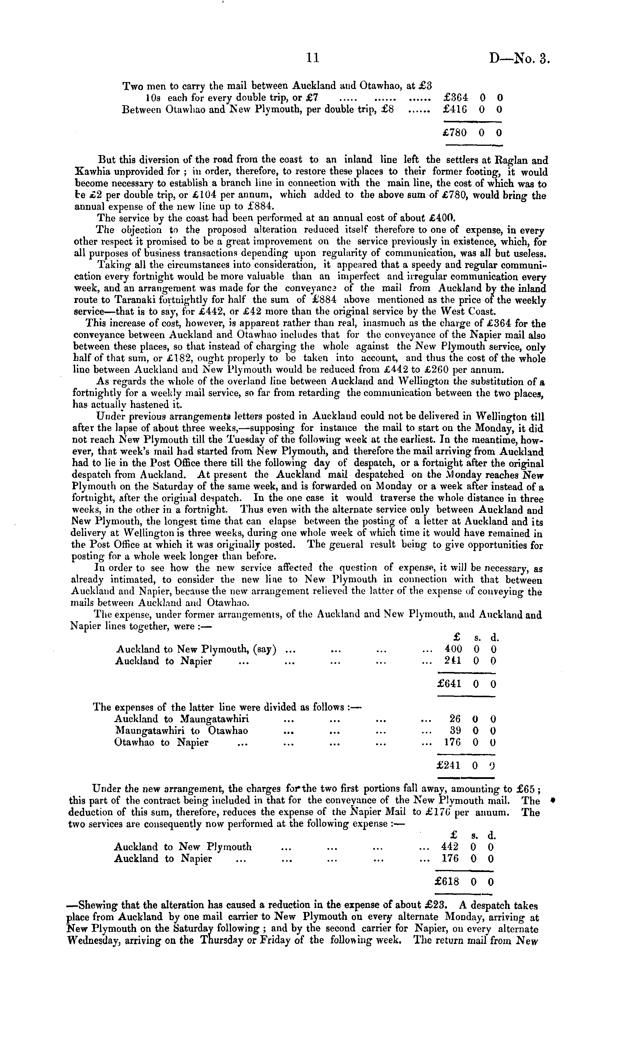 Two men to carry the mail between Auckland and Otawhao, at £3 10s each for every double trip, or £7 £364 0 0 Between Otawhao and New Plymouth, per double trip, £8 £416 0 0 £780 0 0 But this diversion of the road from the coast to an inland line left the settlers at Raglan and Kawhia unprovided for ; in order, therefore, to restore these places to their former footing, it would become necessary to establish a branch line in connection with the main line, the cost of which was to be £2 per double trip, or £104 per annum, which added to the above sum of £780, would bring the annual expense of the new line up to £884, The service by the coast had been performed at an annual cost of about £400. The objection to the proposed alteration reduced itself therefore to one of expense, in every other respect it promised to be a great improvement on the service previously in existence, which, for all purposes of business transactions depending upon regularity of communication, was all but useless. Taking all the circumstances into consideration, it appeared that a speedy and regular communication every fortnight would be more valuable than an imperfect and irregular communication every week, and an arrangement was made for the conveyanca of the mail from Auckland by the inland route to Taranaki fortnightly for half the sum of £'884 above mentioned as the price of the weekly service—that is to say, for £442, or £42 more than the original service by the West Coast. This increase of cost, however, is apparent rather than real, inasmuch as the charge of £364 for the conveyance between Auckland and Otawhao includes that for the conveyance of the Napier mail also between these places, so that instead of charging the whole against the New Plymouth service, only half of that sum, or £182, ought properly to be taken into account, and thus the cost of the whole line between Auckland and New Plymouth would be reduced from £442 to £260 per annum. As regards the whole of the overland line between Auckland and Wellington the substitution of a fortnightly for a weekly mail service, so far from retarding the communication between the two places, has actually hastened it. Under previous arrangements letters posted in Auckland could not be delivered in Wellington till after the lapse of about three weeks, —supposing for instance the mail to start on the Monday, it did not reach New Plymouth till the Tuesday of the following week at the earliest. In the meantime, however, that week's mail had started from New Plymouth, and therefore the mail arriving from Auckland had to lie in the Post Office there till the following day of despatch, or a fortnight after the original despatch from Auckland. At present the Auckland mail despatched on the Monday reaches New Plymouth on the Saturday of the same week, and is forwarded on Monday or a week after instead of a fortnight, after the original despatch. In the one case it would traverse the whole distance in three weeks, in the other in a fortnight. Thus even with the alternate service only between Auckland and New Plymouth, the longest time that can elapse between the posting of a letter at Auckland and its delivery at Wellington is three weeks, during one whole week of which time it would have remained in the Post Office at which it was originally posted. The general result being to give opportunities for posting for a whole week longer than before. In order to see how the new service affected the question of expense, it will be necessary, as already intimated, to consider the new line to New Plymouth in connection with that between Auckland and Napier, because the new arrangement relieved the latter of the expense of conveying the mails between Auckland and Otawhao. The expense, under former arrangements, of the Auckland and New Plymouth, and Auckland and Napier lines together, were : — £ s. d. Auckland to New Plymouth, (say) ... ... ... ... 400 0 0 Auckland to Napier ... ... ... ... ... 241 0 0 £641 0 0 The expenses of the latter line were divided as follows : — Auckland to Maungatawhiri ... ... ... ... 26 0 0 Maungatawhiri to Otawhao ... ... ... ... 39 0 0 Otawhao to Napier ... ... ... ... ... 176 0 0 £241 0 0 Under the new arrangement, the charges for*the two first portions fall away, amounting to £65 ; this part of the contract being included in that for the conveyance of the New Plymouth mail. The deduction of this sum, therefore, reduces the expense of the Napier Mail to £176 per annum. The two services are consequently now performed at the following expense :— £ s. d. Auckland to New Plymouth ... ... ... ... 442 0 0 Auckland to Napier ... ... ... ... ... 176 0 0 £618 0 0 —Shewing that the alteration has caused a reduction in the expense of about £23. A despatch takes place from Auckland by one mail carrier to New Plymouth on every alternate Monday, arriving at New Plymouth on the Saturday following ; and by the second carrier for Napier, on every alternate Wednesday, arriving on the Thursday or Friday of the following week. The return mail from New