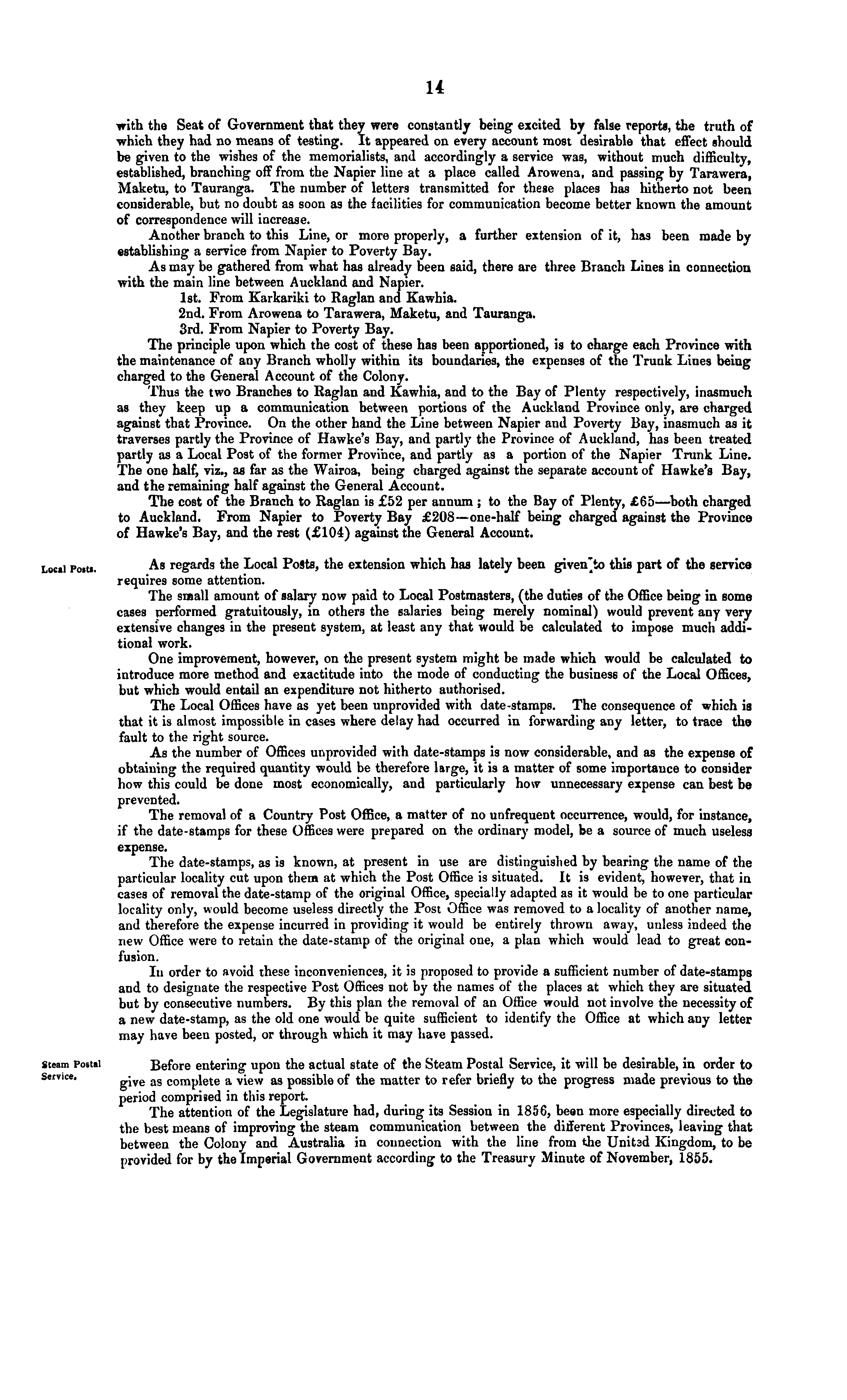 with the Seat of Government that they were constantly being excited by false reports, the truth of which they had no means of testing. It appeared on every account most desirable that effect should be given to the wishes of the memorialists, and accordingly a service was, without much difficulty, established, branching off from the Napier line at a place called Arowena, and passing by Tarawera, Maketu, to Tauranga. The number of letters transmitted for these places has hitherto not been considerable, but no doubt as soon as the facilities for communication become better known the amount of correspondence will increase. Another branch to this Line, or more properly, a further extension of it, has been made by establishing a service from Napier to Poverty Bay. As may be gathered from what has already been said, there are three Branch Lines in connection with the main line between Auckland and Napier. Ist. From Karkariki to Raglan and Kawhia. 2nd. From Arowena to Tarawera, Maketu, and Tauranga. 3rd. From Napier to Poverty Bay. The principle upon which the cost of these has been apportioned, is to charge each Province with the maintenance of any Branch wholly within its boundaries, the expenses of the Trunk Lines being charged to the General Account of the Colony. Thus the two Branches to Raglan and Kawhia, and to the Bay of Plenty respectively, inasmuch as they keep up a communication between portions of the Auckland Province only, are charged against that Province. On the other hand the Line between Napier and Poverty Bay, inasmuch as it traverses partly the Province of Hawke's Bay, and partly the Province of Auckland, has been treated partly as a Local Post of the former Province, and partly as a portion of the Napier Trunk Line. The one half, viz., as far as the Wairoa, being charged against the separate account of Hawke's Bay, and the remaining half against the General Account. The cost of the Branch to Raglan is £52 per annum ; to the Bay of Plenty, £65—both charged to Auckland. From Napier to Poverty Bay £208—one-half being charged against the Province of Hawke's Bay, and the rest (£104) against the General Account. As regards the Local Posts, the extension which has lately been given"to this part of the service requires some attention. The small amount of salary now paid to Local Postmasters, (the duties of the Office being in some cases performed gratuitously, in others the salaries being merely nominal) would prevent any very extensive changes in the present system, at least any that would be calculated to impose much additional work. One improvement, however, on the present system might be made which would be calculated to introduce more method and exactitude into the mode of conducting the business of the Local Offices, but which would entail an expenditure not hitherto authorised. The Local Offices have as yet been unprovided with date-stamps. The consequence of which is that it is almost impossible in cases where delay had occurred in forwarding any letter, to trace the fault to the right source. As the number of Offices unprovided with date-stamps is now considerable, and as the expense of obtaining the required quautity would be therefore large, it is a matter of some importance to consider how this could be done most economically, and particularly how unnecessary expense can best be prevented. The removal of a Country Post Office, a matter of no unfrequent occurrence, would, for instance, if the date-stamps for these Offices were prepared on the ordinary model, be a source of much useless expense. The date-stamps, as is known, at present in use are distinguished by bearing the name of the particular locality cut upon them at which the Post Office is situated. It is evident, however, that in cases of removal the date-stamp of the original Office, specially adapted as it would be to one particular locality only, would become useless directly the Post Office was removed to a locality of another name, and therefore the expense incurred in providing it would be entirely thrown away, unless indeed the new Office were to retain the date-stamp of the original one, a plan which would lead to great confusion. In order to avoid these inconveniences, it is proposed to provide a sufficient number of date-stamps and to designate the respective Post Offices not by the names of the places at which they are situated but by consecutive numbers. By this plan the removal of an Office would not involve the necessity of a new date-stamp, as the old one would be quite sufficient to identify the Office at which any letter may have been posted, or through which it may have passed. Before entering upon the actual state of the Steam Postal Service, it will be desirable, in order to give as complete a view as possible of the matter to refer briefly to the progress made previous to the period comprised in this report. The attention of the Legislature had, during its Session in 1856, bean more especially directed to the best means of improving the steam communication between the different Provinces, leaving that between the Colony and Australia in connection with the line from the Unit3d Kingdom, to be provided for by the Imperial Government according to the Treasury Minute of November, 1855.