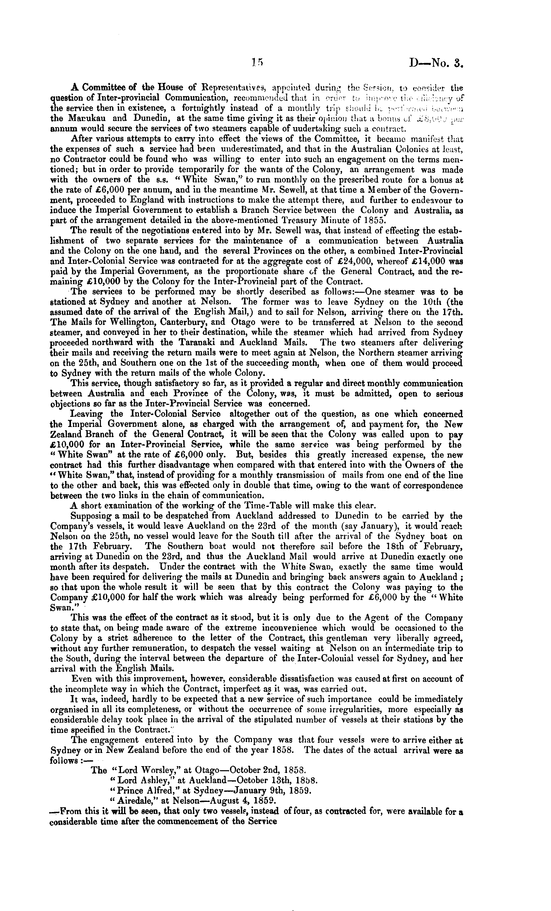 A Committee of the House of Representatives, appointed during the Session, to consider the question of Inter-provincial Communication, recommended that in order to improve the efficiency of the service then in existence, a fortnightly instead of a monthly trip should i the Macukau and Dunedin, at the same time giving it as their opinion that a bonus of £8,000 per annum would secure the services of two steamers capable of uudertaking such a contract. After various attempts to carry into effect the views of the Committee, it became manifest that the expenses of such a service had been underestimated, and that in the Australian Colonies at least, no Contractor could be found who was willing to enter into such an engagement on the terms mentioned; but in order to provide temporarily for the wants of the Colony, an arrangement was made with the owners of the s.s. " White Swan," to run monthly on the prescribed route for a bonus at the rate of £6,000 per annum, and in the meantime Mr. Sewell, at that time a Member of the Government, proceeded to England with instructions to make the attempt there, and further to endeavour to induce the Imperial Government to establish a Branch Service between the Colony and Australia, as part of the arrangement detailed in the above-mentioned Treasury Minute of 1855. The result of the negotiations entered into by Mr. Sewell was, that instead of effecting the establishment of two separate services for the maintenance of a communication between Australia and the Colony on the one hand, and the several Provinces on the other, a combined Inter-Provincial and Inter-Colonial Service was contracted for at the aggregate cost of £24,000, whereof £14,000 was paid by the Imperial Government, as the proportionate share of the General Contract, and the remaining £10,000 by the Colony for the Inter-Provincial part of the Contract. The services to be performed may be shortly described as follows:—One steamer was to be stationed at Sydney and another at Nelson. The former was to leave Sydney on the 10th (the assumed date of the arrival of the English Mail,) and to sail for Nelson, arriving there on the 17th. The Mails for Wellington, Canterbury, and Otago were to be transferred at Nelson to the second steamer, and conveyed in her to their destination, while the steamer which had arrived from Sydney proceeded northward with the Taranaki and Auckland Mails. The two steamers after delivering their mails and receiving the return mails were to meet again at Nelson, the Northern steamer arriving on the 25th, and Southern one on the Ist of the succeeding month, when one of them would proceed to Sydney with the return mails of the whole Colony. This service, though satisfactory so far, as it provided a regular and direct monthly communication between Australia and each Province of the Colony, was, it must be admitted, open to serious objections so far as the Inter-Provincial Service was concerned. Leaving the Inter-Colonial Service altogether out of the question, as one which concerned the Imperial Government alone, as charged with the arrangement of, and payment for, the New Zealand Branch of the General Contract, it will be seen that the Colony was called upon to pay £10,000 for an Inter-Provincial Service, while the same service was being performed by the " White Swan" at the rate of £6,000 only. But, besides this greatly increased expense, the new contract had this further disadvantage when compared with that entered into with the Owners of the "White Swan," that, instead of providing for a monthly transmission of mails from one end of the line to the other and back, this was effected only in double that time, owing to the want of correspondence between the two links in the chain of communication. A short examination of the working of the Time-Table will make this clear. Supposing a mail to be despatched from Auckland addressed to Dunedin to be carried by the Company's vessels, it would leave Auckland on the 23rd of the month (say January), it would reach Nelson on the 25th, no vessel would leave for the South till after the arrival of the Sydney boat on the 17th February. The Southern boat would not therefore sail before the 18th of February, arriving at Dunedin on the 23rd, and thus the Auckland Mail would arrive at Dunedin exactly one month after its despatch. Under the contract with the White Swan, exactly the same time would have been required for delivering the mails at Dunedin and bringing back answers again to Auckland ; so that upon the whole result it will be seen that by this contract the Colony was paying to the Company £10,000 for half the work which was already being performed for £6,000 by the " White Swan." This was the effect of the contract as it stood, but it is only due to the Agent of the Company to state that, on being made aware of the extreme inconvenience which would be occasioned to the Colony by a strict adherence to the letter of the Contract, this gentleman very liberally agreed, without any further remuneration, to despatch the vessel waiting at Nelson on an intermediate trip to the South, during the interval between the departure of the Inter-Colonial vessel for Sydney, and her arrival with the English Mails. Even with this improvement, however, considerable dissatisfaction was caused at first on account of the incomplete way in which the Contract, imperfect as it was, was carried out. It was, indeed, hardly to be expected that a new service of such importance could be immediately organised in all its completeness, or without the occurrence of some irregularities, more especially as considerable delay took place in the arrival of the stipulated number of vessels at their stations by the time specified in the Contract." The engagement entered into by the Company was that four vessels were to arrive either at Sydney or in New Zealand before the end of the year 1858. The dates of the actual arrival were as follows :— The "Lord Worsley," at