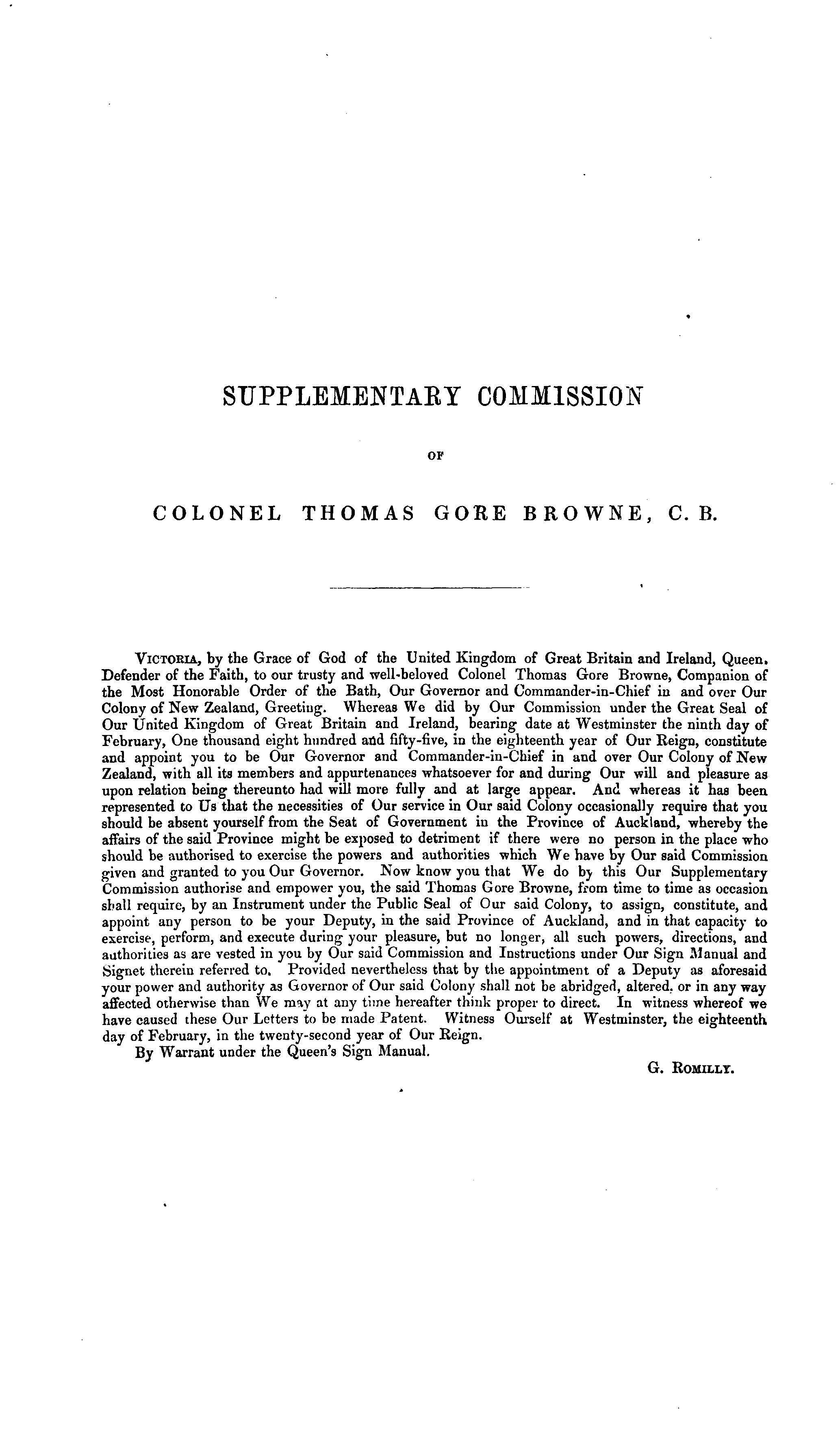 Victoria, by the Grace of God of the United Kingdom of Great Britain and Ireland, Queen. Defender of the Faith, to our trusty and well-beloved Colonel Thomas Gore Browne, Companion of the Most Honorable Order of the Bath, Our Governor and Commander-in-Chief in and over Our Colony of New Zealand, Greeting. Whereas We did by Our Commission under the Great Seal of Our United Kingdom of Great Britain and Ireland, bearing date at Westminster the ninth day of February, One thousand eight hundred and fifty-five, in the eighteenth year of Our Reign, constitute and appoint you to be Our Governor and Commander-in-Chief in and over Our Colony of New Zealand, with all its members and appurtenances whatsoever for and during Our will and pleasure as upon relation being thereunto had will more fully and at large appear. And whereas it has been represented to Us that the necessities of Our service in Our said Colony occasionally require that you should be absent yourself from the Seat of Government in the Province of Auckland, whereby the affairs of the said Province might be exposed to detriment if there were no person in the place who should be authorised to exercise the powers and authorities which We have by Our said Commission given and granted to you Our Governor. Now know you that We do by this Our Supplementary Commission authorise and empower you, the said Thomas Gore Browne, from time to time as occasion shall require, by an Instrument under the Public Seal of Our said Colony, to assign, constitute, and appoint any person to be your Deputy, in the said Province of Auckland, and in that capacity to exercise, perform, and execute during your pleasure, but no longer, all such powers, directions, and authorities as are vested in you by Our said Commission and Instructions under Our Sign Manual and Signet therein referred to. Provided nevertheless that by the appointment of a Deputy as aforesaid your power and authority as Governor of Our said Colony shall not be abridged, altered, or in any way affected otherwise than We may at any time hereafter think proper to direct. In witness whereof we have caused these Our Letters to be made Patent. Witness Ourself at Westminster, the eighteenth day of February, in the twenty-second year of Our Reign. By Warrant under the Queen's Sign Manual. G. Romilly.