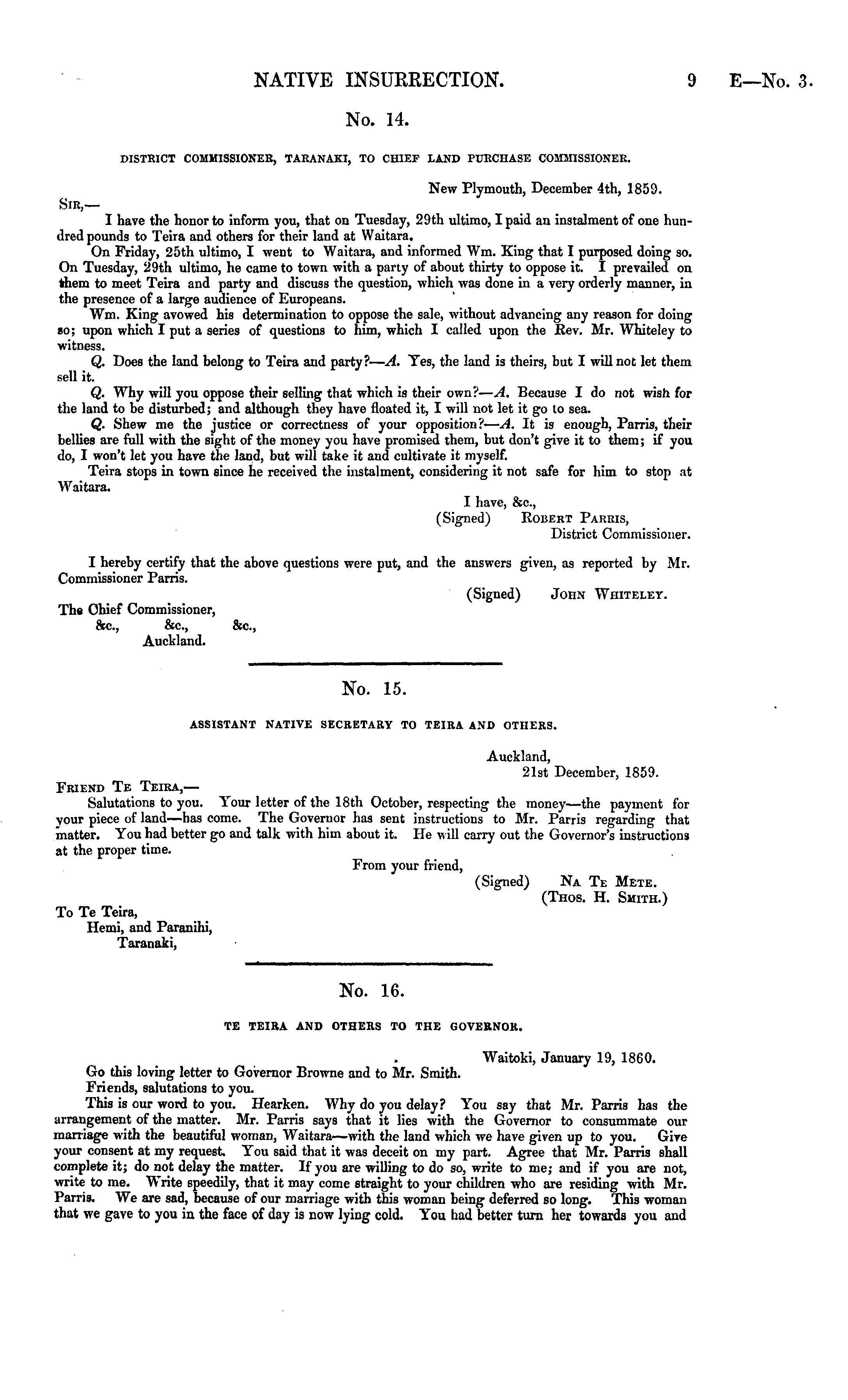 No. 16. TE TEIRA AND OTHERS TO THE GOVERNOR. Waitoki, January 19, 1860. Go this loving letter to Governor Browne and to Mr. Smith. Friends, salutations to you. This is our word to you. Hearken. Why do you delay? You say that Mr. Parris has the arrangement of the matter. Mr. Parris says that it lies with the Governor to consummate our marriage with the beautiful woman, Waitara—with the land which we have given up to you. Give your consent at my request. You said that it was deceit on my part. Agree that Mr. Parris shall complete it; do not delay the matter. If you are willing to do so, write to me; and if you are not, write to me. Write speedily, that it may come straight to your children who are residing with Mr. Parris. We are sad, because of our marriage with this woman being deferred so long. This woman that we gave to you in the face of day is now lying cold. You had better turn her towards you and