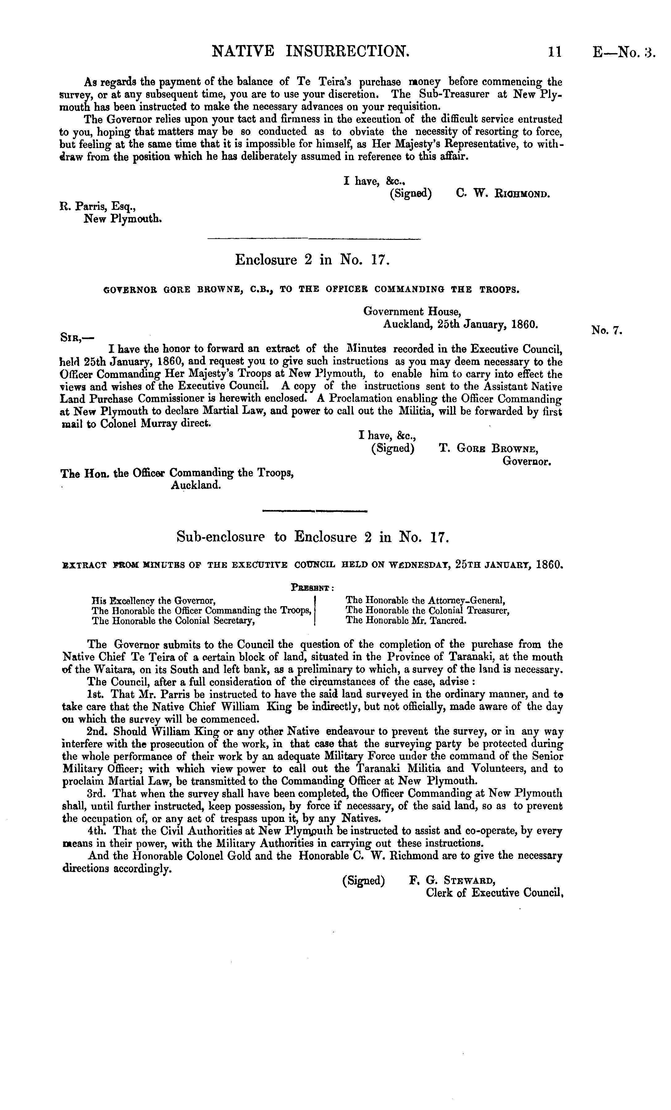 As regards the payment of the balance of Te Teira's purchase money before commencing the survey, or at any subsequent time, you are to use your discretion. The Sub-Treasurer at New Plymouth has been instructed to make the necessary advances on your requisition. The Governor relies upon your tact and firmness in the execution of the difficult service entrusted to you, hoping that matters may be so conducted as to obviate the necessity of resorting to force, but feeling at the same time that it is impossible for himself, as Her Majesty's Representative, to withdraw from the position which he has deliberately assumed in reference to this affair. I have, &c. (Signed) C. W. EiOhmond. R. Parris, Esq., New Plymouth. Enclosure 2 in No. 17. GOVERNOR GORE BROWNE, C.8., TO THE OFFICER COMMANDING THE TROOPS. Government House, Auckland, 25th January, 1860. Sir, — I have the honor to forward an extract of the Minutes recorded in the Executive Council, held 25th January, 1860, and request you to give such instructions as you may deem necessary to the Officer Commanding Her Majesty's Troops at New Plymouth, to enable him to carry into effect the views and wishes of the Executive Council. A copy of the instructions sent to the Assistant Native Land Purchase Commissioner is herewith enclosed. A Proclamation enabling the Officer Commanding at New Plymouth to declare Martial Law, and power to call out the Militia, will be forwarded by first mail to Colonel Murray direct. I have, &c, (Signed) T. Gore Browne, Governor. The Hon. the Officer Commanding the Troops, Auckland. Sub-enclosure to Enclosure 2 in No. 17. EXTRACT FROM MINUTBS OF THE EXECUTIVE COtTNCIL HELD ON WEDNESDAY, 25TH JANUART, 1860. PttESBNT: His Excellency the Governor, The Honorable the Attorney-General, The Honorable the Officer Commanding the Troops, The Honorable the Colonial Treasurer, The Honorable the Colonial Secretary, The Honorable Mr. Tancred. The Governor submits to the Council the question of the completion of the purchase from the Native Chief Te Teira of a certain block of land, situated in the Province of Taranaki, at the mouth of the Waitara, on its South and left bank, as a preliminary to which, a survey of the land is necessary. The Council, after a full consideration of the circumstances of the case, advise : Ist. That Mr. Parris be instructed to have the said land surveyed in the ordinary manner, and te take care that the Native Chief William King be indirectly, but not officially, made aware of the day on which the survey will be commenced. 2nd. Should William King or any other Native endeavour to prevent the survey, or in any way interfere with the prosecution of the work, in that case that the surveying party be protected during the whole performance of their work by an adequate Military Force under the command of the Senior Military Officer; with which view power to call out the Taranaki Militia and Volunteers, and to proclaim Martial Law, be transmitted to the Commanding Officer at New Plymouth. 3rd. That when the survey shall have been completed, the Officer Commanding at New Plymouth shall, until further instructed, keep possession, by force if necessary, of the said land, so as to prevent the occupation of, or any act of trespass upon it, by any Natives. 4th. That the Civil Authorities at New Plymouth be instructed to assist and co-operate, by every means in their power, with the Military Authorities in carrying out these instructions. And the Honorable Colonel Gold and the Honorable C. W. Richmond are to give the necessary directions accordingly. (Signed) F. G. Steward, Clerk of Executive Council,