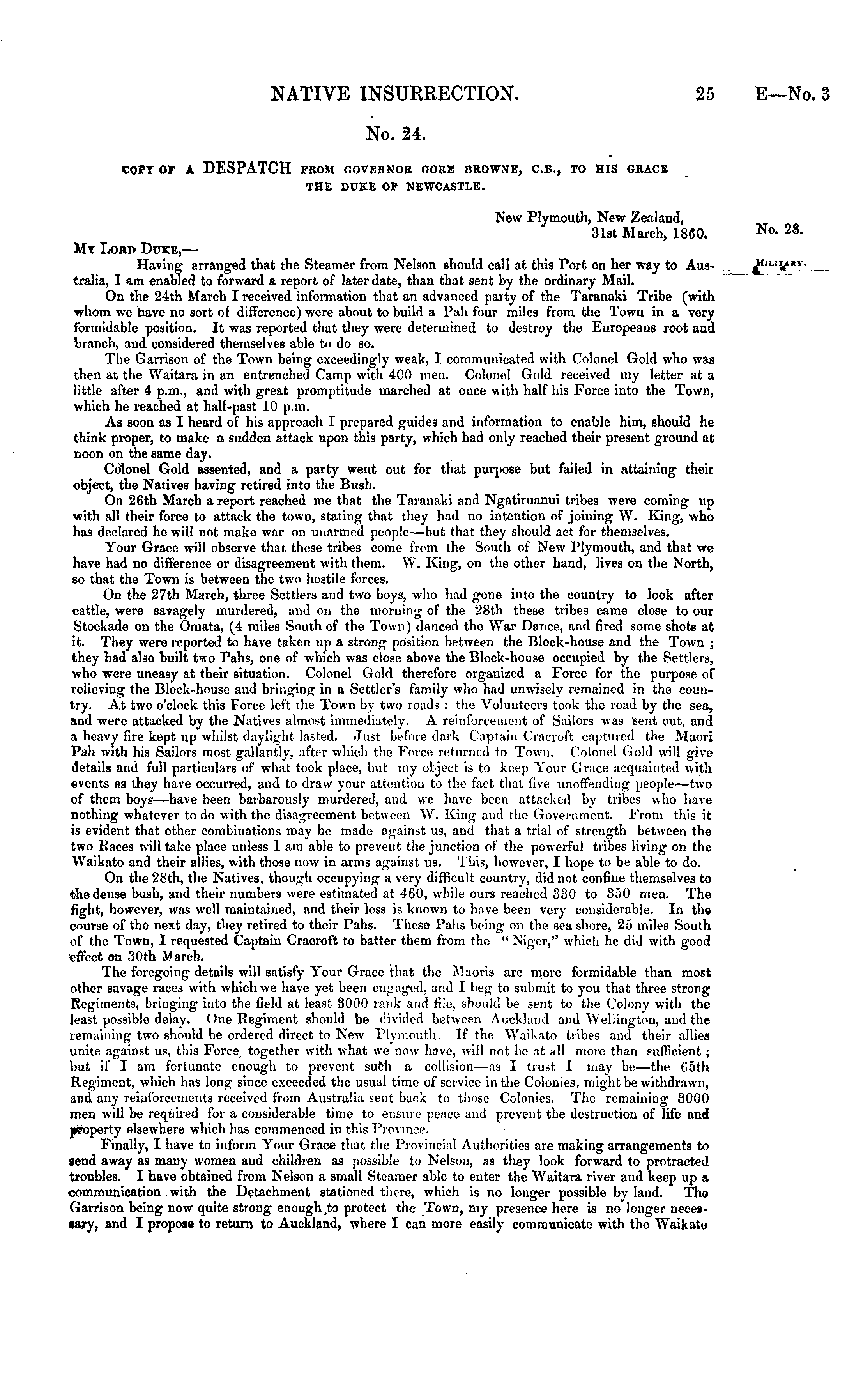 copy or Jl DESPATCH from governor gore browxe, c.b., to his grace THE DUKE OF NEWCASTLE. New Plymouth, New Zealand, 31st March, 1860. My Lord Duke, — Having arranged that the Steamer from Nelson should call at this Port on her way to Australia, I am enabled to forward a report of later date, than that sent by the ordinary Mail. On the 24th March I received information that an advanced party of the Taranaki Tribe (witli whom we have no sort of difference) were about to build a Pah four miles from the Town in a very formidable position. It was reported that they were determined to destroy the Europeans root and branch, and considered themselves able to do so. The Garrison of the Town being exceedingly weak, I communicated with Colonel Gold who was then at the Waitara in an entrenched Camp with 400 men. Colonel Gold received my letter at a little after 4 p.m., and with great promptitude marched at once with half his Force into the Town, which he reached at half-past 10 p.m. As soon as I heard of his approach I prepared guides and information to enable him, should he think proper, to make a sudden attack upon this party, which had only reached their present ground at noon on the same day. Colonel Gold assented, and a party went out for that purpose but failed in attaining their object, the Natives having retired into the Bush. On 26th March a report reached me that the Taranaki and Ngatiruanui tribes were coming up with all their force to attack the town, stating that they had no intention of joining W. King, who has declared he will not make war on unarmed people—but that they should act for themselves. Your Grace will observe that these tribes come from the South of New Plymouth, and that we have had no difference or disagreement with them. W. King, on the other hand, lives on the North, so that the Town is between the two hostile forces. On the 27th March, three Settlers and two boys, who had gone into the country to look after cattle, were savagely murdered, and on the morning of the 28th these tribes came close to our Stockade on the Omata, (4 miles South of the Town) danced the War Dance, and fired some shots at it. They were reported to have taken up a strong position between the Block-house and the Town ; they had also built two Pahs, one of which was close above the Block-house occupied by the Settlers, who were uneasy at their situation. Colonel Gold therefore organized a Force for the purpose of relieving the Block-house and bringing in a Settler's family who had unwisely remained in the country. At two o'clock this Force left the Town by two roads : the Volunteers took the road by the sea, and wero attacked by the Natives almost immediately. A reinforcement of Sailors was sent out, and a heavy fire kept up whilst daylight lasted. Just before dark Captain Cracroft captured the Maori Pah with his Sailors most gallantly, after which the Force returned to Town. Colonel Gold will give details and full particulars of what took place, but my object is to keep Your Grace acquainted with events as they have occurred, and to draw your attention to the fact that five unoffending people—two of them boys—have been barbarously murdered, and we have been attacked by tribes who have nothing whatever to do with the disagreement between W. King and the Government. From this it is evident that other combinations may be made against us, and that a trial of strength between the two Kaces will take place unless I am able to prevent the junction of the powerful tribes living on the Waikato and their allies, with those now in arms against us. This, however, I hope to be able to do. On the 28th, the Natives, though occupying a very difficult country, did not confine themselves to the dense bush, and their numbers were estimated at 460, while ours reached 330 to 350 men. The fight, however, was well maintained, and their loss is known to hnve been very considerable. In the course of the next day, they retired to their Pahs. These Pahs being on the sea shore, 25 miles South of the Town, I requested Captain Cracroft to batter them from the " Niger," which he did with good effect on 30th March. The foregoing details will satisfy Your Grace that the Maoris are more formidable than most other savage races with which we have yet been engaged, and I beg to submit to you that three strong Regiments, bringing into the field at least 3000 rank and file, should be sent to the Colony with the least possible delay. One Regiment should be divided between Auckland and Wellington, and the remaining two should be ordered direct to New Plymouth. If the Waikato tribes and their allies unite against us, this Force, together with what wo now have, will not be at all more than sufficient ; but if I am fortunate enough to prevent such a collision —as I trust I may be—the 65th Regiment, which has long since exceeded the usual time of service in the Colonies, might be withdrawn, and any reinforcements received from Australia sent bank to those Colonies. The remaining 3000 men will be required for a considerable time to ensure pence and prevent the destruction of life and property elsewhere which has commenced in this Province. Finally, I have to inform Your Grace that the Provincial Authorities are making arrangements to send away as many women and children as possible to Nelson, as they look forward to protracted troubles. I have obtained from Nelson a small Steamer able to enter the Waitara river and keep up a communication with the Detachment stationed there, which is no longer possible by land. Tha Garrison being now quite strong enough to protect the Town, my presence here is no longer necessary, and I propose to return to Auckland, where I can more easily communicate with the Waikato