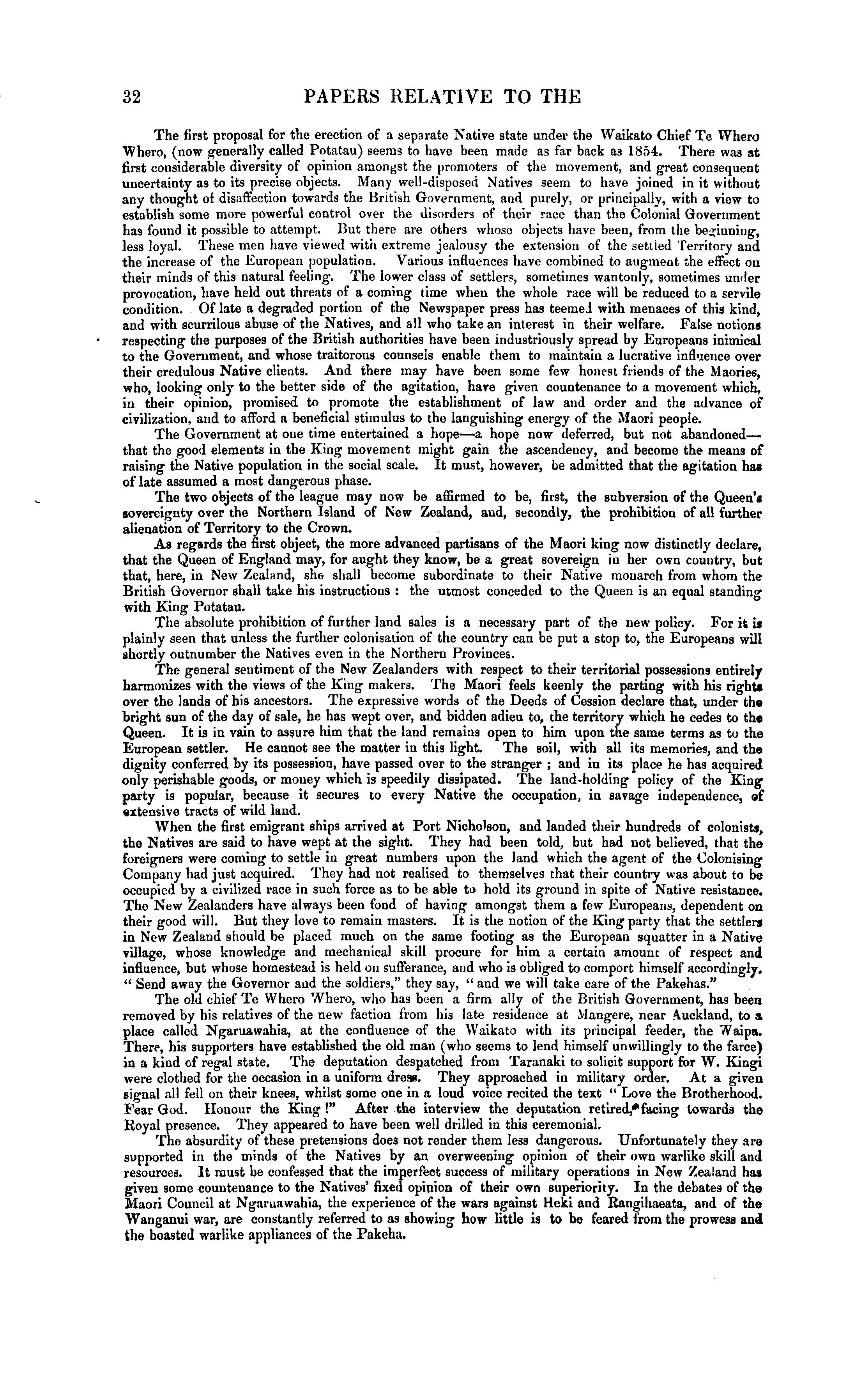 The first proposal for the erection of a separate Native state under the Waikato Chief Te Whero Whero, (now generally called Potatau) seems to have been made as far back a3 1854. There was at first considerable diversity of opinion amongst the promoters of the movement, and great consequent uncertainty as to its precise objects. Many well-disposed Natives seem to have joined in it without any thought of disaffection towards the British Government, and purely, or principally, with a view to establish some more powerful control over the disorders of their race than the Colonial Government has found it possible to attempt. But there are others whoso objects have been, from the beginning , , less loyal. These men have viewed with extreme jealousy the extension of the settled Territory and the increase of the European population. Various influences have combined to augment the effect on their minds of tliis natural feeling. The lower class of settlers, sometimes wantonly, sometimes utuler provocation, have held out threats of a coming time when the whole race will be reduced to a servile condition. Of late a degraded portion of the Newspaper press has teemei with menaces of this kind, and with scurrilous abuse of the Natives, and all who take an interest in their welfare. False notions respecting the purposes of the British authorities have been industriously spread by Europeans inimical to the Government, and whose traitorous counsels enable them to maintain a lucrative influence over their credulous Native clients. And there may have been some few honest friends of the Maories, ■who, looking only to the better side of the agitation, have given countenance to a movement which, in their opinion, promised to promote the establishment of law and order and the advance of civilization, and to afford a beneficial stimulus to the languishing energy of the Maori people. The Government at one time entertained a hope—a hope now deferred, but not abandoned— that the good elements in the King movement might gain the ascendency, and become the means of raising the Native population in the social scale. It must, however, be admitted that the agitation has of late assumed a most dangerous phase. The two objects of the league may now be affirmed to be, first, the subversion of the Queen's sovereignty over the Northern Island of New Zealand, and, secondly, the prohibition of all further alienation of Territory to the Crown. As regards the first object, the more advanced partisans of the Maori king now distinctly declare, that the Queen of England may, for aught they know, be a great sovereign in her own country, but that, here, in New Zealand, she shall become subordinate to their Native monarch from whom the British Governor shall take his instructions : the utmost conceded to the Queen is an equal standing with King Potatau. The absolute prohibition of further land sales is a necessary part of the new policy. For it is plainly seen that unless the further colonisation of the country can be put a stop to, the Europeans will shortly outnumber the Natives even in the Northern Provinces. The general sentiment of the New Zealanders with respect to their territorial possessions entirely harmonizes with the views of the King makers. The Maori feels keenly the parting with his right* over the lands of his ancestors. The expressive words of the Deeds of Cession declare that, under the bright sun of the day of sale, he has wept over, and bidden adieu to, the territory which he cedes to the Queen. It is in vain to assure him that the land remains open to him upon the same terms as to the European settler. He cannot see the matter in this light. The soil, with all its memories, and the dignity conferred by its possession, have passed over to the stranger ; and in its place he has acquired only perishable goods, or money which is speedily dissipated. The land-holding policy of the King party is popular, because it secures to every Native the occupation, in savage independence, of extensive tracts of wild land. When the first emigrant ships arrived at Port Nicholson, and landed their hundreds of colonists, the Natives are said to have wept at the sight. They had been told, but had not believed, that the foreigners were coming to settle in great numbers upon the land which the agent of the Colonising Company had just acquired. They had not realised to themselves that their country was about to be occupied by a civilized race in such force as to be able to hold its ground in spite of Native resistance. The New Zealanders have always been fond of having amongst them a few Europeans, dependent on their good will. But they love to remain masters. It is the notion of the King party that the settlers in New Zealand should be placed much on the same footing as the European squatter in a Native village, whose knowledge and mechanical skill procure for him a certain amount of respect and influence, but whose homestead is held on sufferance, and who is obliged to comport himself accordingly. " Send away the Governor and the soldiers," they say, " and we will take care of the Pakehas." The old chief Te Whero Whero, who has buen a firm ally of the British Government, has been removed by his relatives of the new faction from his late residence at Mangere, near Auckland, to a place called Ngaruawahia, at the confluence of the Waikato with its principal feeder, the Waipa. There, his supporters have established the old man (who seems to lend himself unwillingly to the farce) in a kind of regal state. The deputation despatched from Taranaki to solicit support for W. Kingi were clothed for the occasion in a uniform dreas. They approached in military order. At a given signal all fell on their knees, whilst some one in a loud voice recited the text " Love the Brotherhood. Fear God. Honour the King !" After the interview the deputation retired,*facing towards the Royal presence. They appeared to have been well drilled in this ceremonia