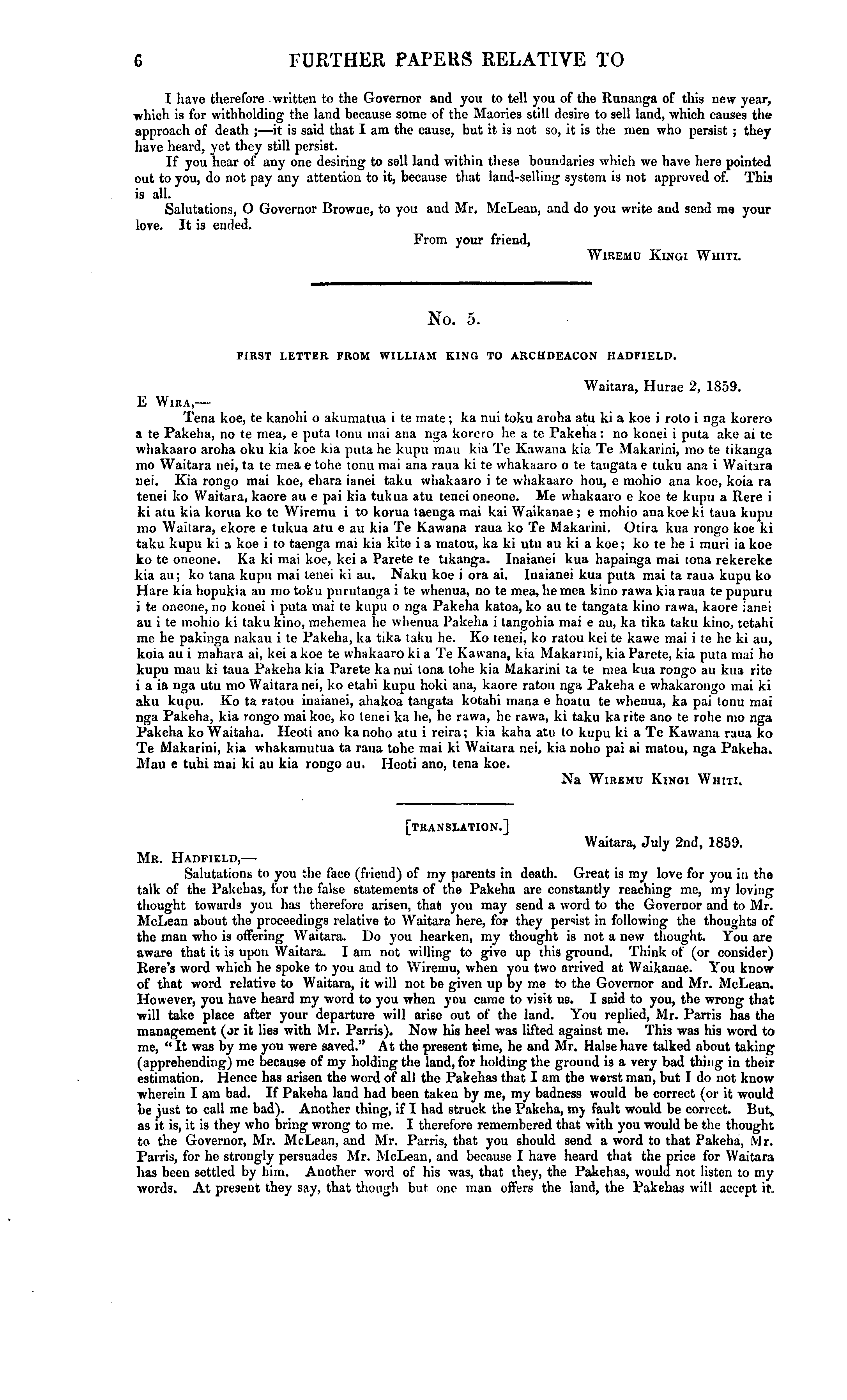 I have therefore written to the Governor and you to tell you of the Runanga of this new year, which is for withholding the land because some of the Maories still desire to sell land, which causes the approach of death ; —it is said that lam the cause, but it is not so, it is the men who persist ; they have heard, yet they still persist. If you hear of any one desiring to sell land within these boundaries which we have here pointed out to you, do not pay any attention to it, because that land-selling system is not approved of. This is all. Salutations, O Governor Browne, to you and Mr. McLean, and do you write and send me your love. It is ended. From your friend, WIREMU KINGI WIIITI. No. 5. FIRST LETTER FROM WILLIAM KING TO ARCHDEACON HADFIELD. Waitara, Hurae 2, 1859. E Wiea,— Tena koe, te kanohi o akumatua ite mate; ka nui toku aroha atu ki a koe i roto i nga korero ate Pakeha, no te mea, c puta tonu mai ana nga korero he ate Pakeha: no konei i puta ake ai te whakaaro aroha oku kia koe kia puta he kupu man kia Te Kawana kia Te Makarini, mo te tikanga mo Waitara nei, ta te mea c tohe tonu mai ana raua kite whakaaro o te tangata c tuku ana i Waitara nei. Kia rongo mai koe, ehara ianei taku whakaaro ite whakaaro hou, c mohio aria koe, koia ra tenei ko Waitara, kaore au c pai kia tukua atu teneioneone. Me whakaaro c koe te kupu a Rere i ki atu kia korua ko te Wiremu i to korua taenga inai kai Waikanae ; c mohio ana koe ki taua kupu mo Waitara, ekore c tukua atu eau kia Te Kawana raua ko Te Makarini. Otira kua rongo koe ki taku kupu ki a koe i to taenga mai kia kite i a matou, ka ki utu au ki a koe; ko te he i muri ia koe ko te oneone. Ka ki mai koe, kei a Parete te tikanga. Inaianei kua hapainga mai tona rekereke kia au; ko tana kupu mai tenei ki au. Naku koe i ora ai. Inaianei kua puta mai ta raua kupu ko Hare kia hopukia au mo toku purutanga i te whenua, no te mea, he mea kino rawa kia raua te pupuru i te oneone, no konei i puta mai te kupu o nga Pakeha katoa, ko au te tangata kino rawa, kaore ianei au i te mohio ki taku kino, mehemea he whenua Pakeha i tangohia mai c au, ka tika taku kino, tetahi me he pakinga nakau ite Pakeha, ka tika taku he. Ko tenei, ko ratou kei te kawe mai itehe ki au, koia au i mahara ai, kei a koe te whakaaro ki a Te Kawana, kia Makarini, kia Parete, kia puta mai he kupu mau ki taua Pakeha kia Parete ka nui tona tohe kia Makarini ta te mea kua rongo au kua rite i a ia nga utu mo Waitara nei, ko etahi kupu hoki ana, kaore ratou nga Pakeha c whakarongo mai ki aku kupu. Ko ta ratou inaianei, ahakoa tangata kotahi mana c hoatu te whenua, ka pai tonu mai nga Pakeha, kia rongo mai koe, ko tenei ka he, he rawa, he rawa, ki taku karite ano te rohe mo nga Pakeha ko Waitaha. Heoti ano kanoho atu i reira; kia kaha atu to kupu ki aTe Kawana raua ko Te Makarini, kia whakamutua ta raua tohe mai ki Waitara nei, kia noho pai ai matou, nga Pakeha. Mau c tuhi mai ki au kia rongo au. Heoti ano, tena koe. Na Wiremu Kinoi Whiti. [translation.] Waitara, July 2nd, 1859. Mr. Hadfield, — Salutations to you the face (friend) of my parents in death. Great is my love for you in the talk of the Pakehas, for the false statements of the Pakeha are constantly reaching me, my loving thought towards you has therefore arisen, that you may send a word to the Governor and to Mr. McLean about the proceedings relative to Waitara here, for they persist in following the thoughts of the man who is offering Waitara. Do you hearken, my thought is not a new thought. You are aware that it is upon Waitara. lam not willing to give up this ground. Think of (or consider) Here's word which he spoke to you and to Wiremu, when you two arrived at Waikanae. You know of that word relative to Waitara, it will not be given up by me to the Governor and Mr. McLean. However, you have heard my word to you when you came to visit us. I said to you, the wrong that ■will take place after your departure will arise out of the land. You replied, Mr. Parris has the management (or it lies with Mr. Parris). Now his heel was lifted against me. This was his word to me, "It was by me you were saved." At the present time, he and Mr. Halsehave talked about taking (apprehending) me because of my holding the land, for holding the ground is a very bad thing , in their estimation. Hence has arisen the word of all the Pakehas that lam the werst man, but Ido not know wherein lam bad. If Pakeha land had been taken by me, my badness would be correct (or it would be just to call me bad). Another thing, if I had struck the Pakeha, my fault would be correct. But, as it is, it is they who bring wrong to me. I therefore remembered that with you would be the thought to the Governor, Mr. McLean, and Mr. Parris, that you should send a word to that Pakeha, Mr. Parris, for he strongly persuades Mr. McLean, and because I have heard that the price for Waitara has been settled by him. Another word of his was, that they, the Pakehas, would not listen to my words. At present they say, that though but one man offers the land, the Pakehas will accept it