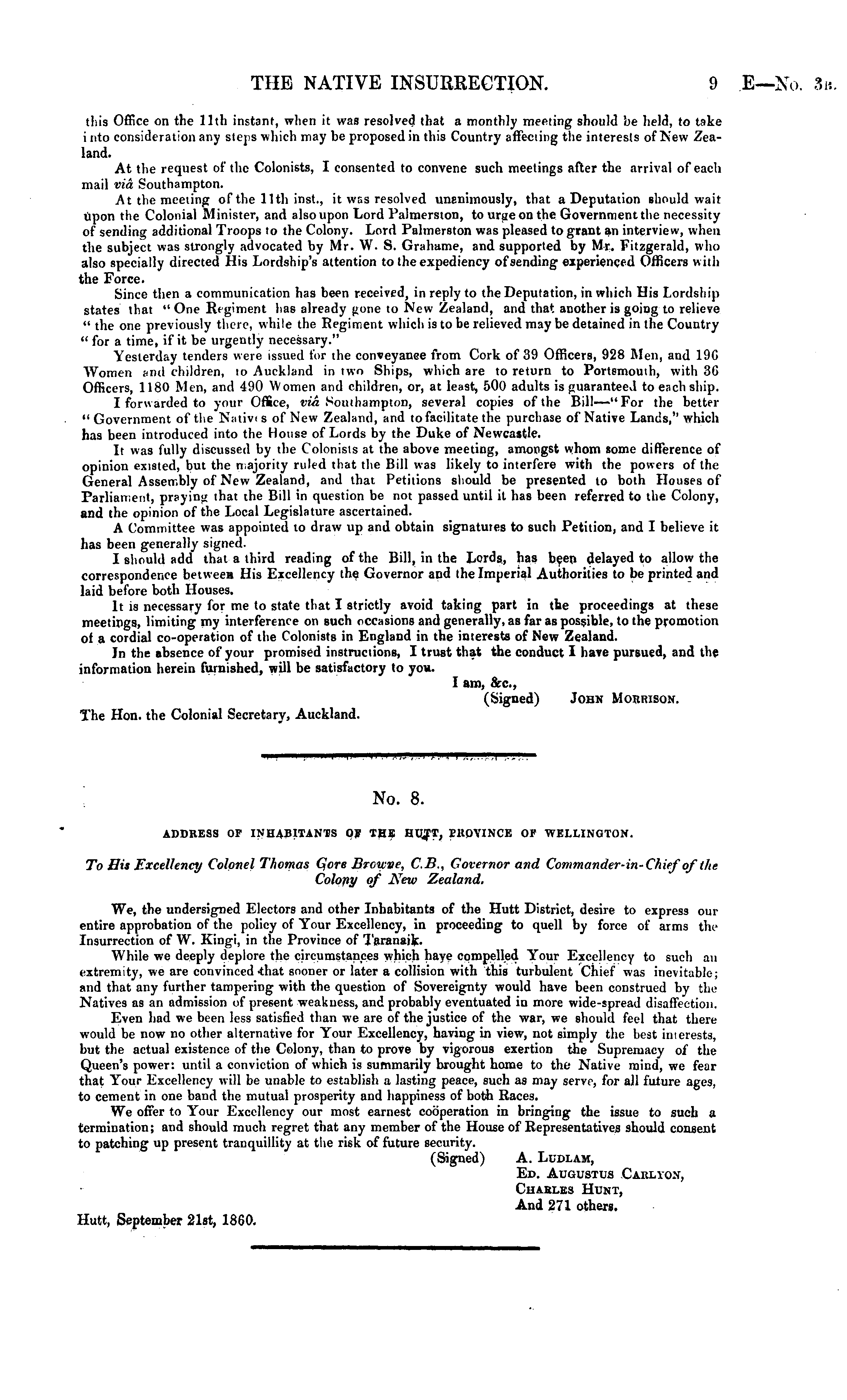 this Office on the 11th instant, when it was resolved that a monthly meeting should be held, to take i nto consideration any steps which may be proposed in this Country affecting the interests of New Zealand. At the request of the Colonists, I consented to convene such meetings after the arrival of each mail via Southampton. At the meeting of the 11th inst., it was resolved unanimously, that a Deputation should wait upon the Colonial Minister, and also upon Lord Palmerston, to urge on the Government the necessity of sending additional Troops to the Colony. Lord Palmerston was pleased to grant an interview, when the subject was strongly advocated by Mr. W. S. Grahame, and supported by Mr. Fitzgerald, who also specially directed His Lordship's attention to the expediency of sending experienced Officers with the Force. Since then a communication has been received, in reply to the Deputation, in which His Lordship states that " One Regiment lias already gone to New Zealand, and that another is goiDg to relieve " the one previously there, while the Regiment which is to be relieved may be detained in the Country " for a time, if it be urgently necessary." Yesterday tenders were issued for the conveyance from Cork of 39 Officers, 928 Men, and 190 Women end children, to Auckland in two Ships, which are to return to Portsmouth, with 3G Officers, 1180 Men, and 490 Women and children, or, at least, 500 adults is guaranteed to each ship. I forwarded to your Office, via Southampton, several copies of the Bill—"For the better "Government of the Nativis of New Zealand, and to facilitate the purchase of Native Lands," which has been introduced into the House of Lords by the Duke of Newcastle. It was fully discussed by the Colonists at the above meeting, amongst whom some difference of opinion existed, but the majority ruled that the Bill was likely to interfere with the powers of the General Assembly of New Zealand, and that Petitions should be presented to both Houses of Parliament, praying that the Bill in question be not passed until it has been referred to the Colony, and the opinion of the Local Legislature ascertained. A Committee was appointed to draw up and obtain signatutes to such Petition, and I believe it has been generally signed. I should add that a third reading of the Bill, in the Lords, has been delayed to allow the correspondence between His Excellency the Governor and the Imperial Authorities to be printed and laid before both Houses. It is necessary for me to state that I strictly avoid taking part in the proceedings at these meetings, limiting my interference on such occasions and generally, as far as possible, to the promotion of a cordial co-operation of the Colonists in England in the interests of New Zealand. In the absence of your promised instructions, I trust that the conduct 1 have pursued, and the information herein furnished, will be satisfactory to you. I am, Sec, (Signed) John Morrison. The Hon. the Colonial Secretary, Auckland. No. 8. ADDRESS OF INHABITANTS OS THE HUTT, PROVINCE OF WELLINGTON. To Eis Excellency Colonel Thomas Gore Browne, C.8., Governor and Commander-in-Chief of the Colony of New Zealand. We, the undersigned Electors and other Inhabitants of the Hutt District, desire to express our entire approbation of the policy of Your Excellency, in proceeding to quell by force of arms the Insurrection of W. Kingi, in the Province of Tarauaik. While we deeply deplore the circumstances which have compelled Your Excellency to such an extremity, we are convinced -that sooner or later a collision with this turbulent Chief was inevitable; and that any further tampering with the question of Sovereignty would have been construed by the Natives as an admission of present weakness, and probably eventuated in more wide-spread disaffection. Even had we been less satisfied than we are of the justice of the war, we should feel that therewould be now no other alternative for Your Excellency, having in view, not simply the best inierests, but the actual existence of the Colony, than to prove by vigorous exertion the Supremacy of the Queen's power: until a conviction of which is summarily brought home to the Native mind, we fear that Your Excellency will be unable to establish a lasting peace, such as may serve, for all future ages, to cement in one band the mutual prosperity and happiness of both Races. We offer to Your Excellency our most earnest cooperation in bringing the issue to such a termination; and should much regret that any member of the House of Representatives should consent to patching up present tranquillity at the risk of future security. (Signed) A. Ludlam, Ed. Augustus Carlyojt, Charles Hunt, And 271 others. Hutt, September 21st, 1860.