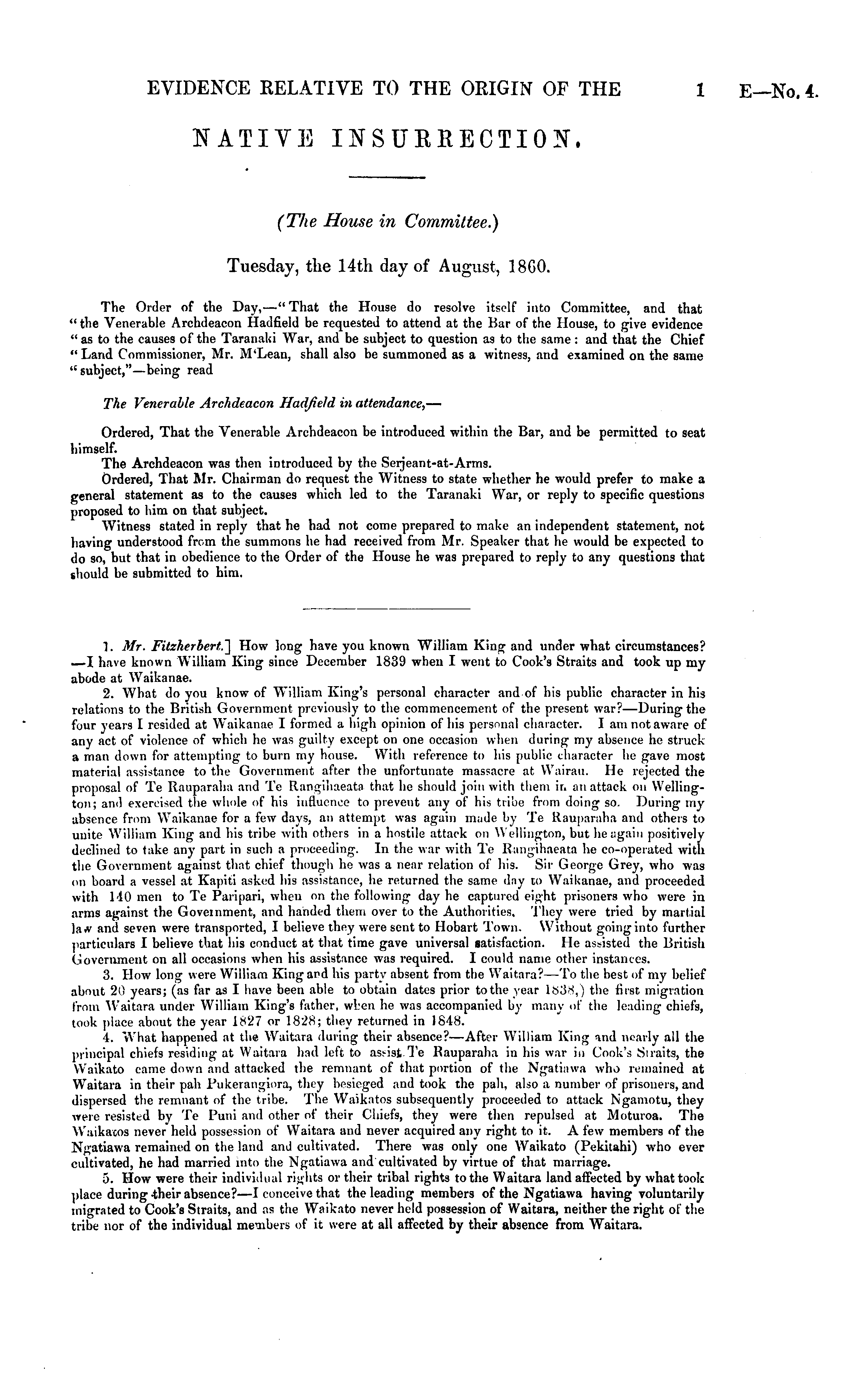 NATIVE OSTJBBECTION. (The House in Committee.) Tuesday, the 14th day of August, 18G0. The Order of the Day,—" That the House do resolve itself into Committee, and that " the Venerable Archdeacon fladfield be requested to attend at the Bar of the House, to give evidence "as to the causes of the Taranaki War, and be subject to question as to the same : and that the Chief "Land Commissioner, Mr. M'Lean, shall also be summoned as a witness, and examined on the same " subject,"—being read The Venerable Archdeacon HadfieJd in attendance, — Ordered, That the Venerable Archdeacon be introduced within the Bar, and be permitted to seat himself. The Archdeacon was then introduced by the Serjeant-at-Arms. Ordered, That Mr. Chairman do request the Witness to state whether he would prefer to make a general statement as to the causes which led to the Taranaki War, or reply to specific questions proposed to him on that subject. Witness stated in reply that he had not come prepared to make an independent statement, not having understood from the summons he had received from Mr. Speaker that he would be expected to do so, but that in obedience to the Order of the House he was prepared to reply to any questions that should be submitted to him. 1. Mr. Fitzherbert.~\ How long have you known William King and under what circumstances? —I have known William King since December 1839 when I went to Cook's Straits and took up my abode at Waikanae. 2. What do you know of William King's personal character and of his public character in his relations to the British Government previously to the commencement of the present war?— During the four years I resided at Waikanae I formed a high opinion of his personal character. lam not aware of any act of violence of which he was guilty except on one occasion when during my absence he struck a man down for attempting to burn my house. With reference to his public character he gave most material assistance to the Government after the unfortunate massacre at Wairau. He rejected the proposal of Te Rauparaha and Te Rangihaeata that he should join with them ir. an attack on Wellington; and exercised the whole of his influence to prevent any of his tribe from doing so. During my absence from Waikanae for a few days, an attempt was again made by Te Rauparaha and others to unite William King and his tribe with others in a hostile attack on Wellington, but heagain positively declined to take any part in such a proceeding. In the war with Te Rangihaeata he co-operated with the Government against that chief though he was a near relation of his. Sir George Grey, who was on board a vessel at Kapiti asked his assistance, he returned the same day to Waikanae, and proceeded with 140 men to Te Pari|>ari, when on the following day he captured eight prisoners who were in arms against the Government, and handed them over to the Authorities, They were tried by martial la a , and seven were transported, I believe they were sent to Hobart Town. Without going into further particulars I believe that liis conduct at that time gave universal satisfaction. He assisted the British Government on all occasions when his assistance was required. I could name other instances. 3. How long were William Kingard his party absent from the Waitara?—To the best of my belief about 20 years; (as far as I have been able to obtain dates prior to the year 1838,) the iirst migration from Waitara under William King's father, when he was accompanied by many of the leading chiefs, took place about the year 1827 or 1828; they returned in 1848. ■1. What happened at the Waitara during their absence?— After William King nnd nearly all the principal chiefs residing at Waitara had left to assist.Te Rauparaha in his war in Cook's Siraits, the VVaikatO easne down and attacked the remnant of that portion of the Ngatiawa who remained at Waitara in their pah Pukerangiora, they besieged and took the pah, also a number of prisoners, and dispersed the remnant of the tribe. The Waikatos subsequently proceeded to attack Ngamotu, they were resisted by Te Puni and other of their Chiefs, they were then repulsed at Moturoa. The \\':iikacos never held possession of Waitara and never acquired any right to it. A few members of the Ngatiawa remained on the land and cultivated. There was only one Waikato (Pekitahi) who ever cultivated, he had married into the Ngatiawa and cultivated by virtue of that marriage. 5. How were their individual rights or their tribal rights to the Waitara land affected by what took place during their absence? —I conceive that the leading members of the Ngatiawa having voluntarily migrated to Cook's Straits, and as the Waikato never held possession of Waitara, neither the right of the tribe nor of the individual meuibers of it were at all affected by their absence from Waitara.