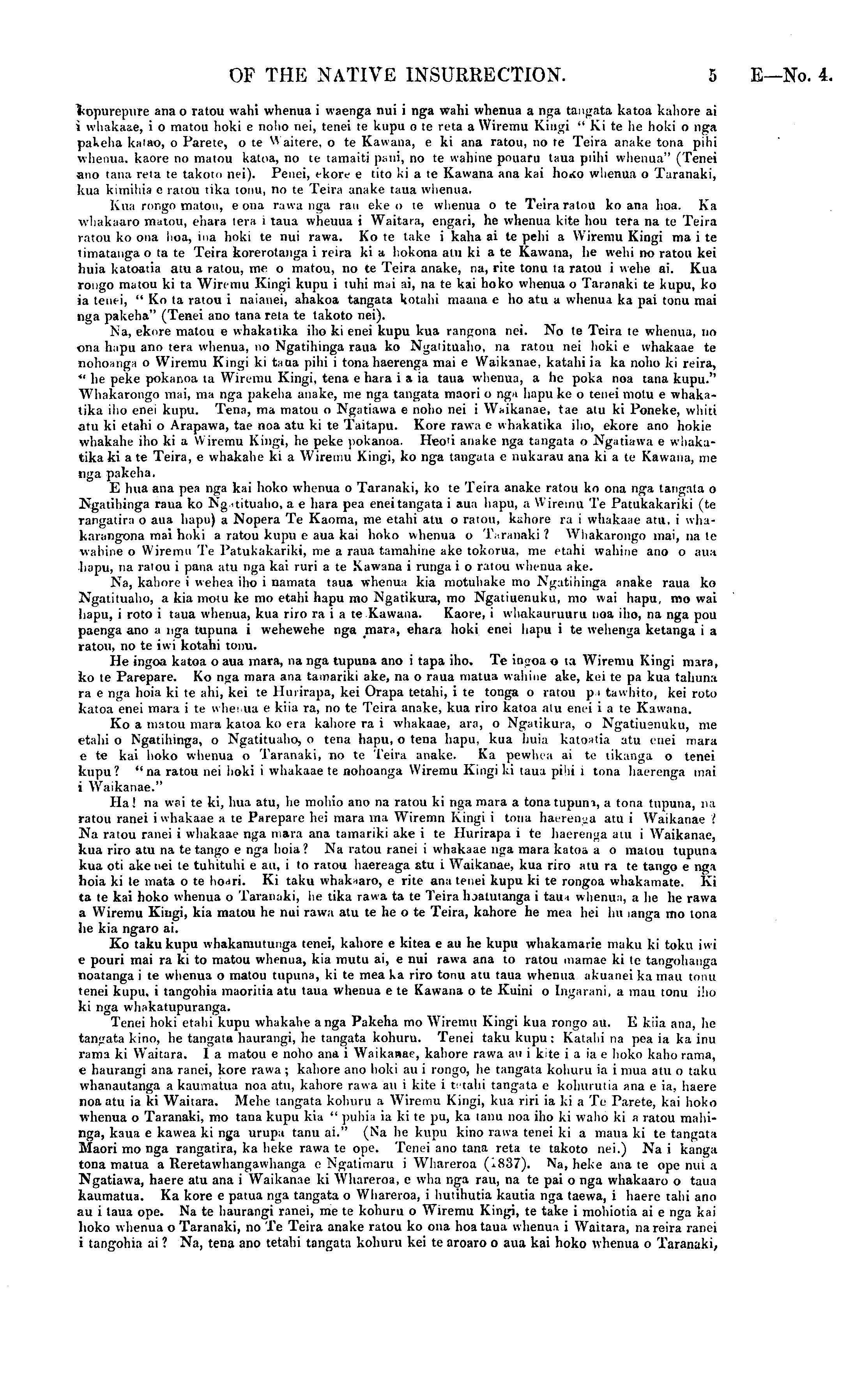 l»opurepure ana o ratou wahi whenua i waenga nui i nga wahi whenua a nga tangata katoa kahore ai i whaka&e, i o matou hoki c nolio nei, tenei te kupu o te reta a Wiremu Kingi " Xi te he hoki o nga pakeha k;iiao, o Parete, o te VV'aitere, o te Kawana, c ki ana ratou, no te Teira anake tona pihi wbenua, kaore no matou kaloa, no te tamaiti pani, no te wahine pouaru taua piihi whenua" (Tenei ano tana reta te takoto nei). Penei, ekore c tito ki ate Kawana ana kai lioko whenua o Turanaki, kua kitnihia c ratou tika tonu, no te Teira anake taua whenua. Kua rongo matou, eona rawa nga ran eke o te whenua o te Teira ratou ko ana hoa. Ka whakaaro matou, ehara (era 1 taua wheuua i Waitara, engari, he whenua kite hou tera na te Teira ratou ko ona hoa, ma hoki te nui rawa. Ko te take i kaha ai te pelii a Wiremu Kingi ma ite limatangao ta te Teira korerotanga i reira ki a hokona alu ki a te Kawana, he wehi no ratou kei huia katoatia atu a ratou, me o matou, no te Teira anake, na, rite tonu ta ratou i uelie ai. Kua rongo matou ki ta Wiremu Kingi kupu i tuhi mai ai, na te kai hoko whenua o Taranaki te kupu, ko ia tenei, " Ko ta ratou i naiauei, ahakoa tangata kotahi maana c lio atu a whenua ka pai tonu mai nga pakeha" (Tenei ano tana reta te takoto nei). Na, ekore matou c whakatika iho ki enei kupu kua rangona nei. No te Teira te whenua, no ona hapu ano tera whenua, no Ngatihinga raua ko Ngatituaho, na ratou nei hoki c whakaae te nohoanga o Wiremu Kingi ki t.iua pihi i tona haerenga mai c Waikanae, katahi ia ka nolio ki reira, *' lie peke pokanoa ta Wiremu Kingi, tena c liata i a ia taua whenua, a he poka noa tana kupu." Whakarongo mai, ma nga pakeha anake, me nga tangata maori o nga hapu ke o tenei motu c whakatika iho enei kupu. Tena, ma matou o Ngatiawa c noho nei i Waikanae, tae atu ki Poneke, wliiti atu ki etahi o Arapawa, tae noa atu kite Taitapu. Kore rawa c whakatika iho, ekore ano hokie whakahe iho ki a Wiremu Kingi, lie peke pokanoa. Heo'i anake nga tangata o Ngatiftwa c whakatika ki a te Teira, c whakahe ki a Wiremu Kingi, ko nga tangata c nukarau ana ki a te Kawaua, me nga pakeha, E hua ana pea nga kai hoko whenua o Taranaki, ko te Teira anake ratou ko ona nga tang.ita o Ngatibinga raua ko Ngitituabo, a c hara pea enei tangata i aua hapu, a Wiremu Te Patukakariki (te rangatira o aua hapu) a Nopera Te Kaoma, me etahi atu o ratou, kshore ra i whakaae atu. i whakariingona mai hoki a ratou kupu c aua kai hoko whenua o T .raiiaki ? Whakarongo mai, na te waliine o Wiremu Te Patukakariki, me a raua tamahine ake tokorua, me etahi wahine ano o aua hapu, na ratou i pana atu nga kai ruri a te Kawana i runga i o ratou whenua ake. Na, kahore i wehea iho i namata taua whenua kia motuhake mo Ngatihinga anake raua ko Ngatituaho, a kia moiu ke mo etahi hapu mo Ngatikura, mo Ngatiuenuku, mo uai hapu, mo wai hapu, i roto i taua whenua, kua riro ra ia te Kawana. Kaore, i wlmkauruuru noa iho, na nga pou paenga ano a nga tupuna i wehewehe nga mara, ehara hoki enei hapu i te wehenga ketanga i a ratou, no te iwi kotahi tonu. He ingoa katoa o aua inara, na nga tupuna ano i tapa iho. Te in«oa ota Wiremu Kingi mare, ko te Parepare. Ko mja roara ana ta.nariki ake, na o raua matua wahiue ake, kei te pa kua tahuna ra c nga hoia kite ahi, kei te Hurirapa, kei Orapa tetahi, i te tonga o ratou p > tawhito, kei roto katoa enei mara i te whenua c kiia ra, no te Teira anake, kua riro katoa alu enei i a te Kawaoa, Ko a matou mara katoa ko era kahore ra i whakaae, ara, o Ngatikura, o Ngatiusnuku, me etahi o Ngatihinga, o Ngatituaho, o tena hapu, o tena hapu, kua lmia katoatia atu enei mara etc kai hoko whenua o Taranaki, no te Teira anake. Ka pewhea ai te tikanga o tenei kupu? "na ratou nei hoki i whakaae te nohoanga Wiremu Kingi ki tauu pihi i tona haerenga mai i Waikanae." Ha! na write ki, hua atu, he mohio ano na ratou ki nga mara a tonatupum, a tona tupuna, na ratou ranei i whakaae a te Pureparc lie; mara ma Wiremn Kingi i tona haereaga atu i Waikanae ! Na ratou ranei i whakaae nga mara ana tamariki ake i te Hurirapa i te haerenga atu i Waikanae, kua riro atu na te tango c nga hoia? Na ratou ranei i whakaae nga mara katoa a o matou tupuna kua oti ake nei te tuhituhi c au, i to ratou haereaga atu i Waikanae, kua riro atu rate tango c nga lioia kite mata ote hoari. Xi taku whaknaro, c rite ana tenei kupu kite rongoa wbakamate. Xi ta te kai hoko whenua o Taranaki, he tika rawa ta te Teira hjatutanga i tain whenua, a lie he rawa a Wiremu Kingi, kia matou he nui rawa atu te he o te Teira, kahore he mea hei hu ianga mo tona he kia ngaro ai. Ko taku kupu whakamutunga tenei, kahore c kitea c au he kupu whakamarie maku ki toku iwi c pouri mai ra ki to matou wliniua, kia mutu ai, c nui rawa ana to ratou maniac kite tangohanga noatanga i te whenua o matou tupuna, kite mea ka riro tonu atu taua whenua akuanei ka matt tonu tenei kupu, i tangohia muoritia atu taua whenua c te Kawana o te Kuini o Ingarani, a mau tonu iiio ki nga whakatupuranga. Tenei hoki etahi kupu whakahe a nga Pakeha mo Wiremu Kingi kua rongo au. E kiia ana, he tangata kino, he tangata haurangi, he tangata kohuru. Tenei taku kupu: Katahi na pea ia ka inu ram aki Waitara. I a matou c noho ana i Waikanae, kahore rawa an i kite iaia c hoko kaho rama, c haurangi ana ranei, kore rawa ; kahore ano hoki au i rongo, he tangata kohuru ia i mua atu o taku whanautanga a kaumatua noa atu, kahore rawa au i kite i tetahi tangata c koburutia ana c ia. liaere noa atu ia ki Waitara. Mehc tangata kohuru a Wiremu Kingi, kua riri ia ki aTe Parete, kai hoko whenua o Taranaki, mo tana kupu kia " puhia ia kite pu, ka lanu noa iho ki waho ki a ratou mahinga, kaua c kawea ki nga urupa tanu ai." (Na he kupu kino rawa tenei ki a niaua kite tangata Maori mo nga rangatira, ka heke rawa te ope. Tenei ano tana reta te takoto nei.) Na i kanga tona matua a Reretawhangawhanga c Ngatimaru i Whareroa (1837). Na, heke ana te ope nui a Ngatiawa, haere atu ana i Waikanae ki Whareroa, c wha nga rau, na te pai