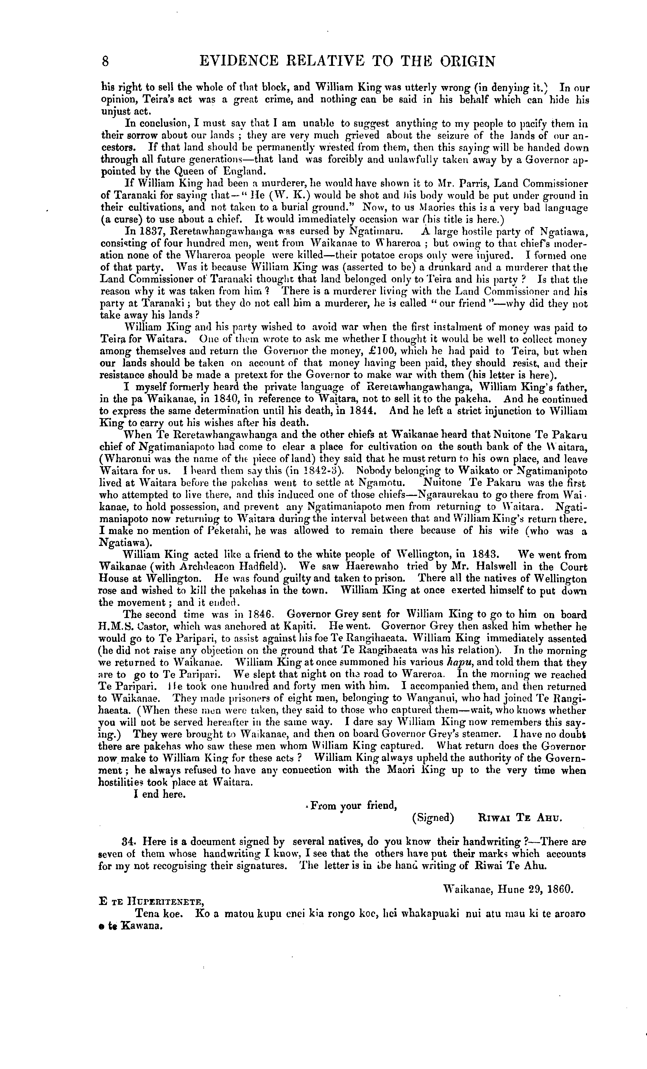 Ills right to sell the whole of that block, and William King was utterly wrong (in denying it.) In our opinion, Teira's act was a great crime, and nothing can be said in his behalf which can hide his unjust act. In conclusion, I must say that I am unable to suggest anything to my people to pacify them in their sorrow about our lands ; they are very much grieved about the seizure of the lands of our ancestors. If that land should be permanently wrested from them, then this saying will be handed down through all future generations—that land was forcibly and unlawfully taken away by a Governor appointed by the Queen of England. If William King had been a murderer, he would have shown it to Mr. Parris, Land Commissioner of Taranaki for saying that— " He (W. X.) would be shot and iiis body would be put under ground in their cultivations, and not taken to a burial ground." Now, to us Maories this is a very bad language (a curse) to use about a chief. It would immediately occasion war (his title is here.) In 1837, Reretawhangawhanga was cursed by Ngatimaru. A large hostile party of Ngatiawa, consisting of four hundred men, went from Waikanae to Whareroa ; but owing to that chiefs moderation none of the Whareroa people were killed—their potatoe crops only were injured. I formed one of that party. Was it because William King was (asserted to be) a drunkard and a murderer that the Land Commissioner or Taranaki thought that land belonged only to Teira and his party ? Is that the reason why it was taken from him ? There is a murderer living with the Land Commissioner and his party at Taranaki; but they do not call him a murderer, he is called " our friend " —why did they not take away his lands ? William King and his party wished to avoid war when the first instalment of money was paid to Teira for Waitara. One of them wrote to ask me whether I thought it would be well to collect money among themselves and return the Governor the money, £100, which he had paid to Teira, but when our lands should be taken on account of that money having been paid, they should resist, and their resistance should be made a pretext for the Governor to make war with them (his letter is here). I myself formerly heard the private language of Reretawhangawhanga, William King's father, in the pa Waikanae, in 1840, in reference to Waitara, not to sell it to the pakeha. And he continued to express the same determination until his death, in 1844. And he left a strict injunction to William King to carry out his wishes after his death. When Te Reretawhangawhanga and the other chiefs at Waikanae heard thatNuitone Tβ Pakaru chief of Ngatimaniapoto had come to clear a place for cultivation on the south bank of the Waitara, (Wharonui was the name of tlit piece of land) they said that he must return to his own place, and leave Waitara for us. I heard them say this (in 3 842-ii). Nobody belonging to Waikato or Ngatimanipoto lived at Waitara before the pakehas went to settle at Ngamotu. Nuitone Te Pakaru was the first who attempted to live there, and this induced one of those chiefs—Ngaraurekau to go there from Wai ■ kanae, to hold possession, and prevent any Ngatimaniapoto men from returning to Waitara. Ngatimaniapoto now returning to Waitara during the interval between that and William King's return there. I make no mention of Peketahi, he was allowed to remain there because of his wile (who was a. Ngatiawa). William King acted like a friend to the white people of Wellington, in 1843. We went from Waikanae (with Archdeacon Hadfield). We saw Haerewaho tried by Mr. Halswell in the Court House at Wellington. He was found guilty and taken to prison. There all the natives of Wellington rose and wished to kill the pakehas in the town. William King at once exerted himself to put down the movement; and it ended. The second time was in 1846. Governor Grey sent for William King to go to him on board H.M.S. Castor, which was anchored at Kapiti. He went. Governor Grey then asked him whether he would go to Te Paripari, to assist against his foe Te Rangihaeata. William King immediately assented (he did not raise any objection on the ground that Te Rangibaeata was his relation). In the morning we returned to Waikanae. William King-at once summoned his various hapu, and told them that they are to go to Te Paripari. We slept that night on tlu road to Wareroa. In the morning we reached Te Paripari. Ile took one hundred and forty men with him. I accompanied them, and then returned to Waikanae. They made prisoners of eight men, belonging to Wanganui, who had joined Te Rangihaeata. (When these men were taken, they said to those who captured them —wait, who knows whether you will not be served hereafter in the same way. I dare say William King now remembers this saying.) They were brought to Waikanae, and then on board Governor Grey's steamer. I have no doubt there are pakehas who saw these men whom William King captured. What return does the Governor now make to William King for these acts ? William King always upheld the authority of the Government ; he always refused to have any connection with the Maori King up to the very time when hostilities took place at Waitara. I end here. From your friend, (Signed) Riwai Te Ahu. 34. Here is a document signed by several natives, do you know their handwriting ?—There are seven of them whose handwriting I know. I see that the others have put their marks which accounts for my not recoguising their signatures. The letter is in ibe hand writing of Riwai Te Ahu. Waikanae, Hune 29, 1860. Etc lllteeitenete, Tena koe. Ko a matou kupu enci kia rongo koc, hei whakapuaki nui atu mau kite aroaro c te Kawana.