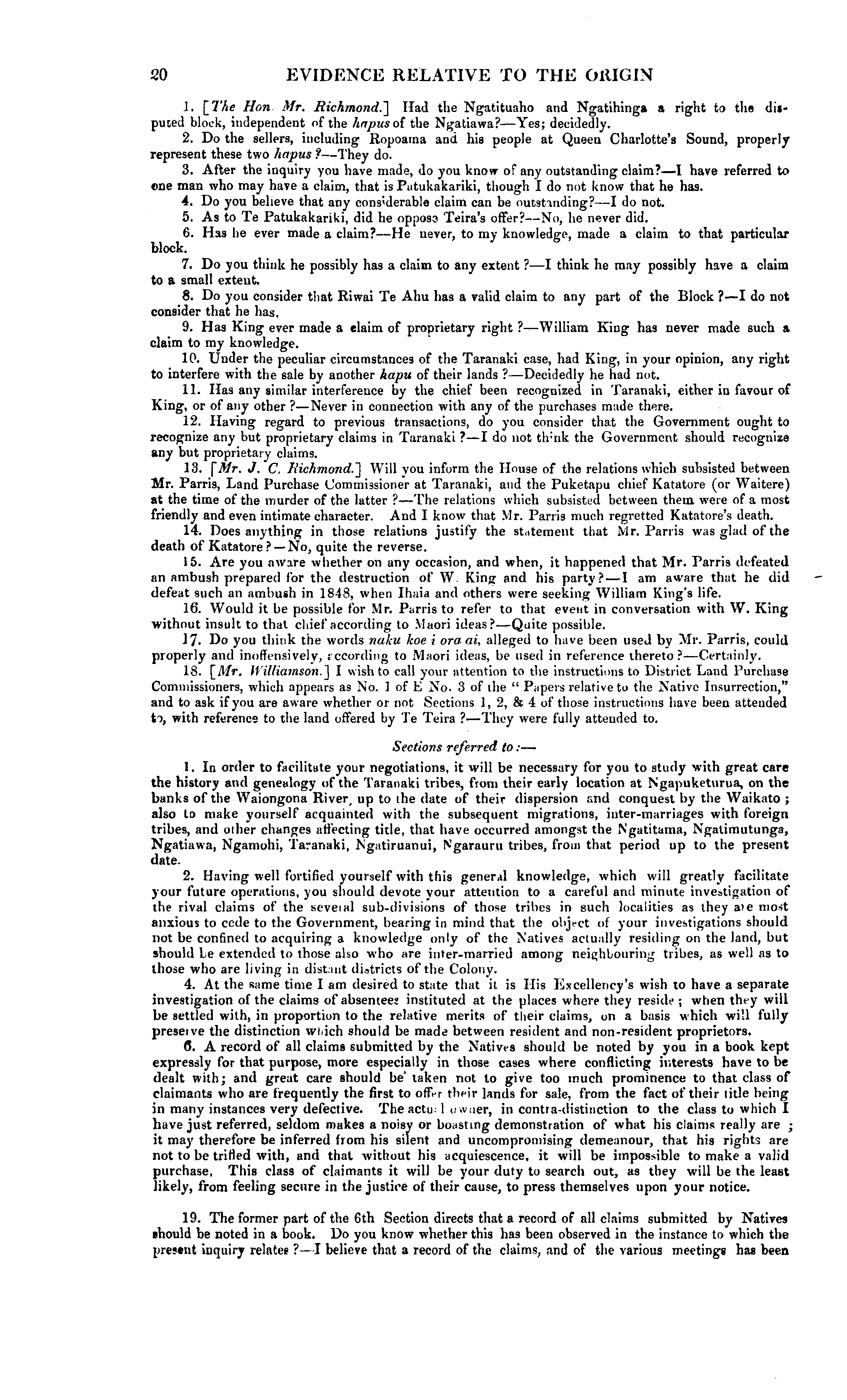 1. \_The Hon. Mr. Richmond.] Had the Ngatituaho and Ngatihinga a right to the di«puced block, independent of the hapusoi the Ngatiawa?—Yes; decidedly. 2. Do the sellers, including llopoama and his people at Queen Charlotte's Sound, properly represent these two hnpus ? —They do. 3. After the inquiry you have made, do you know of any outstanding claim?—l have referred to one man who may have a claim, that is Putukakariki, though I do not know that he has. 4. Do you believe that any considerable claim can be outstanding?—l do not. 5. As to Te Patukakariki, did he oppos? Teira's offer?—No, he never did. 6. Has lie ever made a claim? —He never, to my knowledge, made a claim to that particular block. 7. Do you think he possibly has a claim to any extent ? —I think lie may possibly have a claim to a small extent. 8. Do you consider that Riwai Te Ahu has a valid claim to any part of the Block ?—I do not consider that he has, 9. Has King ever made a elaitn of proprietary right ?—William King has never made such a claim to my knowledge. 10. Under the peculiar circumstances of the Taranaki case, had King, in your opinion, any right to interfere with the sale by another hapu of their lands ?—-Decidedly he had not. 11. Has any similar interference by the chief been recognized in Taranaki, either in favour of King, or of any other ?—Never in connection with any of the purchases made there. 12. Having regard to previous transactions, do you consider that the Government ought to recognize any but proprietary claims in Taranaki ? —I do not th-nk the Government should recognize any but proprietary claims. 13. \ Mr. J. C. Richmond."] Will you inform the House of the relations which subsisted between Mr. Parris, Land Purchase Commissioner at Taranaki, and the Puketapu chief Katatore (or Waitere) at the time of the murder of the latter ?—The relations which subsisted between them were of a most friendly and even intimate character. And I know that Mr. Parris much regretted Katatore's death. 14. Does anything in those relations justify the statement that Mr. Parris was glad of the death of Katatore? — No, quite the reverse. 15. Are you aware whether on any occasion, and when, it happened that Mr. Parris defeated an ambush prepared for the destruction of W Kins and his part} , ? — I am aware that he did defeat such an ambush in 1848, when Ihaia and others were seeking William King's life. 16. Would it be possible for Mr. Piirris to refer to that event in conversation with W. King without insult to thai chief according to Maori ideas?— Quite possible. 17. Do you think the words naku hoe i oraai, alleged to have been used by Mr. Parris, could properly and inoffensively, recording to Maori ideas, be used in reference thereto?— Certainly. 18. \_Mr. Williamson.] I wish to call your attention to the instructions to District Land Purchase Commissioners, which appears as No. ] of E No. 3 of the " Papers relative to the Native Insurrection," and to ask if you are aware whether or not Sections 1, 2, & 4 of those instructions have been attended t~>, with reference to the land offered by Te Teira ?—They were fully attended to. Sections referred to: — 1. In order to facilitate your negotiations, it will be necessary for you to study with great care the history and genealogy of the Taranaki tribes, from their early location at Ngapuketurua, on the banks of the Waiongona River, up to the date of their dispersion and conquest by the Waikato ; also to make yourself acquainted with the subsequent migrations, inter-marriages with foreign tribes, and other changes affecting title, that have occurred amongst the Ngatitama, Ngalimutunga, Ngatiawa, Ngamohi, Taranaki, ISgatiruanui, Ngarauru tribes, from that period up to the present date. 2. Having well fortified yourself with this general knowledge, which will greatly facilitate your future operations, you should devote your attention to a careful and minute investigation of the rival claims of the seveial sub-divisions of those tribes in such localities as they a)e most anxious to cede to the Government, bearing in mind that the object of your investigations should not be confined to acquiring a knowledge only of the Natives actually residing on the land, but should Le extended to those also who are inter-married among neighbouring tribes, as well as to those who are living in distant districts of the Colony. 4. At the same time I am desired to state that it is His Excellency's wish to have a separate investigation of the claims of absentees instituted at the places where they reside ; when tht-y will be settled with, in proportion to the relative merits of their claims, on a basis which will fully preseive the distinction which should be made between resident and non-resident proprietors. 6. A record of all claims submitted by the Natives should be noted by you in a book kept expressly for that purpose, more especially in those cases where conflicting interests have to be dealt with; and great care should be taken not to give too much prominence to that class of claimants who are frequently the first to offVr their lands for sale, from the fact of their title being in many instances very defective. The actu-1 uwuer, in contra-distiiiction to the class to which I have just referred, seldom makes a noisy or boosting demonstration of what his claims really are ; it may therefore be inferred from his silent and uncompromising demeanour, that his rights are not to be trifled with, and that without his acquiescence, it will be impossible to make a valid purchase, This class of claimants it will be your duty to search out, as they will be the least likely, from feeling secure in the justice of their cause, to press themselves upon your notice. 19. The former part of the 6th Section directs that a record of all claims submitted by Natives ehould be noted in a book. Do you know whether this has been observed in the instance to which the present inquir