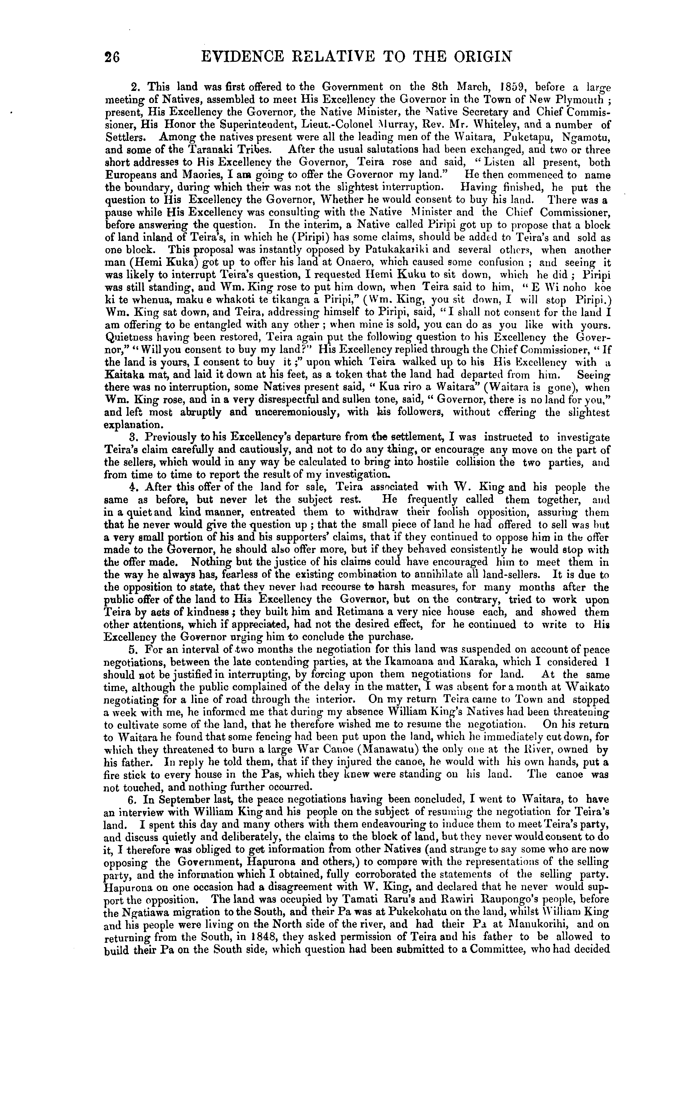 2. This land was first offered to the Government on the Bth March, 1859, before a large meeting of Natives, assembled to meet His Excellency the Governor in the Town of New Plymouth ; present, His Excellency the Governor, the Native Minister, the Native Secretary and Chief Commissioner, His Honor the Superintendent, Lieut.-Colonel Murray, Rev. Mr. Whiteley, and a number of Settlers. Among the natives present were all the leading men of the Waitara, Puketapu, Ngamotu, and some of the Taranaki Tribes. After the usual salutations had been exchanged, and two or three short addresses to His Excellency the Governor, Teira rose and said, "Listen all present, both Europeans and Maories, lam going to offer the Governor my land." He then commenced to name the boundary, during which their was r.ot the slightest interruption. Having finished, he put the question to His Excellency the Governor, Whether he would consent to buy his land. There was a pause while His Excellency was consulting with the Native Minister and the Chief Commissioner, before answering the question. In the interim, a Native called Piripi got up to propose that a block of land inland of Teira's, in which he (Piripi) has some claims, should be added to Teira's and sold as one block. This proposal was instantly opposed by Patukakaiiki and several others, when another man (Hemi Kuka) got up to offer his land at Onaero, which caused some confusion ; aud seeing it was likely to interrupt Teira's question, I requested Hemi Kuku to sit down, which he did ; Piripi was still standing, and Wm. King rose to put him down, when Teira said to him, " E Wi noho koe kite whenua, maku c whakoti te tikanga a Piripi," (Win. King, you sit down, I will stop Piripi.) Wm. King sat down, and Teira, addressing himself to Piripi, said, " I shall not consent for the land I am offering to be entangled with any other ; when mine is sold, you can do as you like with yours. Quietness having been restored, Teira again put the following question to his Excellency the Governor," "Will you consent to buy my land?" His Excellency replied through the Chief Commissioner, " If the land is yours, I consent to buy it;" upon which Teira walked up to his His Excellency with a Kaitaka mat, and laid it down at his feet, as a token that the land had departed from him. Seeing there was no interruption, some Natives present said, " Kua riro a Waitara" (Waitara is gone), when Wm. King rose, and in a very disrespectful and sullen tone, said, " Governor, there is no land for you," and left most abruptly and unceremoniously, with kis followers, without offering the slightest explanation. 3. Previously to his Excellency's departure from the settlement, I was instructed to investigate Teira's claim carefully and cautiously, and not to do any thing, or encourage any move on the part of the sellers, which would in any way be calculated to bring into hostile collision the two parties, and from time to time to report the result of my investigation. 4-. After this offer of the land for sale, Teira associated with W. King and his people the same as before, but never let the subject rest. He frequently called them together, and in a quiet and kind manner, entreated them to withdraw their foolish opposition, assuring them that he never would give the question up ; that the small piece of land he had offered to sell was hut a very small portion of his and his supporters' claims, that if they continued to oppose him in the offer made to the Governor, he should also offer more, but if they behaved consistently he would stop with the offer made. Nothing but the justice of his claims could have encouraged him to meet them in the way he always has, fearless of the existing combination to annihilate all land-sellers. It is due to the opposition to state, that they never had recourse te harsh measures, for many months after the public offer of the land to His Excellency the Governor, but on the contrary, tried to work upon Teira by aGts of kindness ; they built him and Retimana a very nice house each, and showed them other attentions, which if appreciated, had not the desired effect, for he continued to write to His Excellency the Governor urging him to conclude the purchase. 5. For an interval of two months the negotiation for this land was suspended on account of peace negotiations, between the late contending parties, at the Ikamoana aud Karaka, which I considered I should not be justified in interrupting, by forcing upon them negotiations for land. At the same time, although the public complained of the delay in the matter, I was absent for a month at Waikato negotiating for a line of road through the interior. On my return Teira came to Town and stopped a week with me, he informed me that during my absence William King's Natives had been threatening to cultivate some of the land, that he therefore wished me to resume the negotiation, On his return to Waitara he found that some fencing had been put upon the land, which he immediately cut down, for which they threatened to burn a large W T ar Canoe (Manawatu) the only one at the River, owned by his father. In reply he told them, that if they injured the canoe, he would witli his own hands, put a fire stick to every house in the Pas, which they knew were standing on his land. The canoe was not touched, and nothing further occurred. 6. In September last, the peace negotiations having been concluded, I went to Waitara, to have an interview with William King and his people on the subject of resuming the negotiation for Teira's land. I spent this day and many others with them endeavouring to induce them to meet Teira's party, and discuss quietly and deliberately, the claims to the block of land, but they never would consent to do it, I therefore was obliged to get information from other Natives (and strange to say some who are now opposing the Government, fiapurona and others,) to compare with the representations of the selling party, and the informat
