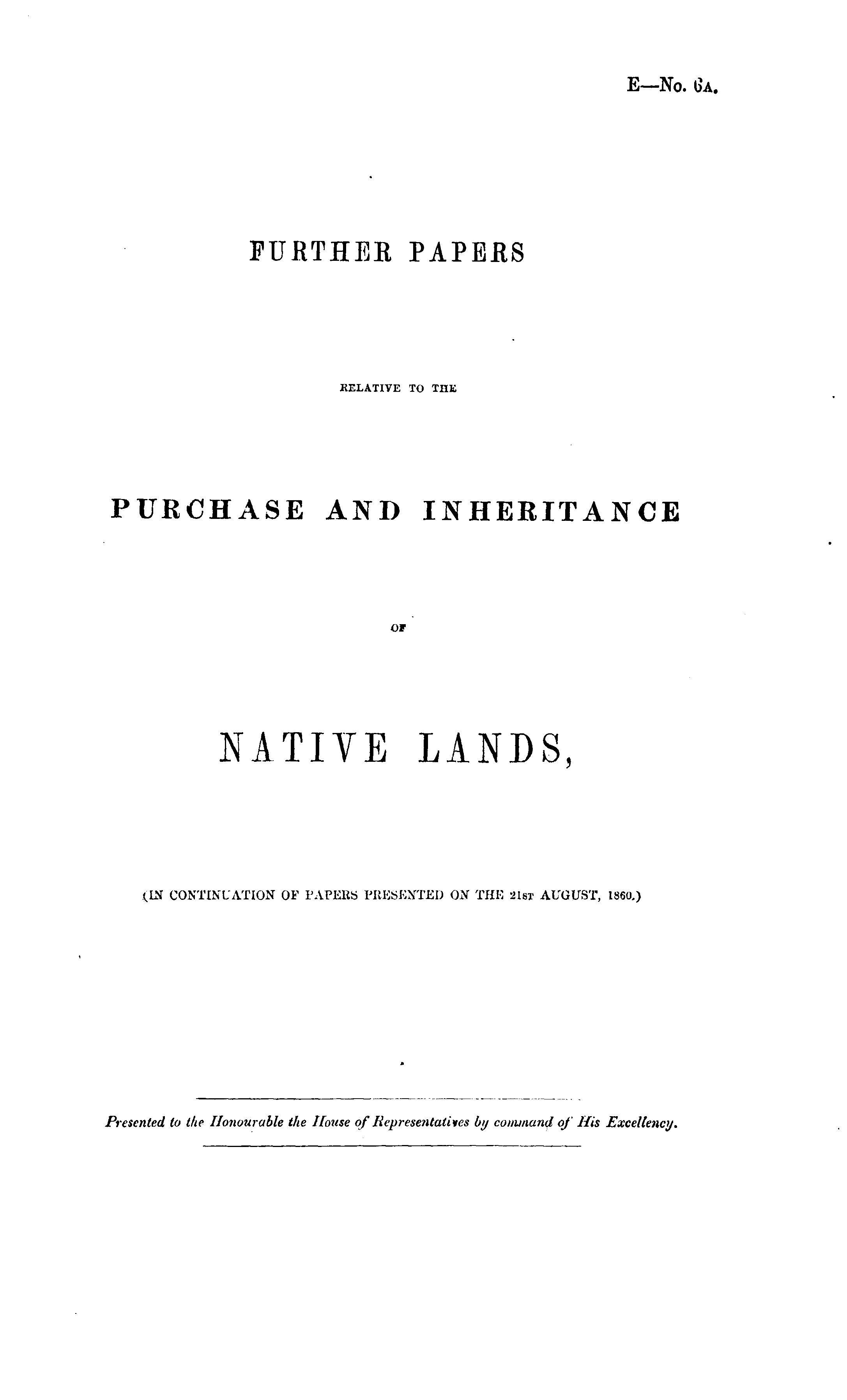 FURTHER PAPERS RELATIVE TO THE PURCHASE AND INHERITANCE OF NATIVE LANDS, (IN CONTINUATION OF PAPERS PRESENTED ON THE 21st AUGUST, 1860.)