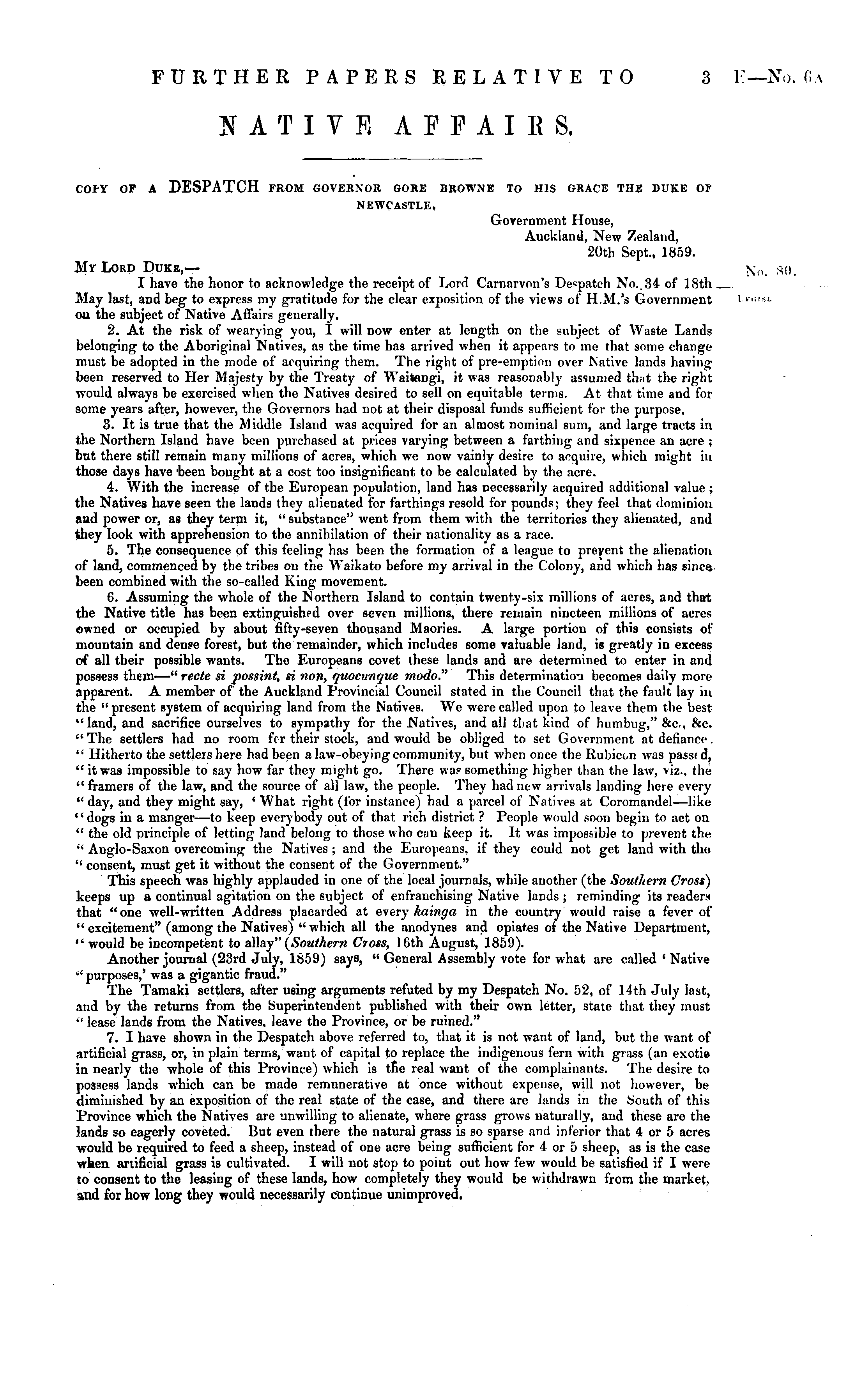 NATIVE AFPAIES. copy of a DESPATCH from governor gore browne to his grace the duke of NEWCASTLE. Government House, Auckland, New Zealand, 20th Sept., 1859. Mr Lord Duke,— I have the honor to acknowledge the receipt of Lord Carnarvon's Despatch N0..34 of 18th May last, and beg to express my gratitude for the clear exposition of the views of H.M.s Government ou the subject of Native Affairs generally. 2. At the risk of wearying you, I will now enter at length on the subject of Waste Lands belonging to the Aboriginal Natives, as the time has arrived when it appears to me that some change must be adopted in the mode of acquiring them. The right of pre-emption over Native lands having been reserved to Her Majesty by the Treaty of Waitongi, it was reasonably assumed that the right would always be exercised when the Natives desired to sell on equitable terms. At that time and for some years after, however, the Governors had not at their disposal funds sufficient for the purpose. 3. It is true that the Middle Island was acquired for an almost nominal sum, and large tracts in the Northern Island have been purchased at prices varying between a farthing and sixpence an acre ; but there still remain many millions of acres, which we now vainly desire to acquire, which might in those days have been bought at a cost too insignificant to be calculated by the acre. 4. With the increase of the European population, land has necessarily acquired additional value ; the Natives have seen the lands they alienated for farthings resold for pounds; they feel that dominion and power or, as they term it, " substance" went from them with the territories they alienated, and they look with apprehension to the annihilation of their nationality as a race. 5. The consequence of this feeling has been the formation of a league to preyent the alienation of land, commenced by the tribes on the Waikato before my arrival in the Colony, and which has since, been combined with the so-called King movement. 6. Assuming the whole of the Northern Island to contain twenty-six millions of acres, and that the Native title has been extinguished over seven millions, there remain nineteen millions of acres owned or occupied by about fifty-seven thousand Maories. A large portion of this consists of mountain and dense forest, but the remainder, which includes some valuable land, is greatly in excess of all their possible wants. The Europeans covet these lands and are determined to enter in and possess them —" recte si possint, si non, quocunque modo." This determination becomes daily more apparent. A member of the Auckland Provincial Council stated in the Council that the fault lay in the "present system of acquiring land from the Natives. We were called upon to leave them the best "land, and sacrifice ourselves to sympathy for the Natives, and all that kind of humbug," &c, &c. "The settlers had no room frr their stock, and would be obliged to set Government at defiance. " Hitherto the settlers here had been a law-obeying community, but when once the Rubicon was passt d, "it was impossible to say how far they might go. There was something higher than the law, viz., the " framers of the law, and the source of all law, the people. They had new arrivals landing here every " day, and they might say, ' What right (for instance) had a parcel of Natives at Coromandel—like "dogs in a manger—to keep everybody out of that rich district ? People would soon begin to act on " the old principle of letting land belong to those who can keep it. It was impossible to prevent the •' Anglo-Saxon overcoming the Natives ; and the Europeans, if they could not get land with the " consent, must get it without the consent of the Government." This speech was highly applauded in one of the local journals, while another (the Southern Cross) keeps up a continual agitation on the subject of enfranchising Native lands ; reminding its readers that "one well-written Address placarded at every kainga in the country would raise a fever of " excitement" (among the Natives) " which all the anodynes and opiates of the Native Department, " would be incompetent to allay" {Southern Cross, 16th August, 1859). Another journal (23rd July, 1859) says, " General Assembly vote for what are called ' Native "purposes,' was a gigantic fraud." The Tamaki settlers, after using arguments refuted by my Despatch No. 52, of 14th July last, and by the returns from the Superintendent published with their own letter, state that they must " lease lands from the Natives, leave the Province, or be ruined." 7. I have shown in the Despatch above referred to, that it is not want of land, but the want of artificial grass, or, in plain terms, want of capital to replace the indigenous fern with grass (an exotic in nearly the whole of this Province) which is the real want of the complainants. The desire to possess lands which can be made remunerative at once without expense, will not however, be diminished by an exposition of the real state of the case, and there are lands in the South of this Province which the Natives are unwilling to alienate, where grass grows naturally, and these are the lands so eagerly coveted. But even there the natural grass is so sparse and inferior that 4or 5 acres would be required to feed a sheep, instead of one acre being sufficient for 4 or 5 sheep, as is the case when artificial grass is cultivated. I will not stop to point out how few would be satisfied if I were to consent to the leasing of these lands, how completely they would be withdrawn from the market, and for how long they would necessarily continue unimproved.