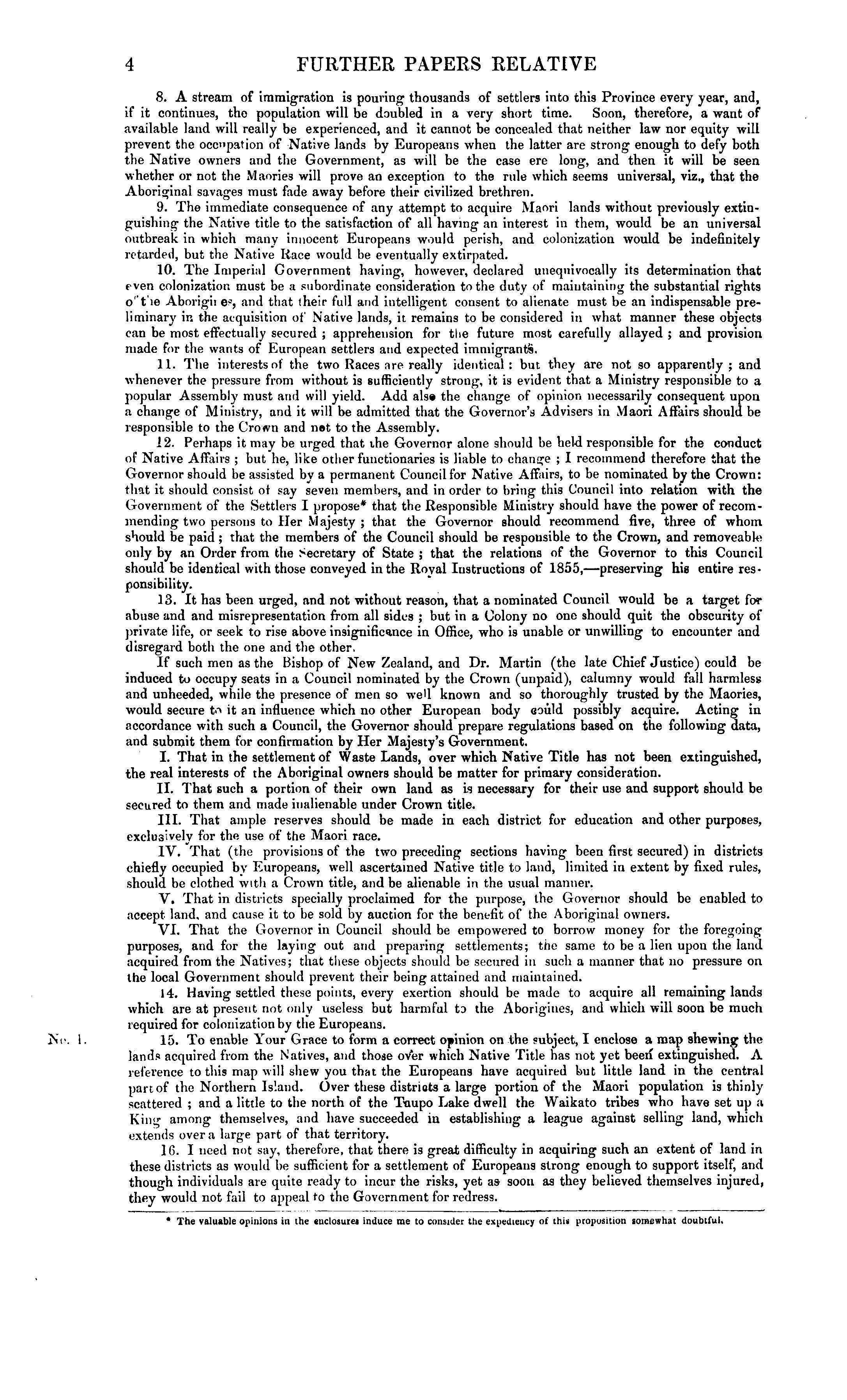 8. A stream of immigration is pouring thousands of settlers into this Province every year, and, if it continues, the population will be doubled in a very short time. Soon, therefore, a want of available land will really be experienced, and it cannot be concealed that neither law nor equity will prevent the occupation of Native lands by Europeans when the latter are strong enough to defy both the Native owners and the Government, as will be the case ere long, and then it will be seen whether or not the Maories will prove an exception to the rule which seems universal, viz., that the Aboriginal savages must fade away before their civilized brethren. 9. The immediate consequence of any attempt to acquire Maori lands without previously extinguishing the Native title to the satisfaction of all having an interest in them, would be an universal outbreak in which many innocent Europeans would perish, and colonization would be indefinitely retarded, but the Native Race would be eventually extirpated. 10. The Imperial Government having, however, declared unequivocally its determination that even colonization must be a subordinate consideration to the duty of maintaining the substantial rights o' t te Aborigh e--, and that their full and intelligent consent to alienate must be an indispensable preliminary in the acquisition of Native lands, it remains to be considered in what manner these objects can be most effectually secured ; apprehension for the future most carefully allayed ; and provision made for the wants of European settlers and expected immigrants. 11. The interests of the two Races are really identical: but they are not so apparently; and whenever the pressure from without is sufficiently strong, it is evident that a Ministry responsible to a popular Assembly must and will yield. Add alse the change of opinion necessarily consequent upon it change of Ministry, and it will be admitted that the Governor's Advisers in Maori Affairs should be responsible to the Crown and not to the Assembly. J2. Perhaps it may be urged that ihe Governor alone should be held responsible for the conduct of Native Affairs ; but he, like other functionaries is liable to change ; I recommend therefore that the Governor should be assisted by a permanent Council for Native Affairs, to be nominated by the Crown: that it should consist of say seven members, and in order to bring this Council into relation with the Government of the Settlers I propose* that the Responsible Ministry should have the power of recommending two persons to ller Majesty ; that the Governor should recommend five, three of whom should be paid ; that the members of the Council should be responsible to the Crown, and removeable only by an Order from the Secretary of State ; that the relations of the Governor to this Council should be identical with those conveyed in the Royal Instructions of 1855, —preserving hig entire responsibility. 13. It has been urged, and not without reason, that a nominated Council would be a target for abuse and and misrepresentation from all sides ; but in a Colony no one should quit the obscurity of private life, or seek to rise above insignificance in Office, who is unable or unwilling to encounter and disregard both the one and the other. If such men as the Bishop of New Zealand, and Dr. Martin (the late Chief Justice) could be induced to occupy seats in a Council nominated by the Crown (unpaid), calumny would fall harmless and unheeded, while the presence of men so well known and so thoroughly trusted by the Maories, would secure to it an influence which no other European body could possibly acquire. Acting in accordance with such a Council, the Governor should prepare regulations based on the following data, and submit them for confirmation by Her Majesty's Government. I. That in the settlement of Waste Lands, over which Native Title has not been extinguished, the real interests of the Aboriginal owners should be matter for primary consideration. 11. That such a portion of their own land as is necessary for their use and support should bo secured to them and made inalienable under Crown title. 111. That ample reserves should be made in each district for education and other purposes, exclusively for the use of the Maori race. IV. That (the provisions of the two preceding sections having been first secured) in districts chiefly occupied by Europeans, well ascertained Native title to land, limited in extent by fixed rules, should bo clothed with a Crown title, and be alienable in the usual manner. V. That in districts specially proclaimed for the purpose, the Governor should be enabled to accept land, and cause it to be sold by auction for the benefit of the Aboriginal owners. VI. That the Governor in Council should be empowered to borrow money for the foregoing purposes, and for the laying out and preparing settlements; the same to be a lien upon the land acquired from the Natives; that these objects should be secured in such a manner that no pressure on the local Government should prevent their being attained and maintained. 14. Having settled these points, every exertion should be made to acquire all remaining lands which are at present not only useless but harmful ta the Aborigines, and which will soon be much required for colonization by the Europeans. 15. To enable Your Grace to form a correct opinion on the subject, I enclose a map shewing the lands acquired from the Natives, and those over which Native Title has not yet been extinguished. A reference to this map will shew you that the Europeans have acquired but little land in the central part of the Northern Island. Over these districts a large portion of the Maori population is thinly scattered ; and a little to the north of the Taupo Lake dwell the Waikato tribes who have set up a King among themselves, and have succeeded in establishing a league against selling land, which extends over a large part of that territory. l(j. ] need not say, therefore, tha