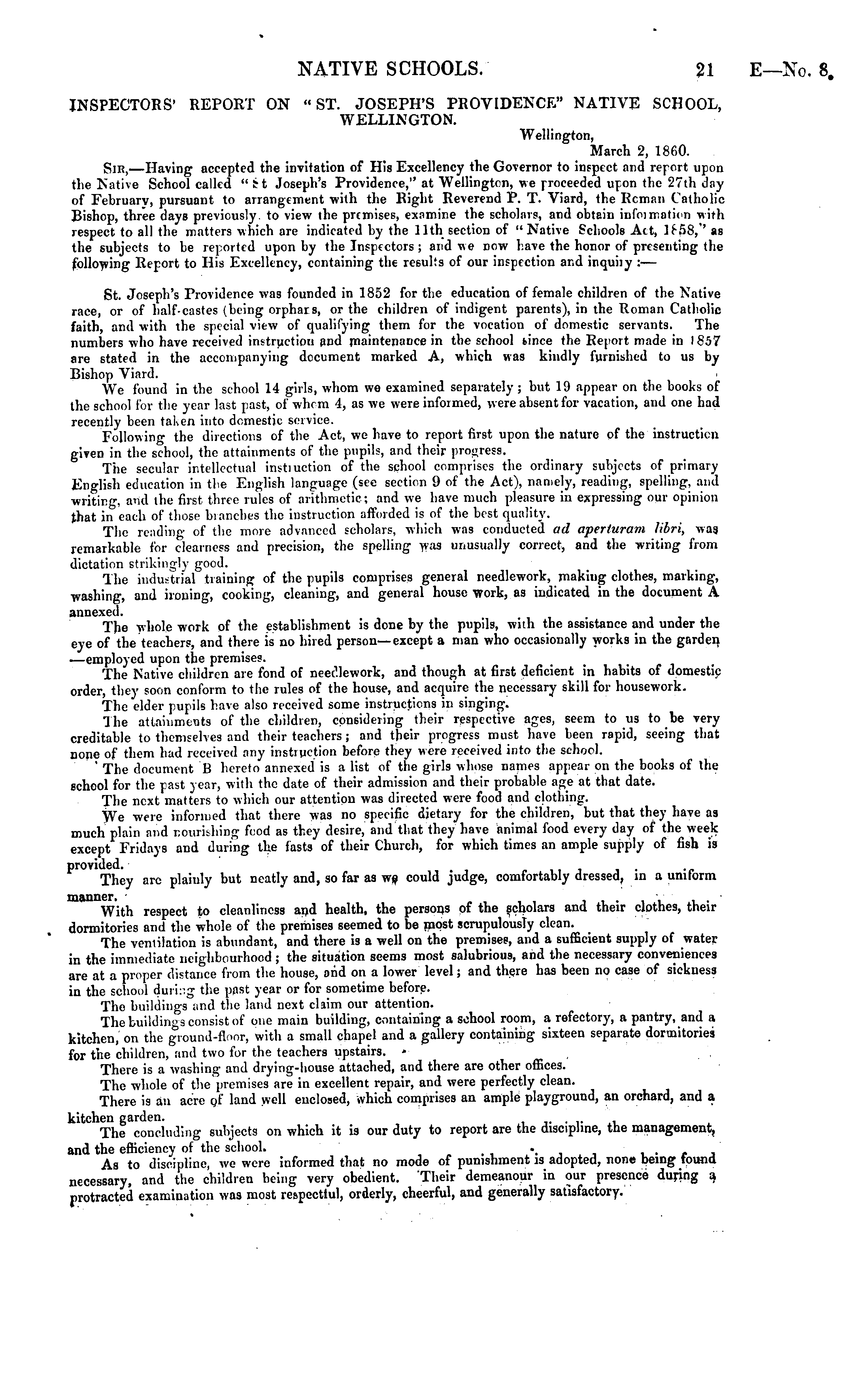 INSPECTORS' REPORT ON "ST. JOSEPH'S PROVIDENCE" NATIVE SCHOOL, WELLINGTON. Wellington, March 2, 1860. Sir, —Having accepted the invitation of His Excellency the Governor to inspect and report upon the Native School called " Jt Joseph's Providence," at Wellington, we poceeded upon the 27th cloy of February, pursuant to arrangement with the Bight Reverend P. T. Viard, the Reman Catholic Bishop, three days previously to view the premises, examine the scholars, and obtain infoimotion with respect to all the matters which are indicated by the 11th section of "Native Schools Act, IrfiS,"' as the subjects to be reported upon by the Inspectors ; and we now have the honor of presenting the following Report to His Excellency, containing the results of our inspection and inquiiy :— St. Joseph's Providence was founded in 1852 for the education of female children of the Native race, or of half-castes (being orphars, or the children of indigent parents), in the Roman Catholic faith, and with the special view of qualifying them for tbe vocation of domestic servants. The numbers who have received instruction and maintenance in the school since the Report made in 1857 are stated in the accompanying document marked A, which was kindly furnished to us by Bishop Viard. > We found in the school 14 girls, whom we examined separately ; but 19 appear on the books of the school for the year last past, of whom 4, as we were infoi mcd, were absent for vacation, and one had recently been taken into domestic service. Following the directions of the Act, we have to report first upon the nature of the instruction, given in the school, the attainments of the pupils, and their progress. The secular intellectual instiuction of the school comprises the ordinary subjects of primary English education in the English language (see section 9 of the Act), namely, reading, spelling, and writing, and the first three rules of arithmetic; and we have much pleasure in expressing our opinion that in each of those branches the instruction afforded is of the best quality. The rending of the more advanced scholars, which was conducted ad aperturam libri, was remarkable for clearness and precision, the spelling was unusually correct, and the writing from dictation strikingly good. The industrial training of the pupils comprises general needlework, making clothes, marking, washing, and ironing, cooking, cleaning, and general house work, as indicated in the document A annexed. The whole work of the establishment is done by the pupils, with the assistance and under the eye of the teachers, and there is no hired person—except a man who occasionally works in the garden .—employed upon the premises. The Native children are fond of needlework, and though at first deficient in habits of domestic order, they soon conform to the rules of the house, and acquire the necessary skill for housework. The elder pupils have also received some instructions in singing. The attainments of the children, considering their respective ages, seem to us to be very creditable to themselves and their teachers ; and their progress must have been rapid, seeing that none of them had received any instruction before they were received into the school. ' The document B hereto annexed is a list of the girls whose names appear on the books of the school for the past year, with the date of their admission and their probable age at that date. The next matters to which our attention was directed were food and clothing. We were informed that there was no specific dietary for the children, but that they have as much plain and nourishing food as they desire, and that they have animal food every day of the week except Fridays and during the fasts of their Church, for which times an ample supply of fish is provided. They are plainly but neatly and, so far as we could judge, comfortably dressed, in a uniform manner. • ; — - - - With respect to cleanliness and health, the persons of the scholars and their clothes, their dormitories and the whole of the premises seemed to be most scrupulously clean. The ventilation is abundant, and there is a well on the premises, and a sufficient supply of water in the immediate neighbourhood; the situation seems most salubrious, and the necessary conveniences are at a proper distance from the house, arid on a lower level; and there has been no case of sickness in the school duri::g the past year or for sometime before. The buildings and the land next claim our attention. The buildings consist of one main building, containing a school room, a refectory, a pantry, and a kitchen, on the ground-floor, with a small chapel and a gallery containing sixteen separate dormitories for the children, and two for the teachers upstairs. - There is a washing and drying-house attached, and there are other offices. Tho whole of the premises are in excellent repair, and were perfectly clean. There is an acre of land well enclosed, which comprises an ample playground, an orchard, and a kitchen garden. ~ The concluding subjects on which it is our duty to report are the discipline, the management, and the efficiency of the school. ._ As to discipline, we were informed that no mode of punishment is adopted, none being found necessary, and the children being very obedient. Their demeanour in our presence during a protracted examination was most respectlul, orderly, cheerful, and generally satisfactory.
