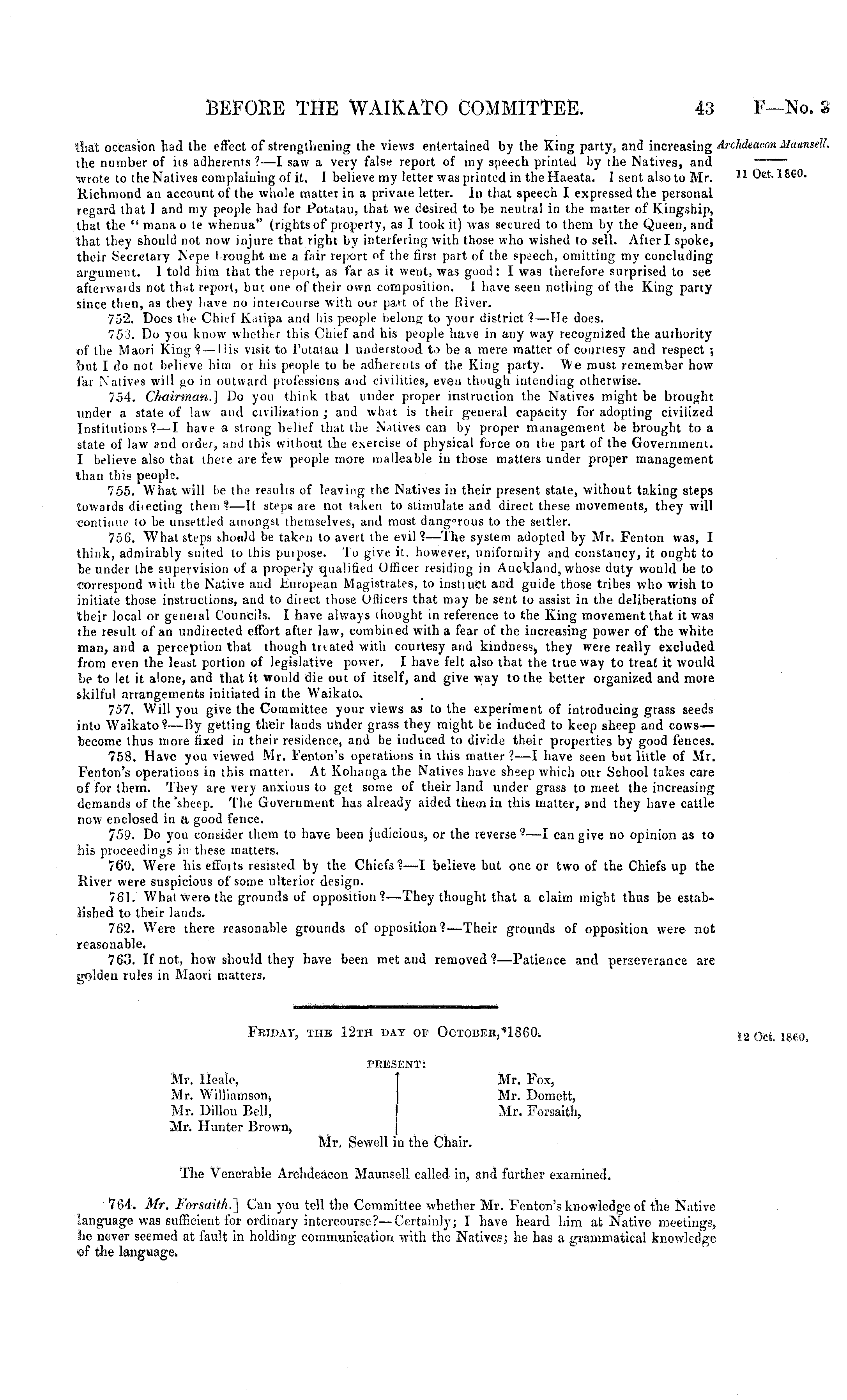 Friday, the 12th day of October,MB6o, PRESENT: Mr. Heale, Mr. Fox, Mr. Williamson, Mr. Domett, Mr. Dillon Bell, Mr. Forsaith, Mr. Hunter Brown, Mr, Sewell in the Chair. The Venerable Archdeacon Maunsell called in, and further examined. 764. Mr. Forsaith.] Can you tell the Committee whether Mr. Fenton's knowledge of the Native language was sufficient for ordinary intercourse?— Certainly; I have heard him at Native meetings, he never seemed at fault in holding communication with the Natives; he has a grammatical knowledge ©f the language,