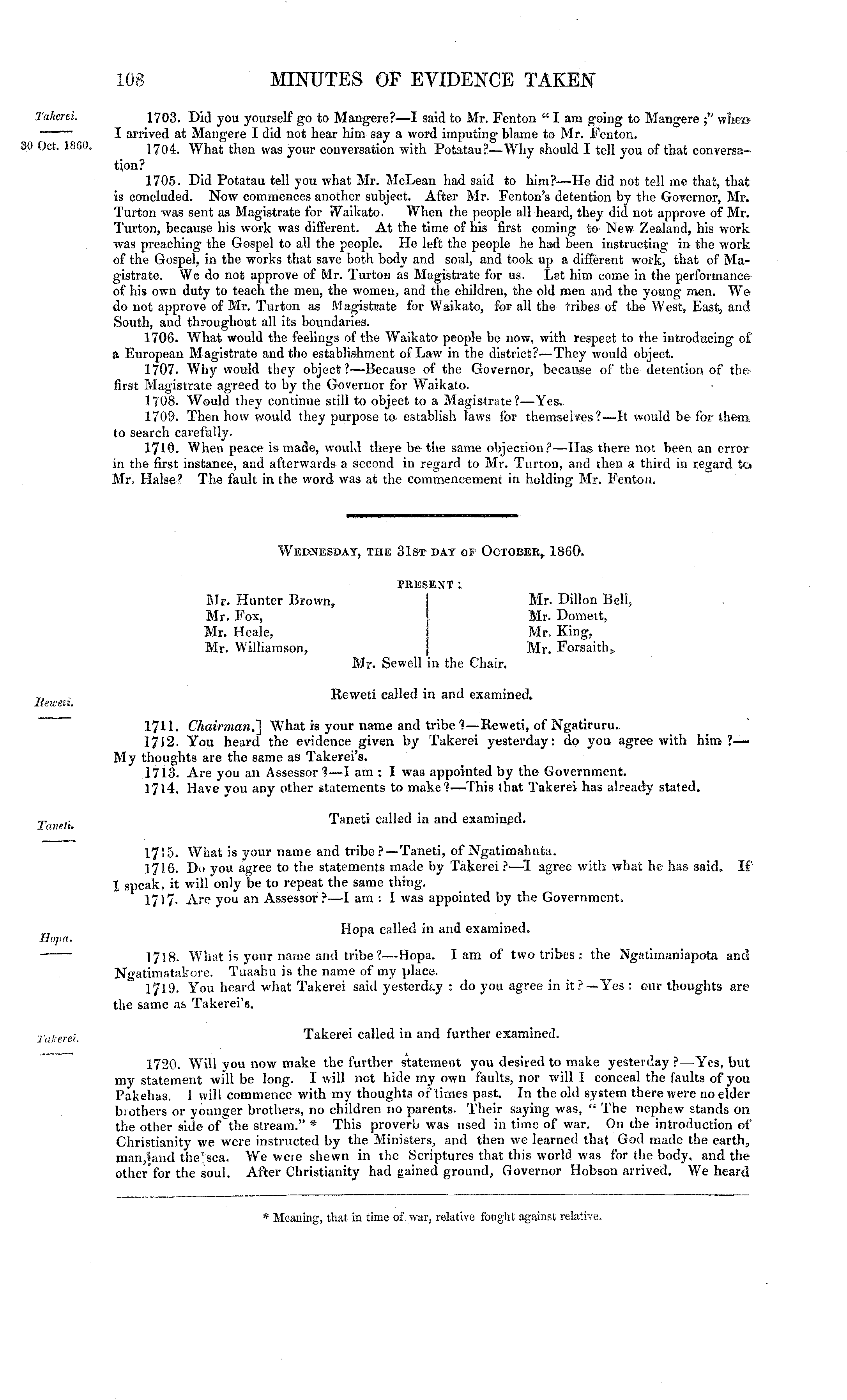 Wednesday, the 31st day op October, 1860PRESENT :. Mr. Hunter Brown, Mr. Dillon Bell, Mr. Fox, Mr. Domett, Mr. Heale, Mr. King, Mr. Williamson, Mr. Mr. Sewell in the Chair. Reweti called in and examined. 1711. Chairman.] What is your name and tribe ?—Reweti, of Ngatiruru. 1712. You heard the evidence given by Takerei yesterday: do you agree with hina ?— My thoughts are the same as Takerei's. 1718. Are you an Assessor I —l am : I was appointed by the Government. 1714. Have you any other statements to make?— This that Takerei has already stated. Taneti called in and examined. 1715. What is your name and tribe ?—Taneti, of Ngatimahuta. 1716. Do you agree to the statements made by Takerei ?—I agree with what he has said. If I speak, it will only be to repeat the same thing. 1717. Are you an Assessor ?—I am -. I was appointed by the Government. Hopa called in and examined. 1718. What is your name and tribe ?—Hopa. lam of two tribes : the Ngatimaniapota and Ngatimatakore. Tuaahu is the name of my place. 1719. You heard what Takerei said yesterday :do you agree in it?— Yes : our thoughts are the same as Takerei's. Takerei called in and further examined. 1720. Will you now make the further statement you desired to make yesterday ?—Yes, but my statement will be long. I will not hide my own faults, nor will I conceal the faults of you Pakehas. 1 will commence with my thoughts of times past. In the old system there were no elder brothers or younger brothers, no children no parents. Their saying was, " The nephew stands on the other side of the stream." * This proverb was used in time of war. On the introduction of Christianity we were instructed by the Ministers, and then we learned that God made the earth, man,sand the'sea. We weie shewn in the Scriptures that this world was for the body, and the other'for the soul. After Christianity had gained ground, Governor Hobson arrived. We heard