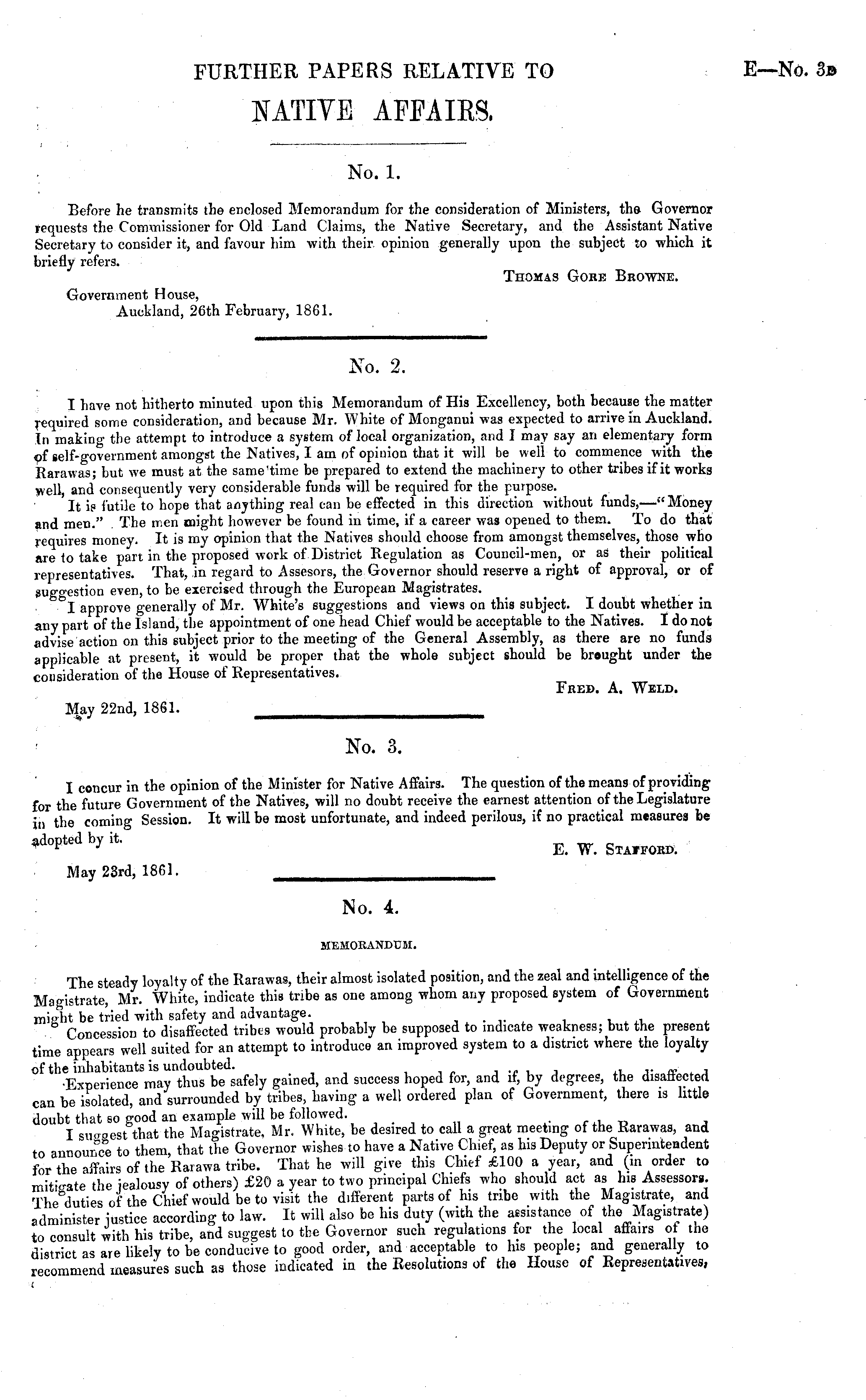 No. 1. Before he transmits the enclosed Memorandum for the consideration of Ministers, tho Governor requests the Commissioner for Old Land Claims, the Native Secretary, and the Assistant Native Secretary to consider it, and favour him with their opinion generally upon the subject to which it briefly refers. Thomas Gore Browne. Government House, Auckland, 26th February, 1861.