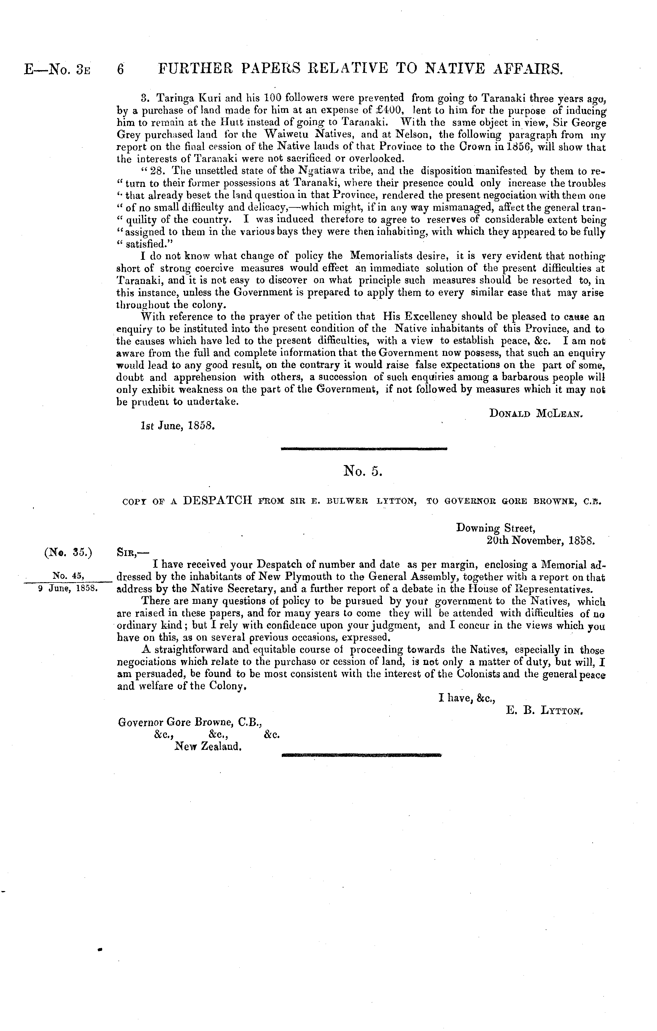 No. 5. copy of a DESPATCH from sir c. bulwer lytton, to governor gore browne, c.b. Downing Street, 20th November, 1858. Sir — I have received your Despatch of number and date as per margin, enclosing a Memorial addressed by the inhabitants of New Plymouth to the General Assembly, together with a report on that address by the Native Secretary, and a further report of a debate in the House of Representatives. There are many questions of policy to be pursued by your government to the Natives, which are raised in these papers, and for many years to come they will be attended with difficulties of no ordinary kind; but I rely with confidence upon your judgment, and I concur in the views which you have on this, as on several previous occasions, expressed. A straightforward and equitable course of proceeding towards the Natives, especially in those negociations which relate to the purchase or cession of land, is not only a matter of duty, but will, I am persuaded, be found to be most consistent with the interest of the Colonists and the general peace and welfare of the Colony, I have, &c, E. B. Lytton. Governor Gore Browne, C.8., &c, &c,, &c. New Zealand.