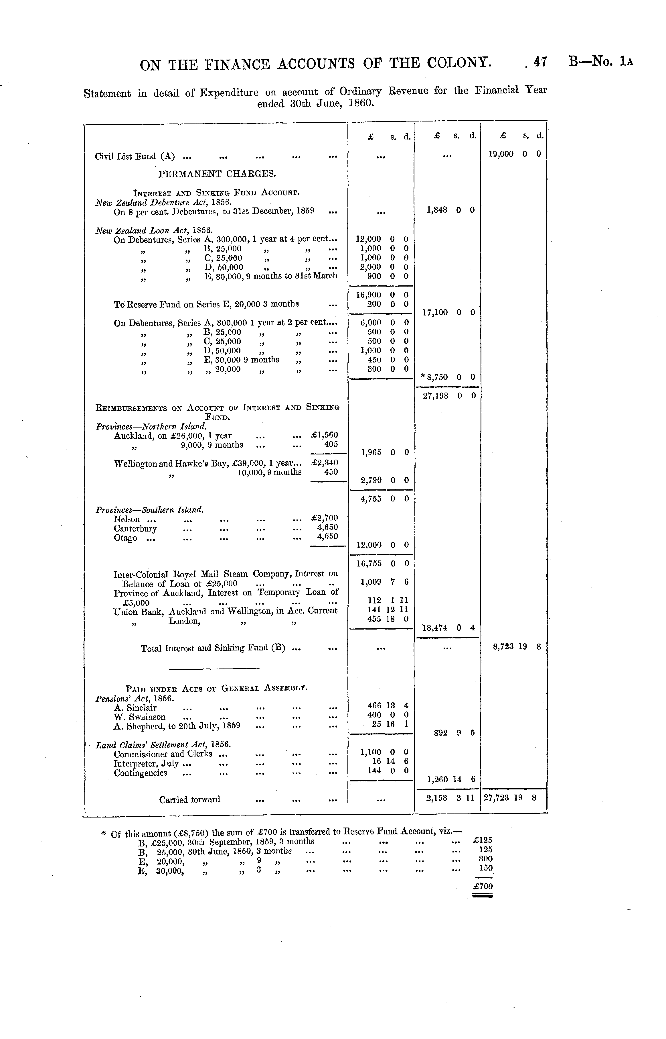 £ s. d. £ s. d. £ S. d. 19,000 0 0 Civil List Fund (A) ... PERMANENT CHARGES. Interest and Sinking Fund Account. New Zealand Debenture Act, 1856. On 8 per cent. Debentures, to 31st December, 1859 1,348 0 0 New Zealand Loan Act, 1856. On Debentures, Series A, 300,000, 1 year at 4 per cent... „ „ B, 25,000 „ „ C, 25,000 „ „ D, 50,000 „ „ E, 30,000, 9 months to 31st March 12,000 0 0 1,000 0 0 1,000 0 0 2,000 0 0 900 0 0 To Reserve Fund on Scries E, 20,000 3 months 16,900 0 0 200 0 0 On Debentures, Series A, 300,000 1 year at 2 per cent.... „ „ B, 25,000 „ „ C, 25,000 „ „ D, 50,000 „ „ E, 30,000 9 months „ „ „ 20,000 6,000 0 0 500 0 0 500 0 0 1,000 0 0 450 0 0 300 0 0 17,100 0 0 * 8,750 0 0 27,198 0 0 Reimbursements on Account of Interest and Sinking Fund. Provinces — Northern Island. Auckland, on £26,000, 1 year ... ... £1,560 „ 9,000, 9 months ... ... 405 Wellington and Hawke's Bay, £39,000, 1 year... £2,340 „ 10,000,9 months 450 1,965 0 0 Provinces — Southern Island. Nelson £2,700 Canterbury ... ... ... ■•• 4,650 Otago 4,650 2,790 0 0 4,755 0 0 12,000 0 0 Inter-Colonial Royal Mail Steam Company, Interest on Balance of Loan of £25,000 Province of Auckland, Interest on Temporary Loan of £5,000 Union Bank, Auckland and Wellington, in Ace. Current „ London, „ „ 16,755 0 0 1,009 7 6 112 1 11 141 12 11 455 18 0 18,474 0 4 8,723 19 8 Total Interest and Sinking Fund (B) ... Paid under Acts of General Assembly. Pensions' Act, 1856. A. Sinclair W. Swainson A. Shephera, to 20th July, 1859 466 13 4 400 0 0 25 16 1 Land Claims' Settlement Act, 1856. Commissioner and Clerks ... Interpreter, July ... Contingencies 1,100 0 0 16 14 6 144 0 0 892 9 5 1,260 14 6 Carried forward 2,153 3 11 27,723 19 8 * Of this amount (£8,750) the sum of £700 is transferred to Reserve Fund Account, viz.— B, £25,000, 30th September, 1859, 3 months B, 25,000, 30th June, 1860, 3 months E, 20,000, „ „ 9 „ •■• E, 30,000, „ „ 3 „ ... £ 25 25 !()0 50 £ '00