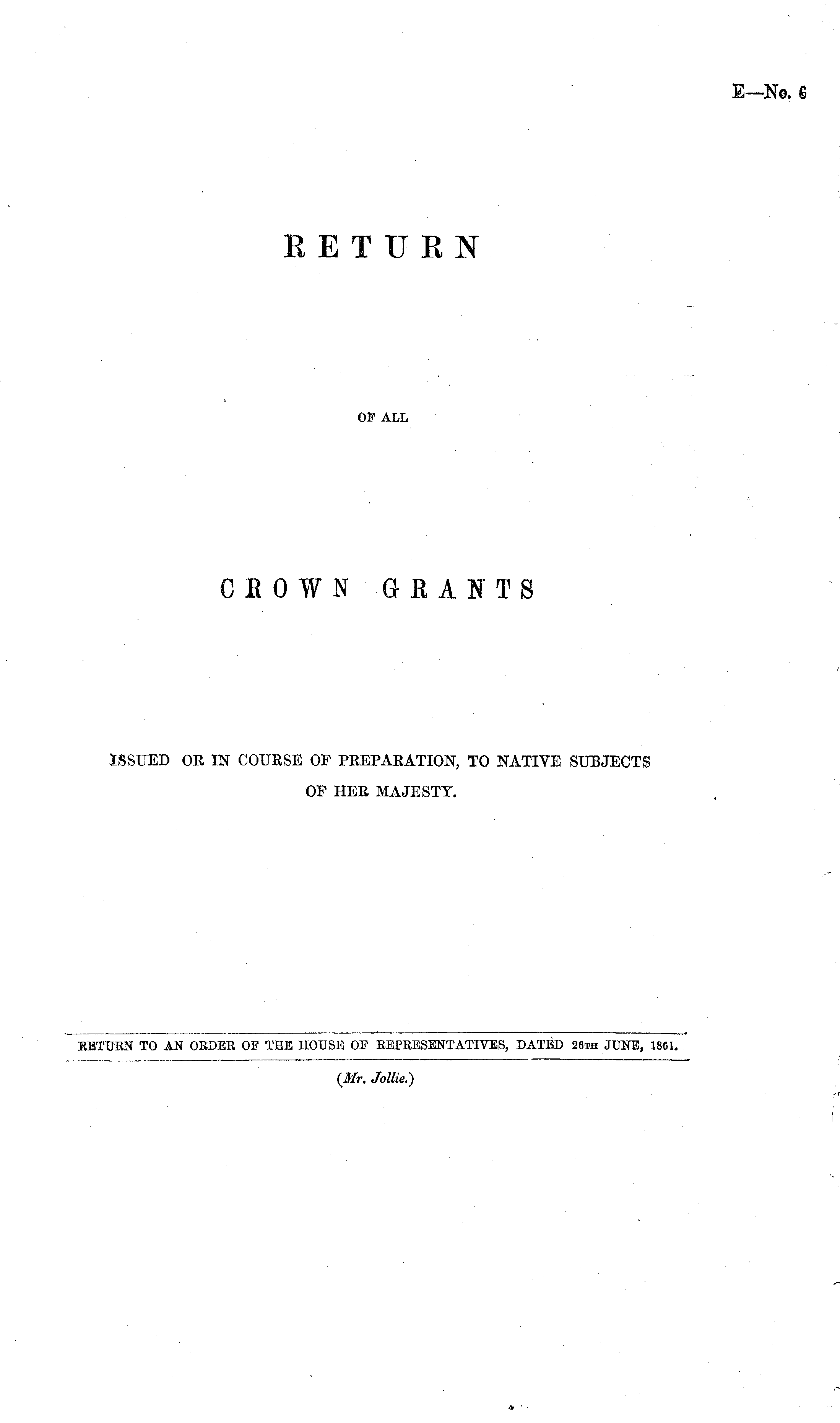 RETURN OF ALL CROWN GRANTS ISSUED OR IN COURSE OF PREPARATION, TO NATIVE SUBJECTS OF HER MAJESTY.