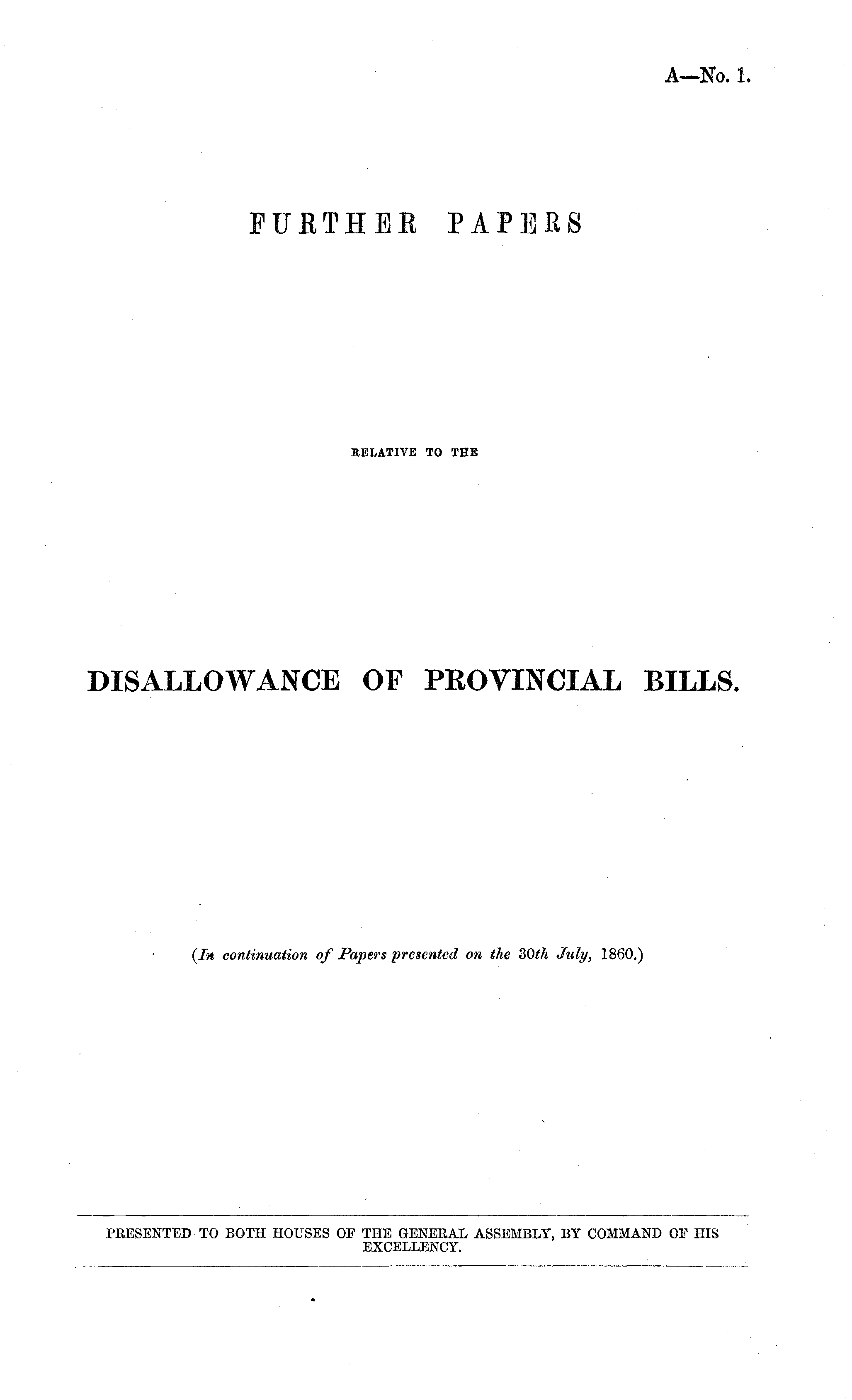 FURTHER PAPERS RELATIVE TO THE DISALLOWANCE OF PROVINCIAL BILLS. (In continuation of Papers presented on the 30th July, 1860.)
