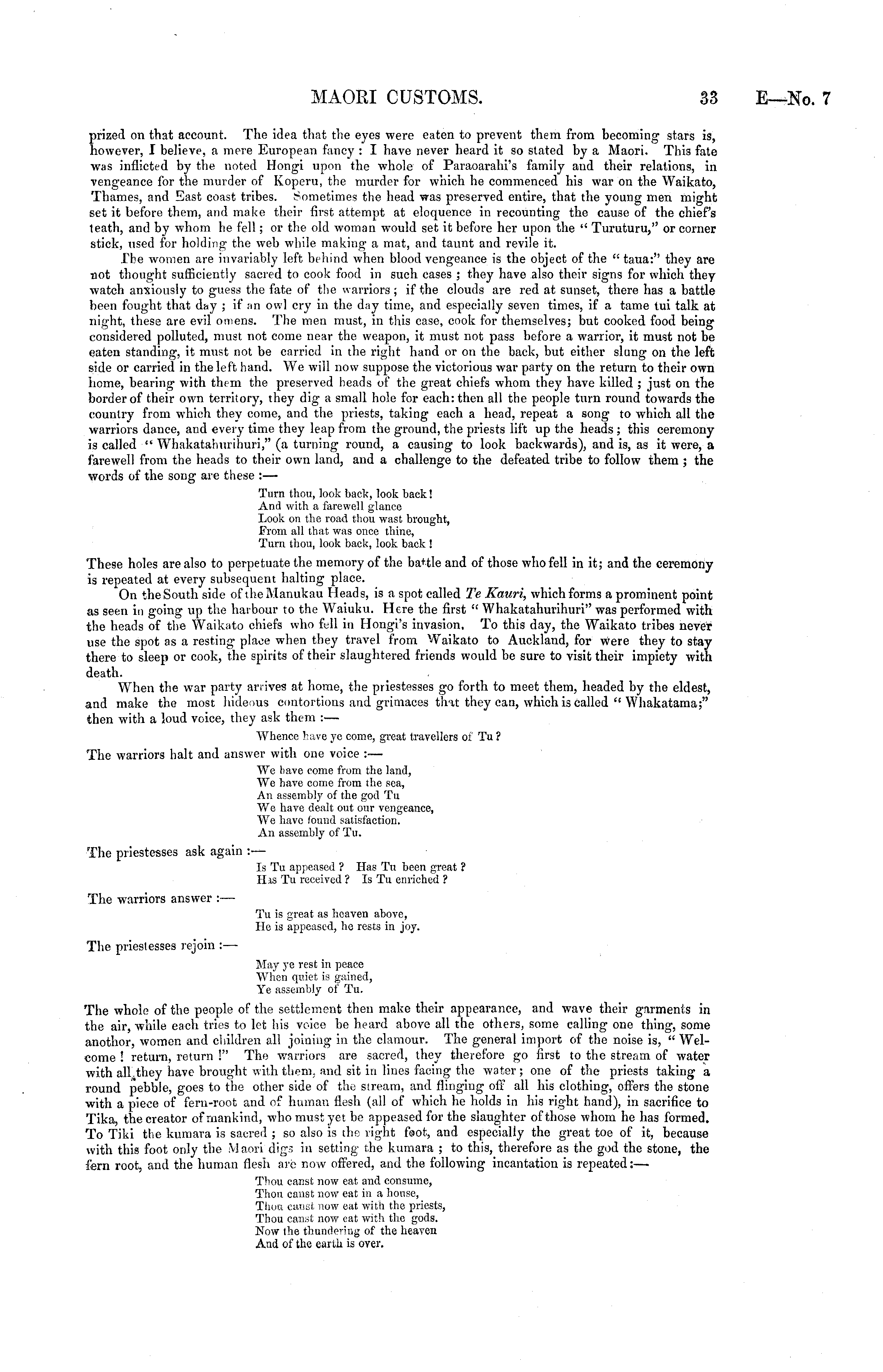 MAORI CUSTOMS. prized on that account. The idea that the eyes were eaten to prevent them from becoming stars is, however, I believe, a mere European fancy : I have never heard it so stated by a Maori. Thi3 fate was inflicted by the noted Hongi upon the whole of Paraoarahi's family and their relations, in vengeance for the murder of Koperu, the murder for which he commenced his war on the Waikato, Thames, and East coast tribes. Sometimes the head was preserved entire, that the young men might set it before them, and make their first attempt at eloquence in recounting the cause of the chief's teath, and by whom he fell; or the old woman would set it before her upon the " Turuturu," or corner stick, used for holding the web while making a mat, and taunt and revile it. The women are invariably left behind when blood vengeance is the object of the " taua:" they are not thought sufficiently sacred to cook food in such cases ; they have also their signs for which they watch anxiously to guess the fate of the warriors ; if the clouds are red at sunset, there has a battle been fought that day ; if an owl cry in the day time, and especially seven times, if a tame tui talk at night, these are evil omens. The men must, in this case, cook for themselves; but cooked food being considered polluted, must not come near the weapon, it must not pass before a warrior, it must not be eaten standing, it must not be carried in the right hand or on the back, but either slung on the left side or carried in the left hand. We will now suppose the victorious war party on the return to their own home, bearing with them the preserved beads of the great chiefs whom they have killed ; just on the border of their own territory, they dig a small hole for each: then all the people turn round towards the country from which they come, and the priests, taking each a head, repeat a song to which all the warriors dance, and every time they leap from the ground, the priests lift up the heads ; this ceremony is called " Whakatahurihuri," (a turning round, a causing to look backwards), and is, as it were, a farewell from the heads to their own land, and a challenge to the defeated tribe to follow them ; the words of the song are these :— Turn thou, look back, look back! And with a farewell glance Look on the road thou wast brought, Prom all that was once thine, Turn thou, look back, look back ! These holes are also to perpetuate the memory of the ba+tle and of those who fell in it; and the ceremony is repeated at every subsequent halting place. On the South side of the Manukau Heads, is a spot called Te Kauri, which forms a prominent point as seen in going up the harbour to the Waiuku. Here the first " Whakatahurihuri" was performed with the heads of the Waikato chiefs who fell in Hongi's invasion. To this day, the Waikato tribes never use the spot as a resting place when they travel from Waikato to Auckland, for were they to stay there to sleep or cook, the spirits of their slaughtered friends would be sure to visit their impiety with death. When the war party arrives at home, the priestesses go forth to meet them, headed by the eldest, and make the most hideous contortions and grimaces that they can, which is Called " Whakatama;" then with a loud voice, they ask them : — Whence have ye come, great travellers oi Tv ? The warriors halt and answer with one voice :— We have come from the land, We have come from the sea, An assembly of the god Tv We have dealt out our vengeance, We have found satisfaction. An assembly of Tu. The priestesses ask again :— Is Tv appeased ? Has Tv been great ? Has Tv received ? Is Tv enriched ? The warriors answer : — Tv is great as heaven above, He is appeased, he rests in joy. The priestesses rejoin : — May ye rest in peace When quiet is gained, Ye assembly of Tu. The whole of the people of the settlement then make their appearance, and wave their garments in the air, while each tries to let his voice be heard above all the others, some calling one thing, some anothor, women and children all joining in the clamour. The general import of the noise is, " Welcome ! return, return !" The warriors are sacred, they therefore go first to the stream of water with all.they have brought with them, and sit in lines facing the water ; one of the priests taking a round pebble, goes to the other side of the stream, and flinging off all his clothing, offers the stone with a piece of fern-root and of human flesh (all of which he holds in his right hand), in sacrifice to Tika, the creator of mankind, who must yet be appeased for the slaughter of those whom he has formed. To Tiki the kumara is sacred ; so also is the right fsot, and especially the great toe of it, because with this foot only the M aori digs in setting- the kumara ; to this, therefore as the god the stone, the fern root, and the human flesh are now offered, and the following incantation is repeated:— Thou canst now eat and consume, Thou canst now eat in a house, Thou canst now eat with the priests, Thou canst now eat with the gods. Now the thundering of the heaven And of the earth is over.