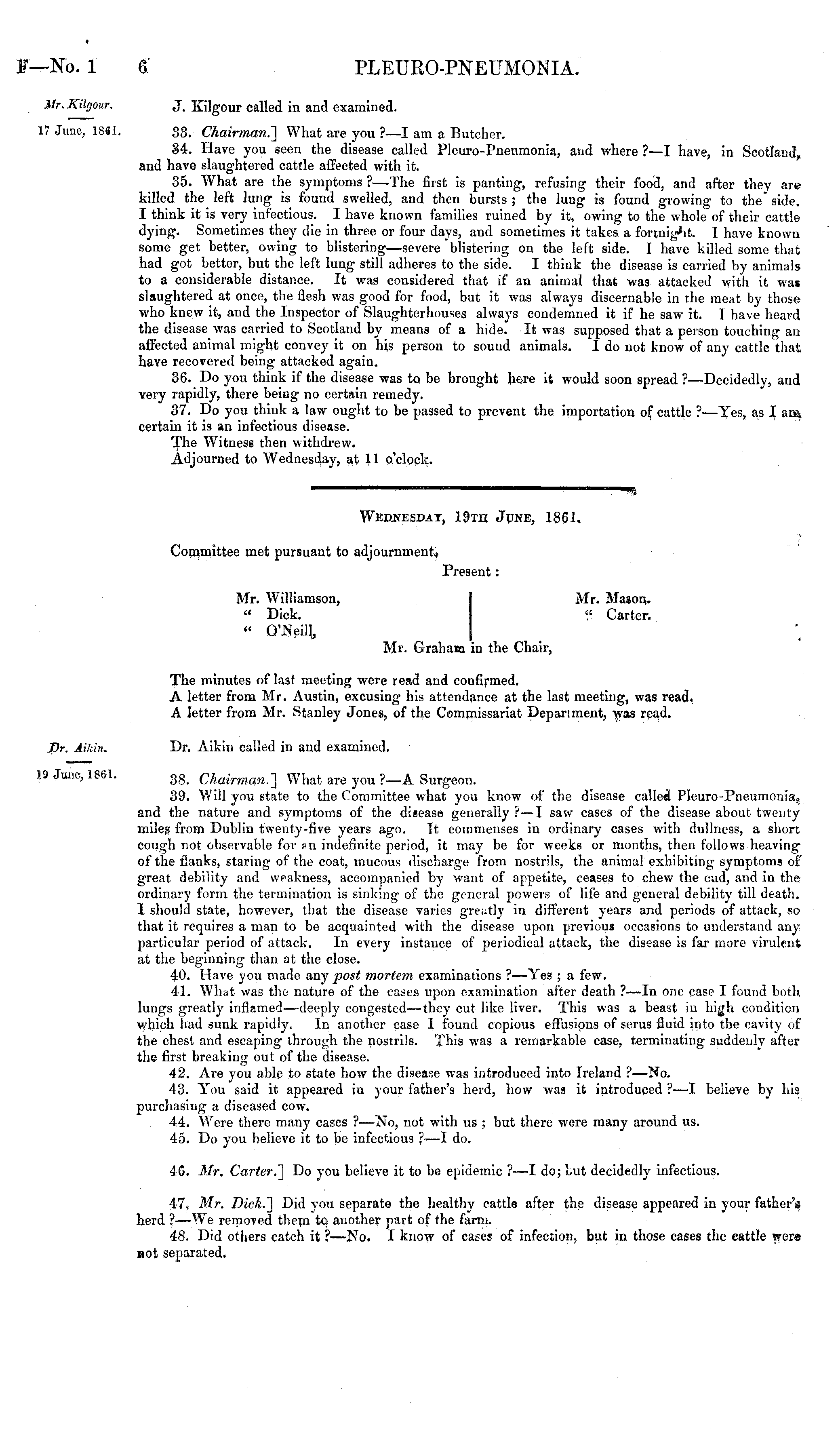 Wednesday, 19th June, 1861. Committee met pursuant to adjournment, Present: Mr. Williamson, Mr. Mason. " Dick. « Carter. " O'Neilh. Mr. Graham in the Chair, The minutes of last meeting were read and confirmed. A letter from Mr. Austin, excusing his attendance at the last meeting, was read. A letter from Mr. Stanley Jones, of the Commissariat Department, was read. Dr. Aikin called in and examined. 38. Chairman.] What are you ?—A Surgeon. 39. Will you state to the Committee what you know of the disease called Pleuro-Pneumonia, and the nature and symptoms of the disease generally ? —I saw cases of the disease about twenty miles from Dublin twenty-five years ago. It commeuses in ordinary cases with dullness, a short cough not observable for an indefinite period, it may be for weeks or months, then follows heaving of the flanks, staring of the coat, mucous discharge from nostrils, the animal exhibiting symptoms of great debility and weakness, accompanied by want of appetite, ceases to chew the cud, and in the ordinary form the termination is sinking of the general powers of life and general debility till death. I should state, however, that the disease varies greatly in different years and periods of attack, so that it requires a man to be acquainted with the disease upon previous occasions to understand any particular period of attack. In every instance of periodical attack, the disease is far more virulent at the beginning than at the close. 40. Have you made any post mortem examinations ?—Yes ; a few. 41. What was the nature of the cases upon examination after death ?—ln one case I found both lungs greatly inflamed—deeply congested—they cut like liver. This was a beast in high condition y/hich had sunk rapidly. In another case I found copious effusions of serus fluid into the cavity of the chest and escaping through the nostrils. This was a remarkable case, terminating suddenly after the first breaking out of the disease. 42. Are you able to state how the disease was introduced into Ireland ?—No. 43. You said it appeared in your father's herd, how was it introduced ?—I believe by his purchasing a diseased cow. 44. Were there many cases ?—No, not with us ; but there were many around us. 45. Do you believe it to be infectious ?•—I do. 46. Mr. Carter.] Do you believe it to be epidemic ?—I do; but decidedly infectious. 47. Mr. Dick.] Did you separate the healthy cattle after the disease appeared in your father's herd ?—We removed them to another part of the farm. 48. Did others catch it ?—No. I know of cases of infection, but in those cases the cattle were not separated.