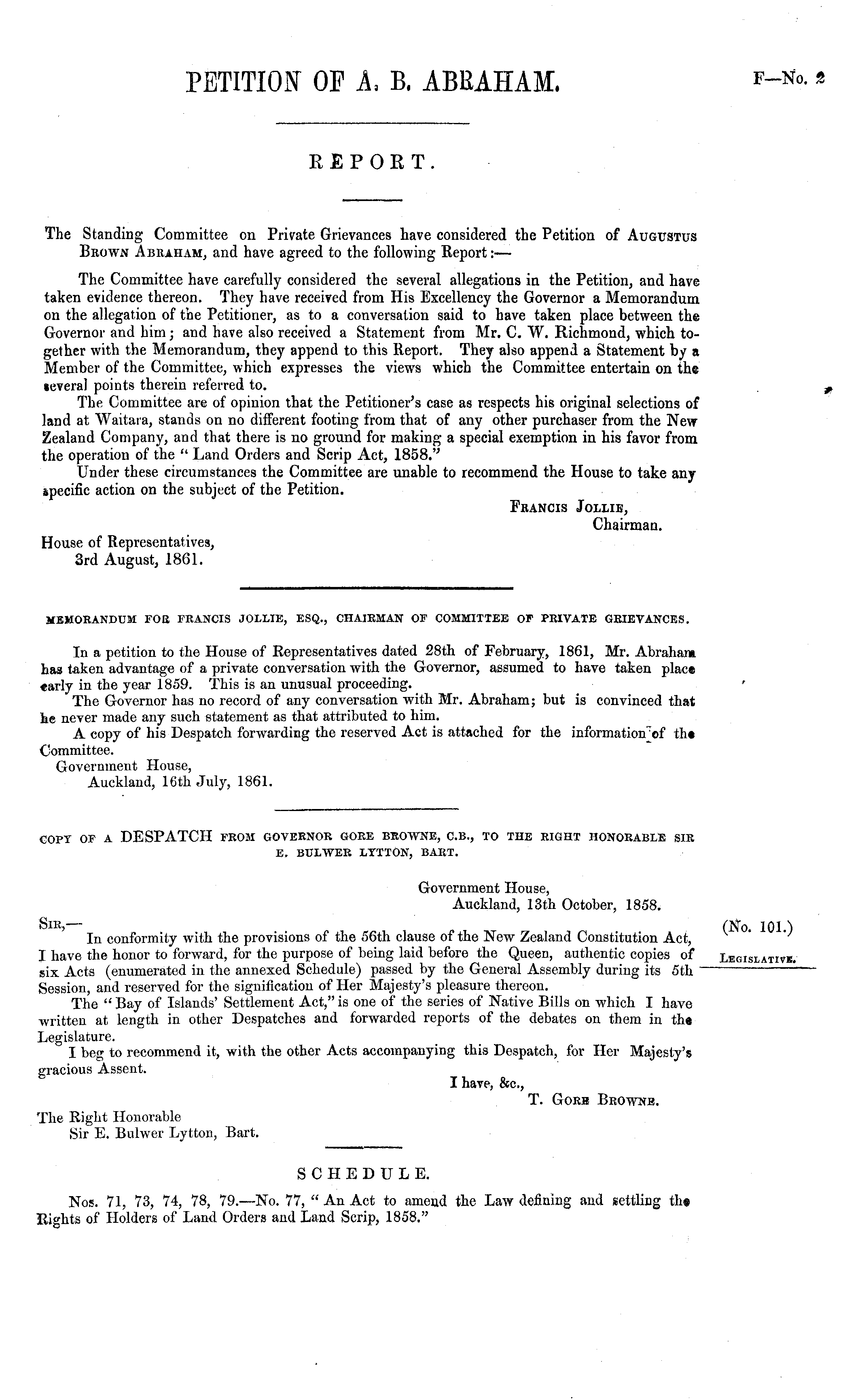 The Standing Committee on Private Grievances have considered the Petition of Augustus Brown Abraham, and have agreed to the following Report:— The Committee have carefully considered the several allegations in the Petition, and have taken evidence thereon. They have received from His Excellency the Governor a Memorandum on the allegation of the Petitioner, as to a conversation said to have taken place between the Governor and him; and have also received a Statement from Mr. C. W. Richmond, which together with the Memorandum, they append to this Report. They also append a Statement by a Member of the Committee, which expresses the views which the Committee entertain on the several points therein referred to. The Committee are of opinion that the Petitioner's case as respects his original selections of land at Waitara, stands on no different footing from that of any other purchaser from the New Zealand Company, and that there is no ground for making a special exemption in his favor from the operation of the " Land Orders and Scrip Act, 1858." Under these circumstances the Committee are unable to recommend the House to take any specific action on the subject of the Petition. Francis Joi_ie, Chairman. House of Representatives, 3rd August, 1861.